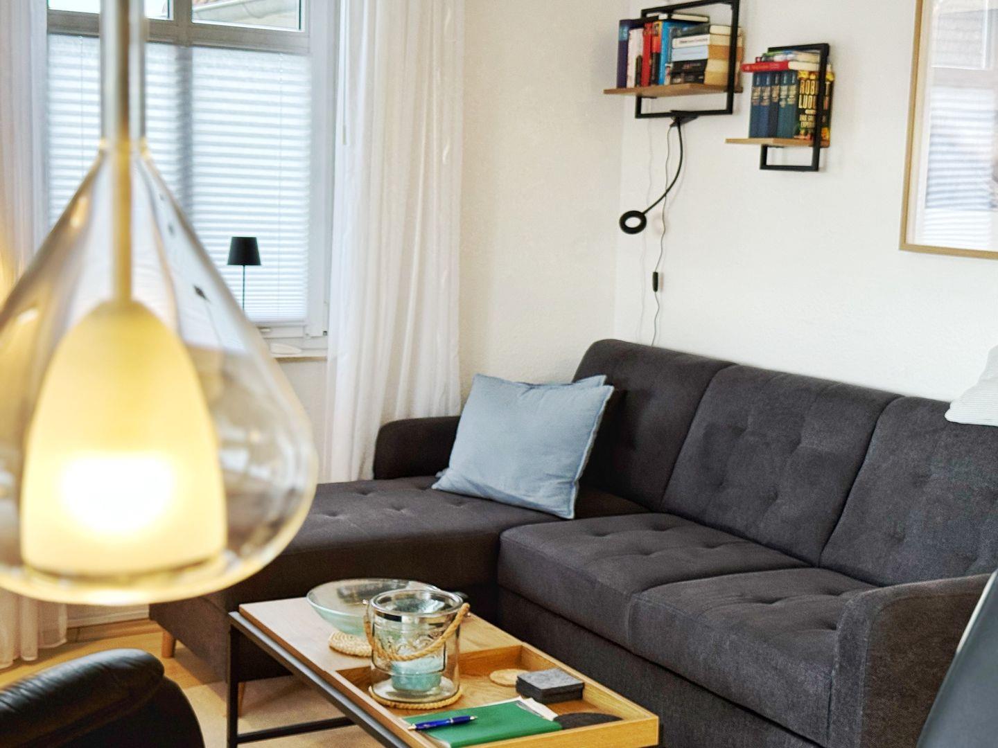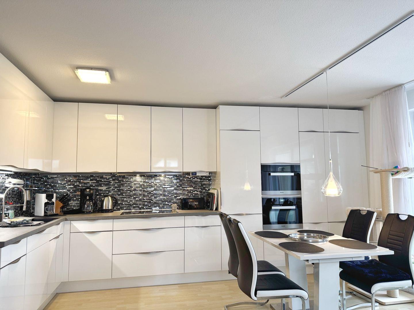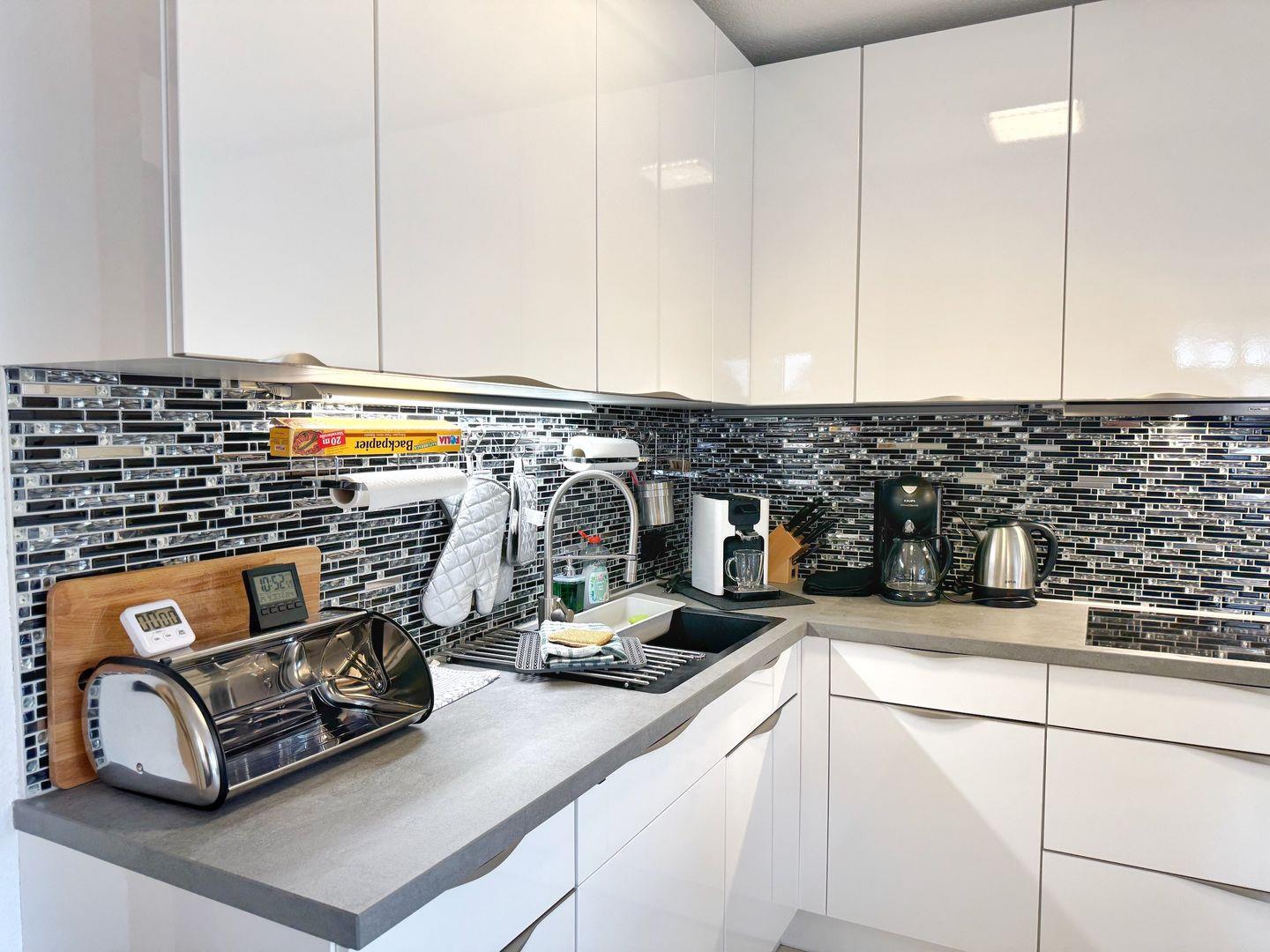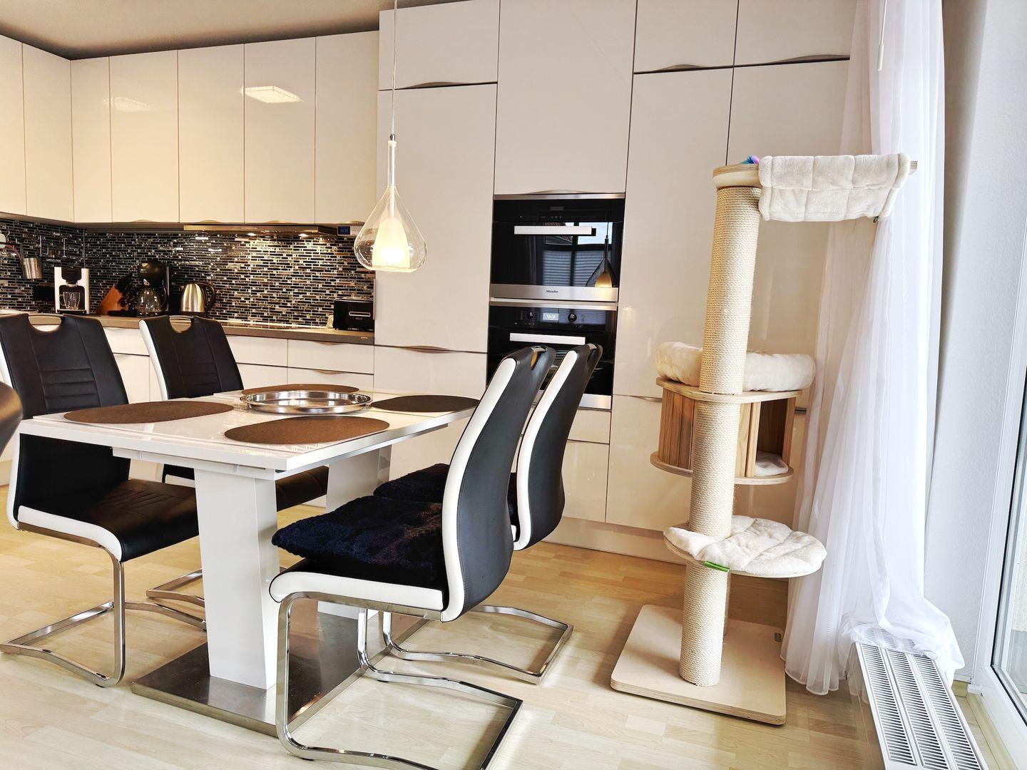 Die Küche ist ausgestattet mit Ceranfeld (Induktionsherd), Backofen mit integrierter Mikrowelle, Dampfgarer, Spülmaschine, Kühlschrank, Filterkaffee-Maschine, Senseo Kaffeepadmaschine, Toaster, Wasserkocher, Heißluftfritteuse, Elektrogrill (Optigrill).
