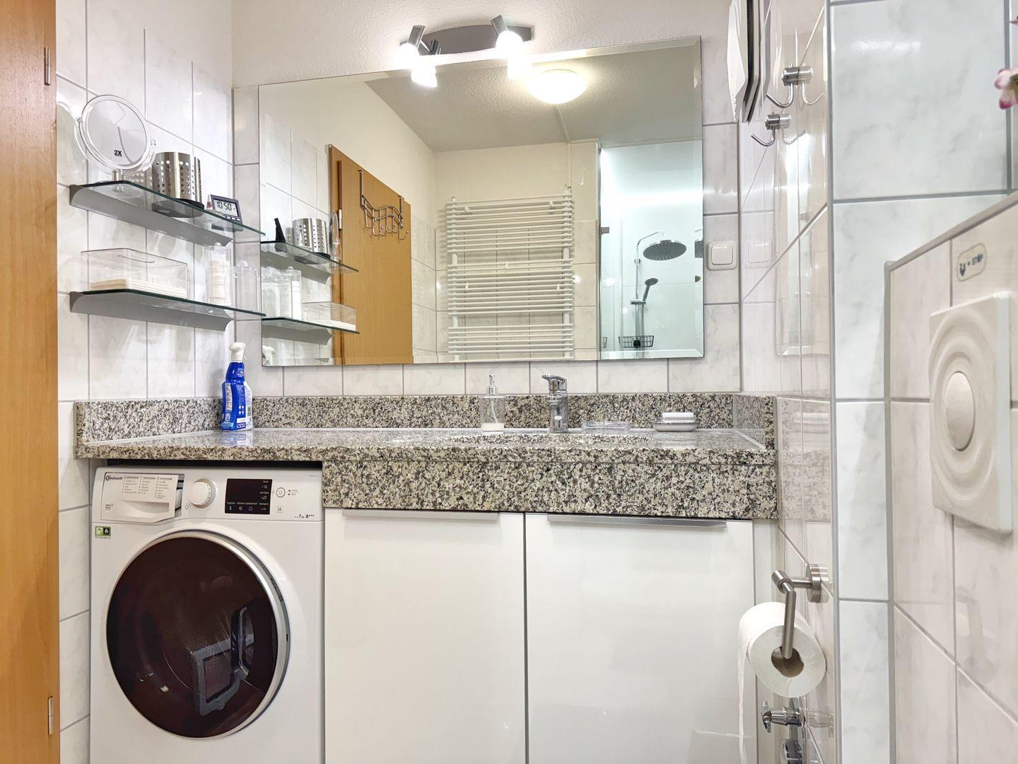 Im modernen Bad stehen eine Waschmaschine, ein Haar Fön und auch ein Schminkspiegel mit 2-fach Vergrößerung zur Verfügung. Die Dusche ist fast ebenerdig mit nur ca. 2 cm Rand, hat einen Haltegriff und einen Sitz.