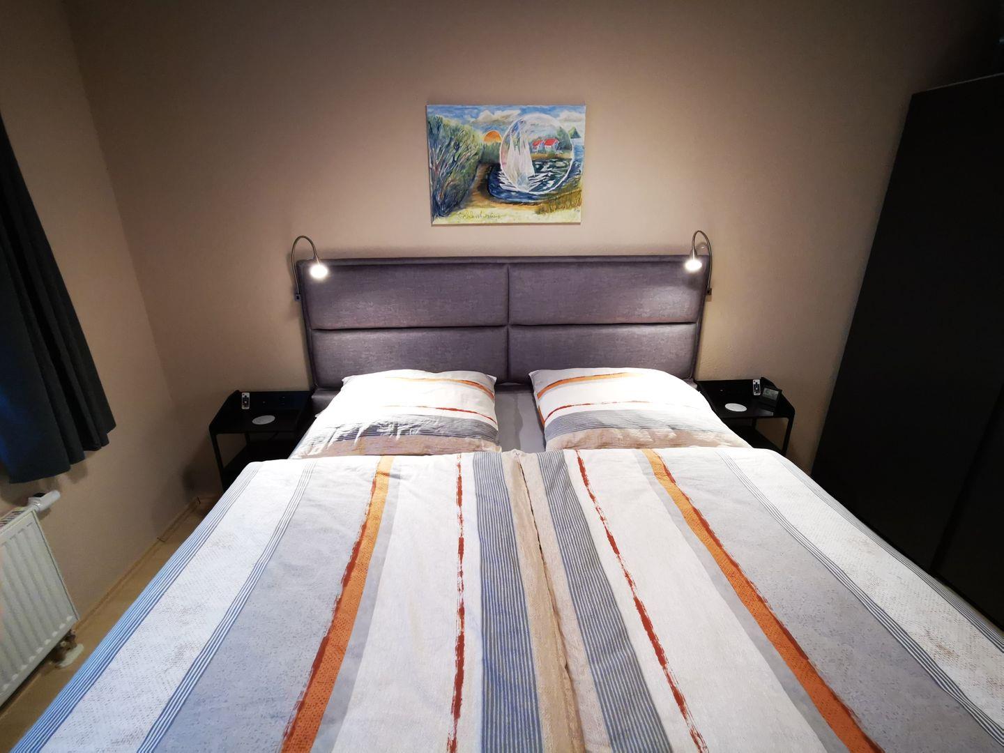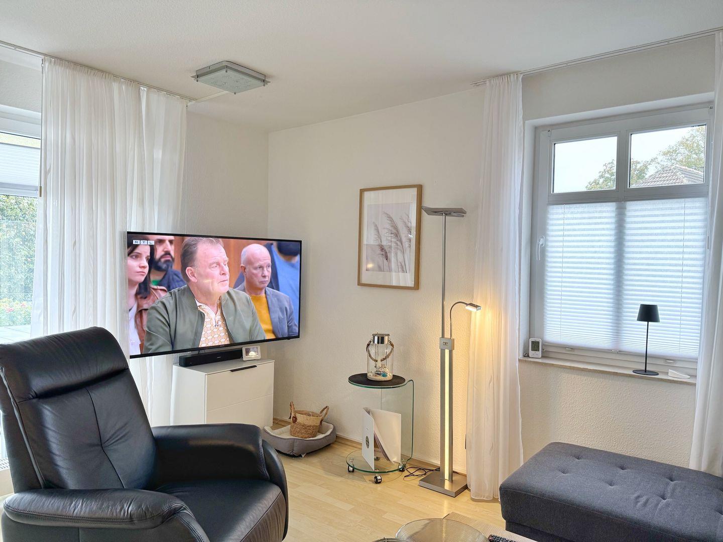 Neben dem Wohnzimmer mit einem großen 70“ Fernseher, einer gemütlichen Sitzecke und einem Fernsehsessel mit Liegefunktion, gibt es zwei separate Schlafzimmer (SZ 1: Doppelbett, SZ 2: Einzelbetten), eine komplett ausgestattete offene Küche und ein Bad.