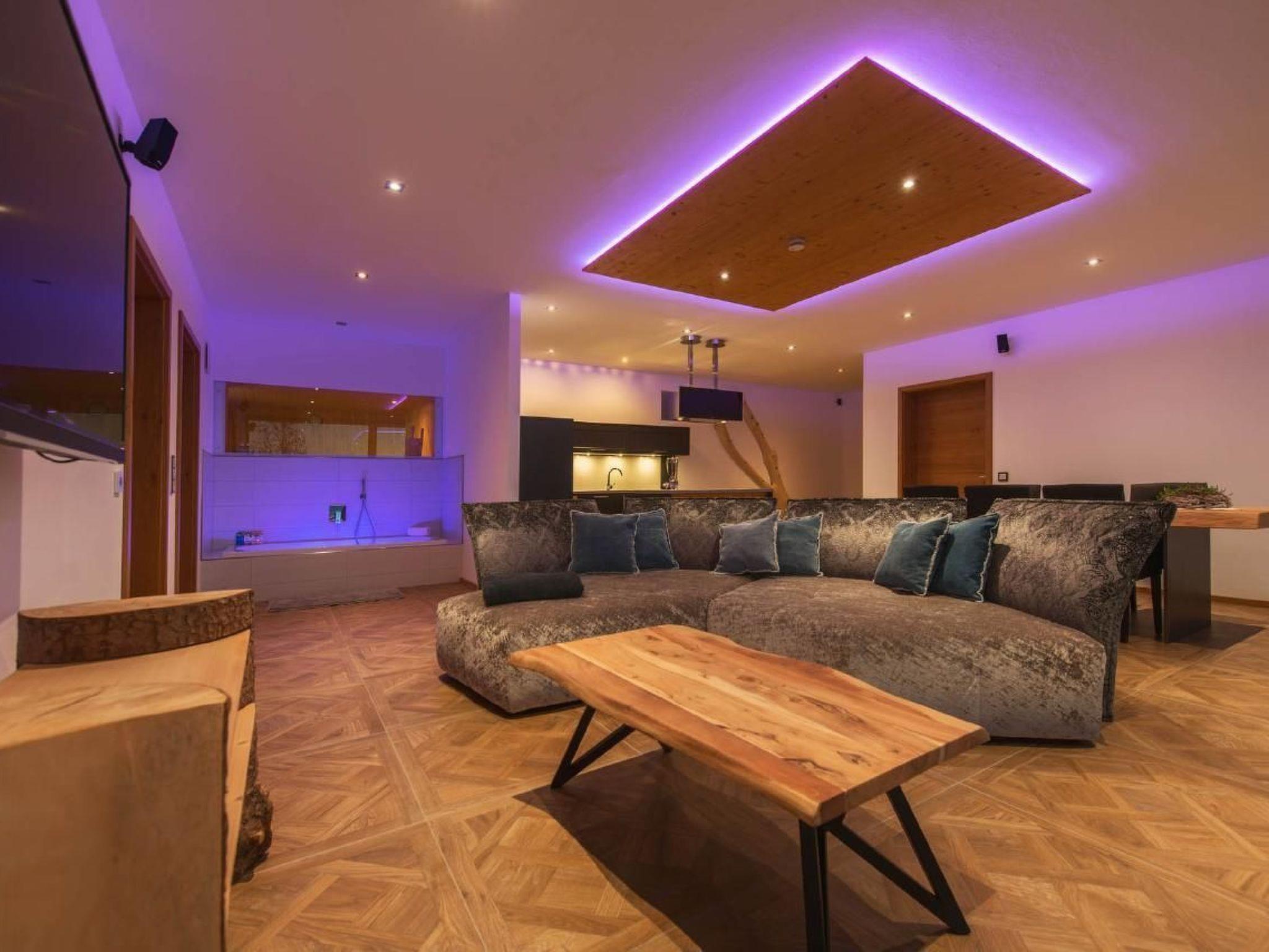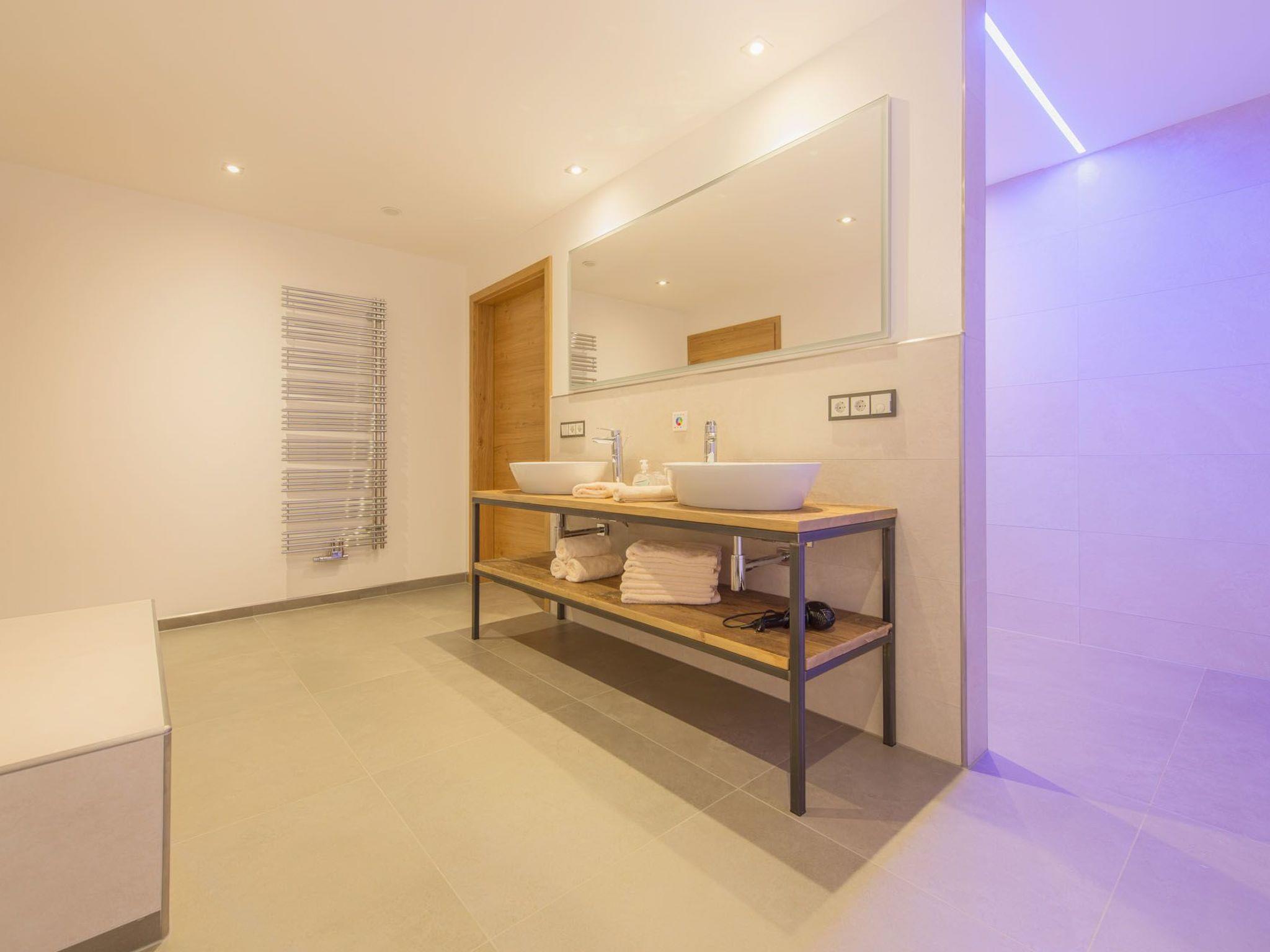 The centrepiece of the house is the living and feel-good area of over 50 square metres, which is equipped with a high-quality kitchen, a handcrafted oak table and a giant sofa. Enjoy Dolby surround sound and the spectacular view through the floor-to-ceiling window. An open whirlpool bath with a view of nature, two bedrooms with their own TV, extra-long double beds and a small gallery for children, as well as a bathroom with heated bench, spacious shower with splash and tropical rain system and direct access to the sauna round off the high-quality living facilities.