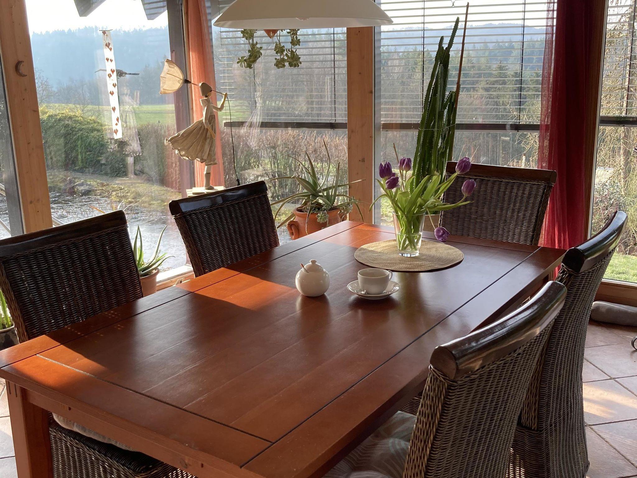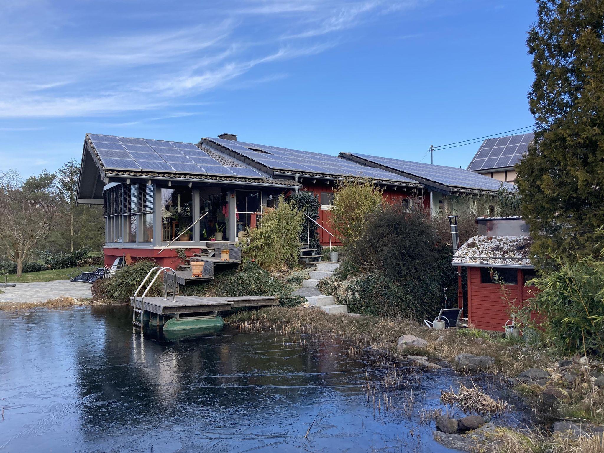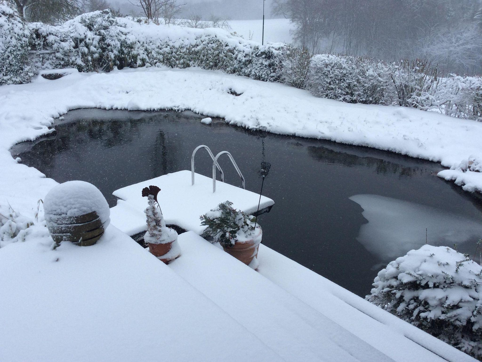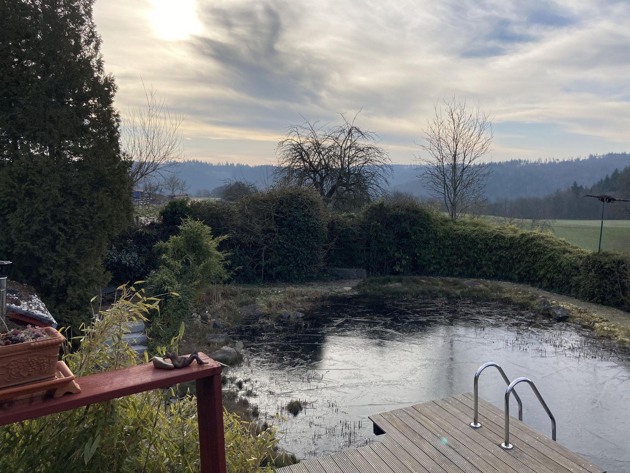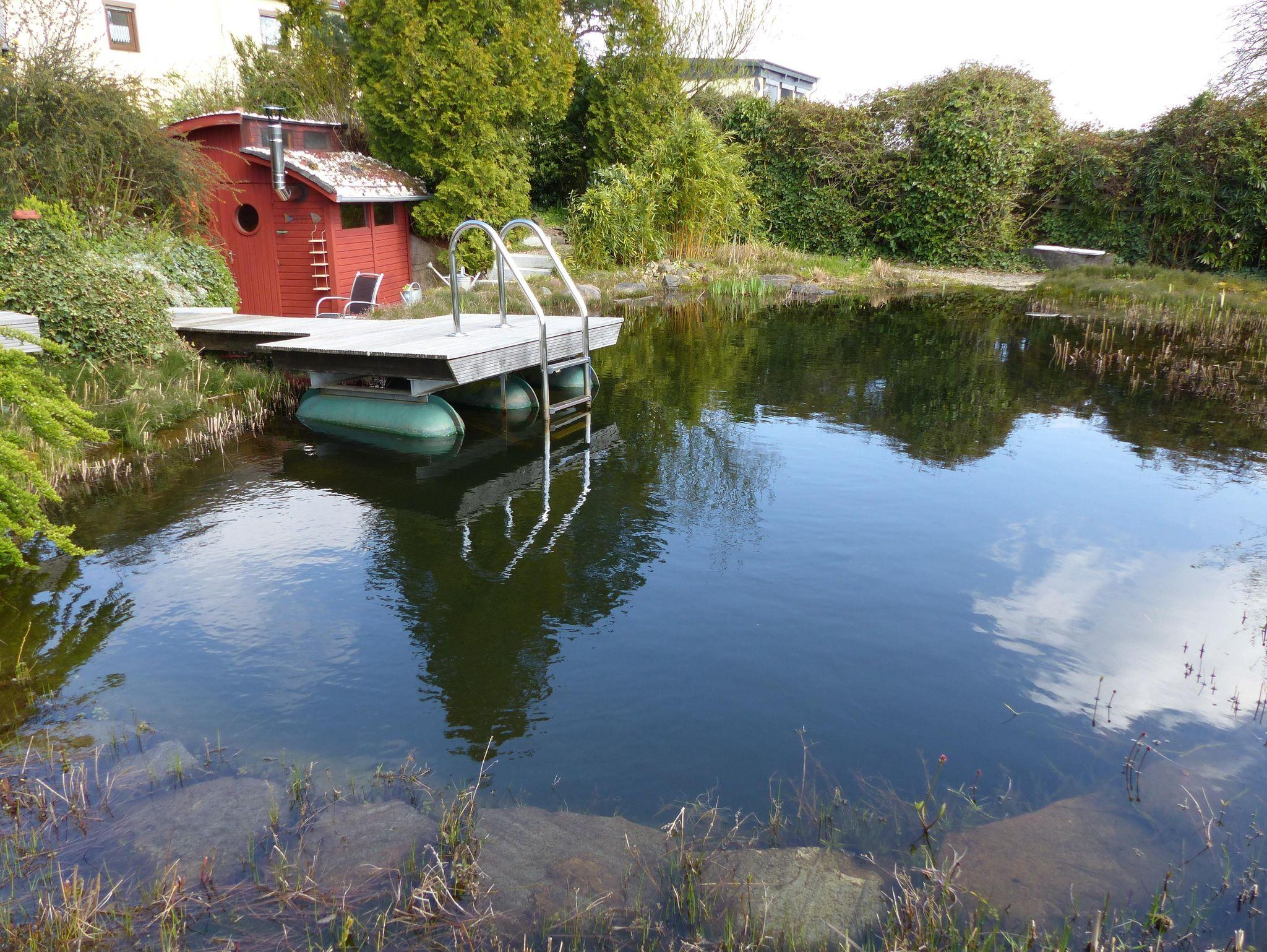 Wir weisen unsere Gäste darauf hin, dass unser Schwimmteich über 2 Meter tief ist; die Benutzung geschieht auf eigene Gefahr. Es ist wunderschön, wenn man nach dem Verlassen der heißen Sauna ins Kühle Nass eintauchen kann. Es gibt in der Abstellkammer neben der Küche Schwimmhilfsmittel aus Schaumstoff, die den Aufenthalt im tiefen Wasser sicherer machen.