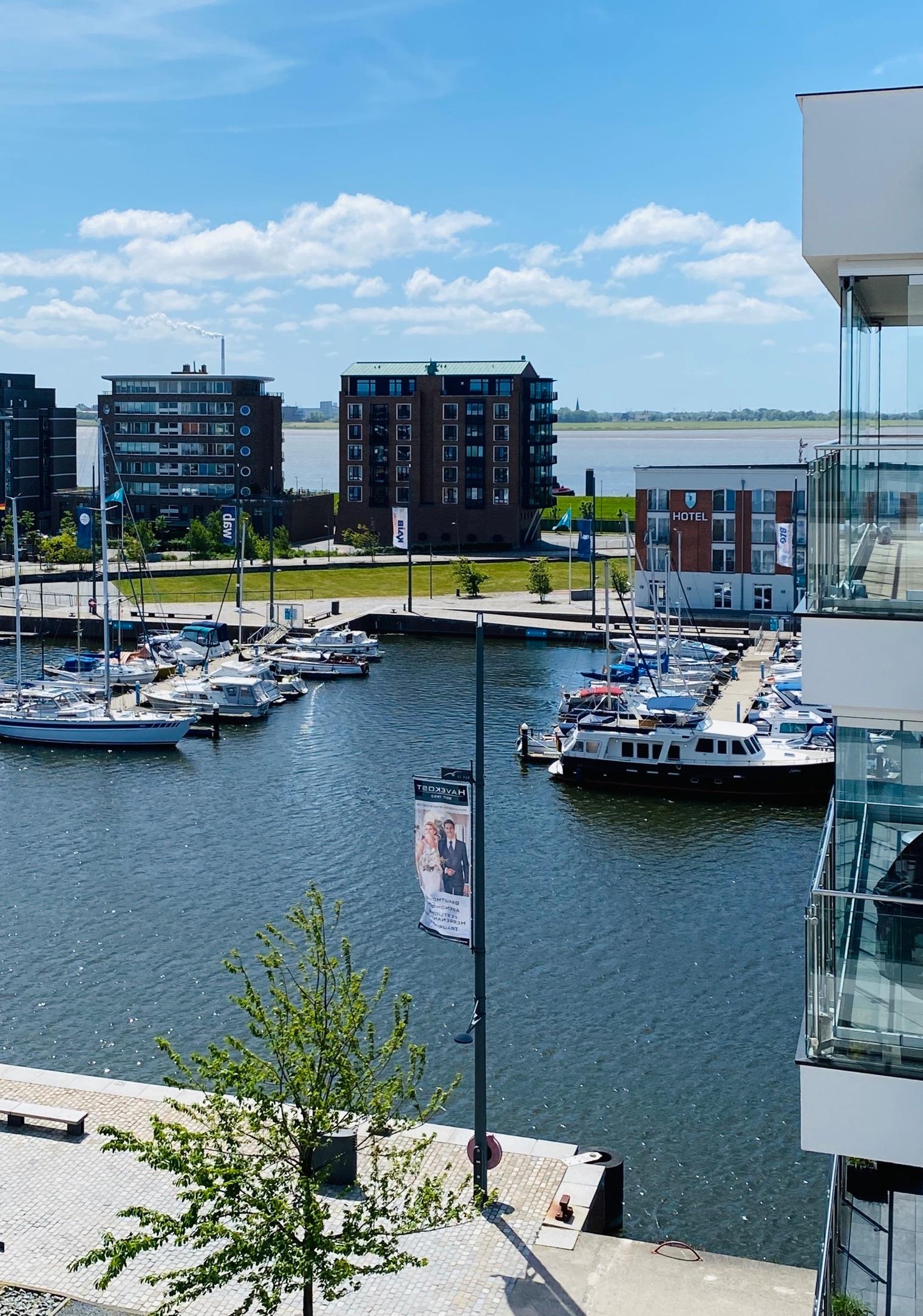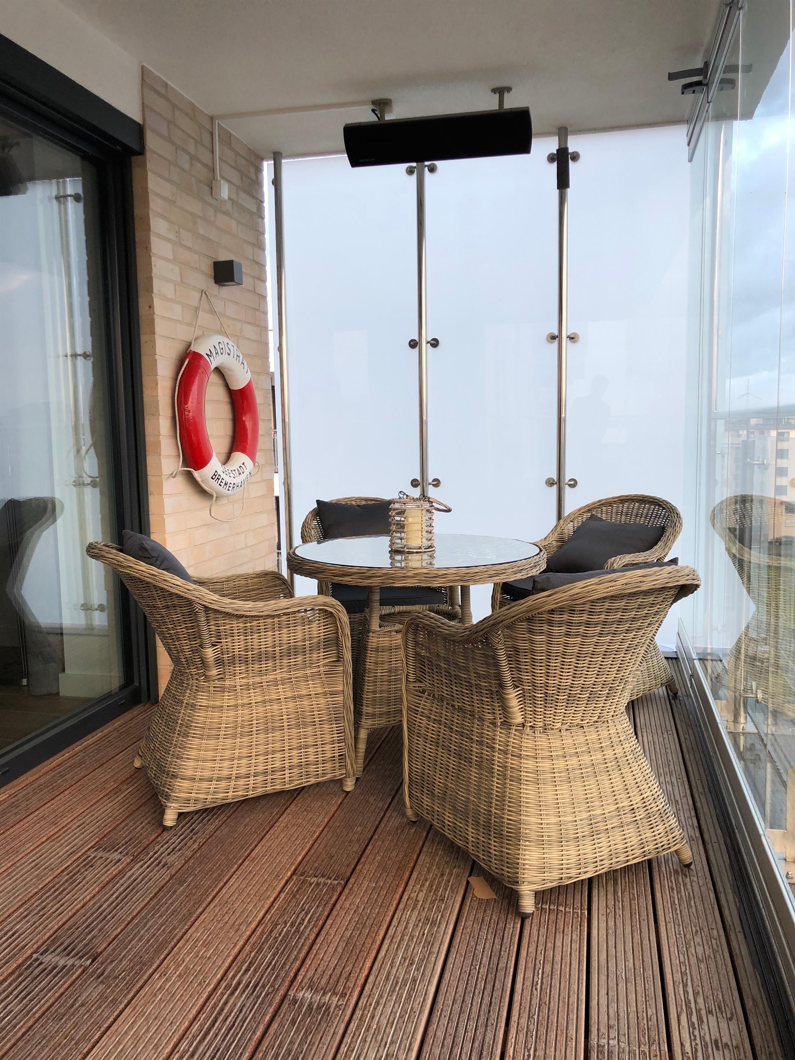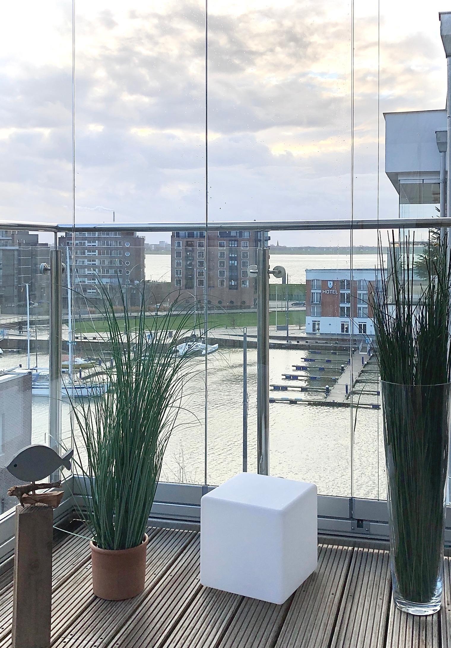 Der 15 m² große Balkon ist mit Schiebeelementen verglast. Er bietet neben der tollen Aussicht auf den Yachthafen und die Weser Entspannungsmöglichkeit auch bei nicht ganz so optimalem Wetter.