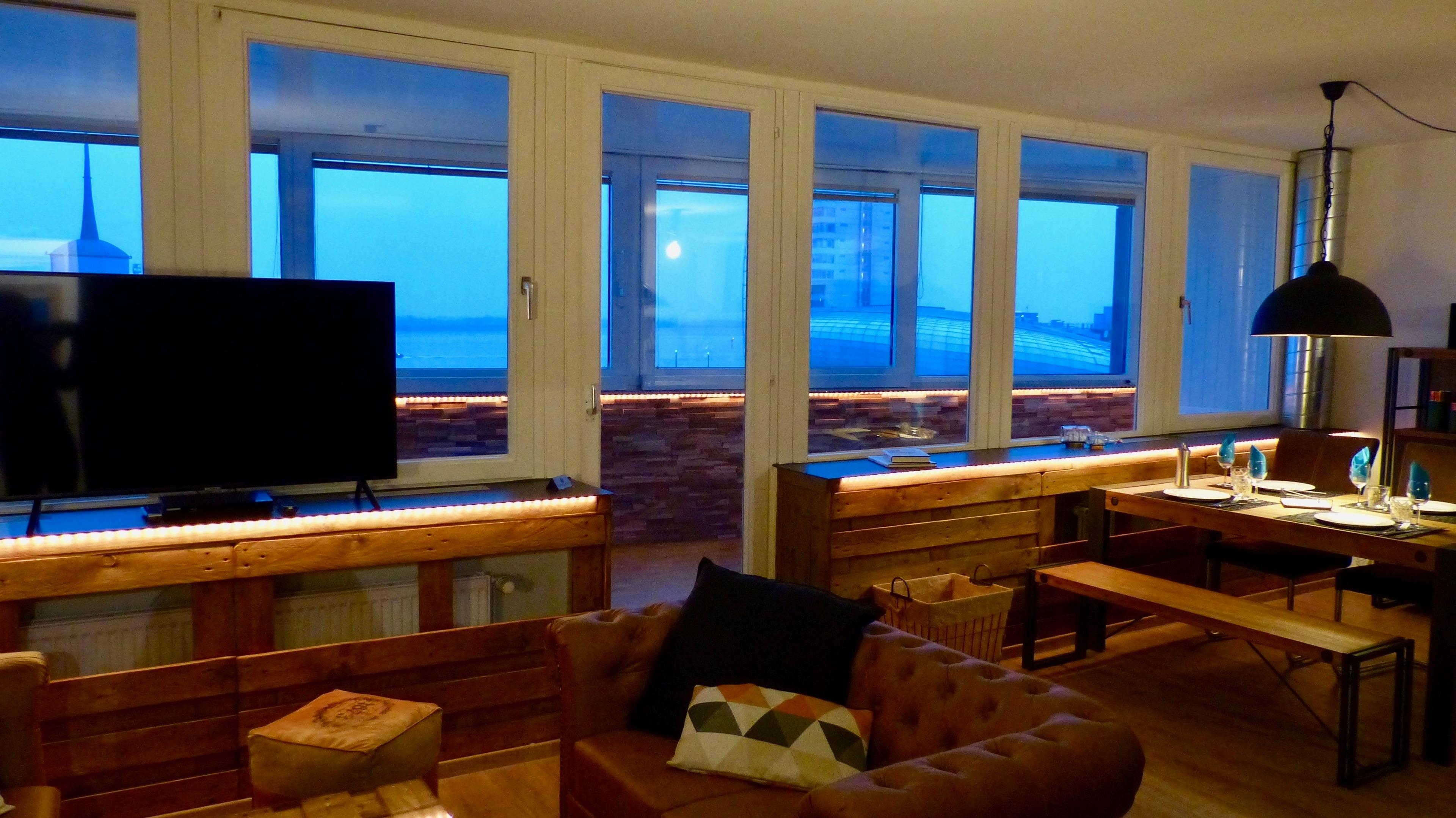 Das Ferienappartement befindet sich im 8. Stock des Columbus Centers, mitten im maritimen Geschehen der Seestadt. Genießen Sie vom großen Wohnzimmer mit Bar den uneingeschränkten Blick auf die Weser, Nordseemündung, Havenwelten und sogar die Containerbrücken mit denen die größten Containerschiffe der Welt be- und entladen werden.