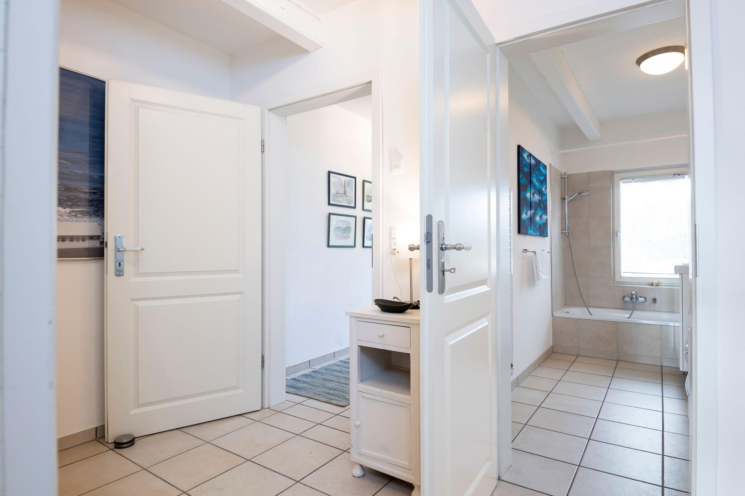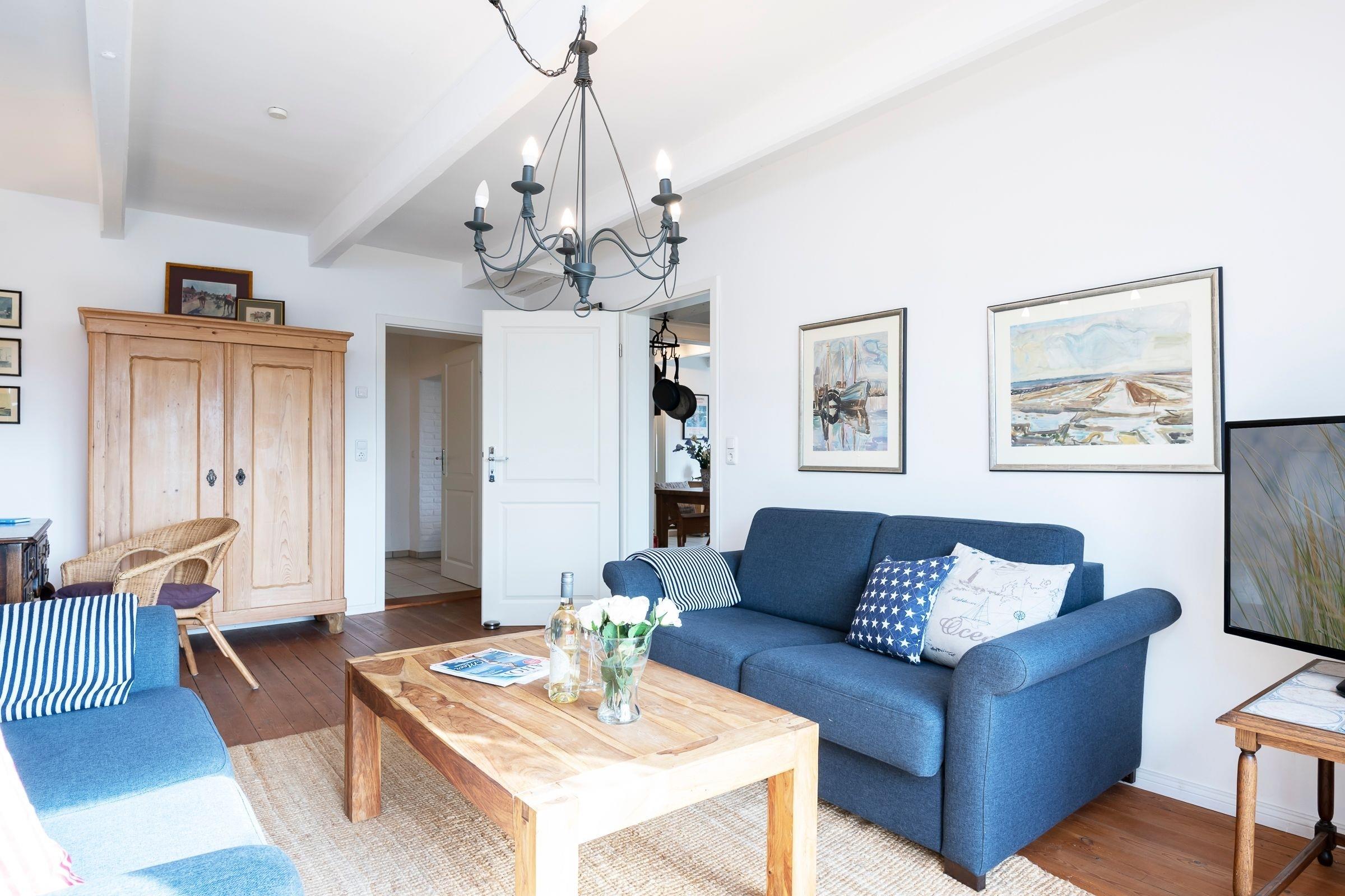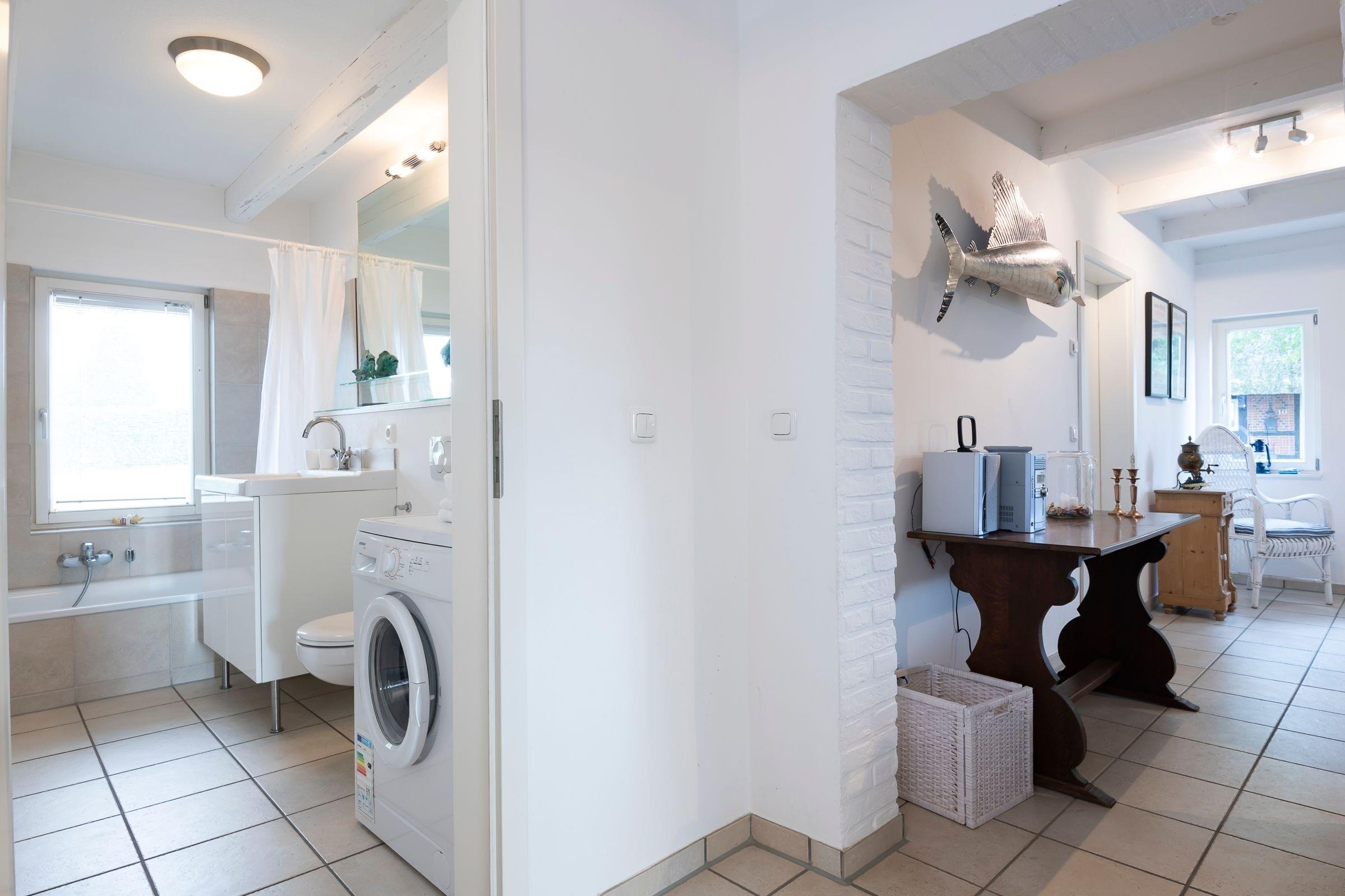 Das gesamte Interieur ist geschmackvoll aufeinander abgestimmt und hochwertig ausgestattet - lichtdurchflutete Räume mit urigem Charme und zeitloser Moderne. Ausblicke über die Felder und auf reetgedeckten Höfe, sowie ein stilvoller Bullerjan-Ofen sorgen für ländliche Idylle, wohlige Wärme und Gemütlichkeit zu jeder Jahreszeit. Die große Wohnküche ist mit vielen tollen Alltagshelfern wie Backofen, Cerankochfeld und Spülmaschine ausgestattet und verfügt über einen gemütlichen Essplatz, von hier aus führt ein direkter Zugang auf die große Terrasse. Das Wohnzimmer ist mit zwei hochwertigen Sofas (davon ein Schlafsofa 125x190 cm geeignet für 1 Erw. oder max. 2 Kinder) und Flatscreen-TV ausgestattet und bietet ebenfalls einen direkten Zugang zur Terrasse. Ein Schlafzimmer ist mit bequemem Doppelbett (2x 80x200 cm) und geräumigem Kleiderschrank möbliert. Das zweite Schlafzimmer umfasst 2 Einzelbetten (je 90x190 cm) und ebenfalls einen Kleiderschrank für Ihre Urlaubsgarderobe. Eins der geschmackvollen Badezimmer begeistert mit Badewanne, beheizbarem Handtuchhalter und Waschmaschine. Das zweite Bad ist ebenso elegant mit beleuchtetem Spiegel, WC und Walk-In-Dusche ausgestattet. Die Fußbodenheizung in beiden Bädern sorgt für eine angenehme Wärme.