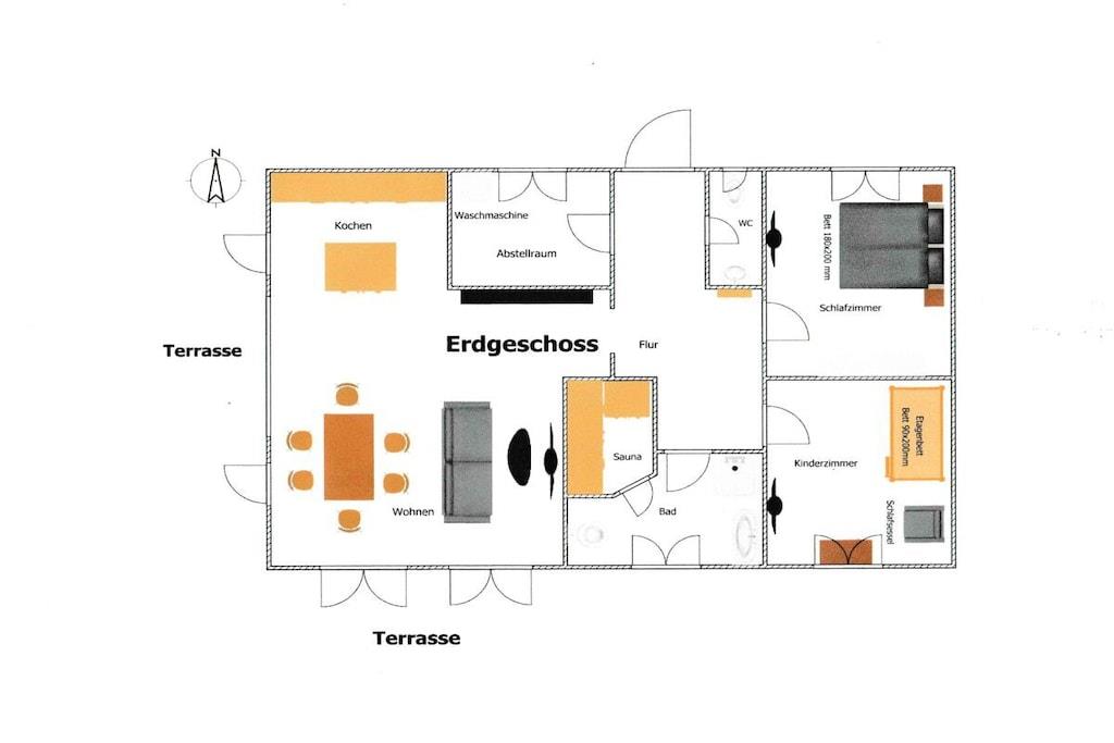 Stueetage: (entre(, ), Køkken(tekøkken, kogeplade, elkedel, brødrister, kaffemaskine, ovn, mikrobølgeovn, opvaskemaskine , køleskab, fryser, varme), stue / spisestue(, , bibliotek, Fjernsyn, spisebord, radio, barnestol), soveværelse(, dobbeltseng, Fjernsyn, insektnet), soveværelse(, bibliotek, enkeltskabsseng, dobbeltseng, køjeseng, Fjernsyn, insektnet), badeværelse(, toilet, sauna, bruser, håndvask, varme, insektnet), guest toilet(toilet, håndvask), pulterkammer(, vaskemaskine, tørreskab)) , , , Internetadgang, vaskemaskine, varme, terrasse(, Strand, grill, grill, havemøbler), parkering, tørreskab