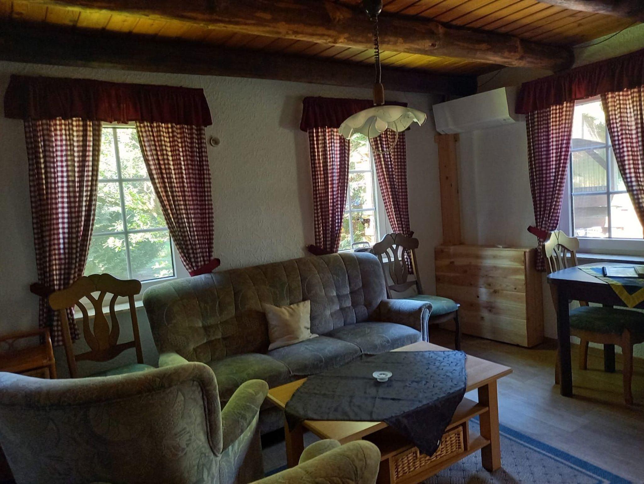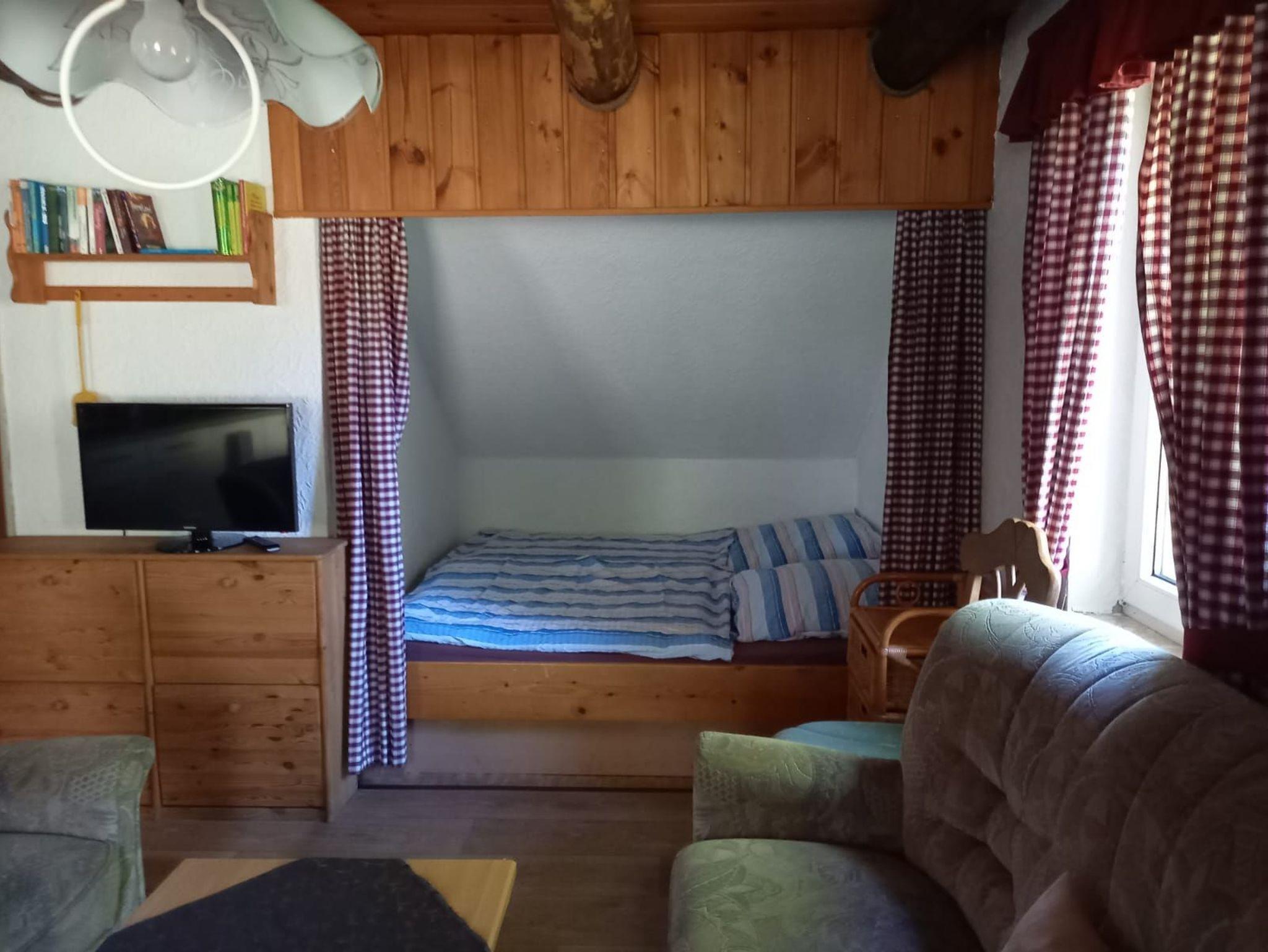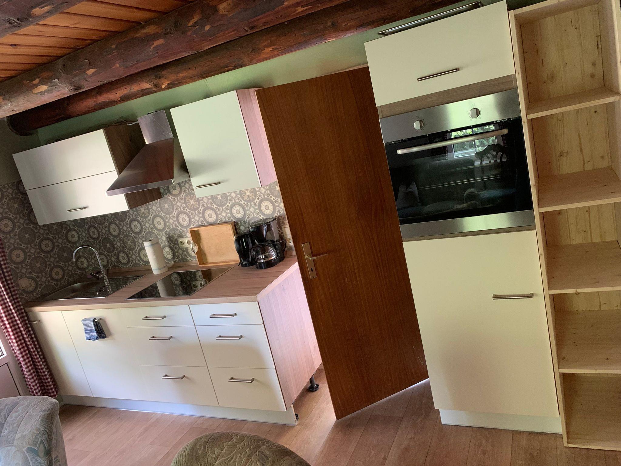 Das Backhaus ist ein Ferienhäuschen auf dem Bauernhof in Ruh, parterre, ohne Treppen mit einem Wohnraum von 4,1 x 4,8m mit Holzbankendecke, Sitzgruppe, Küchenzeile und Terrassentür. 1 Doppelbutze mit 2 Einzelbetten, 1 Koje mit Doppelbett, Dusche/ WC und überdachter Terrasse.