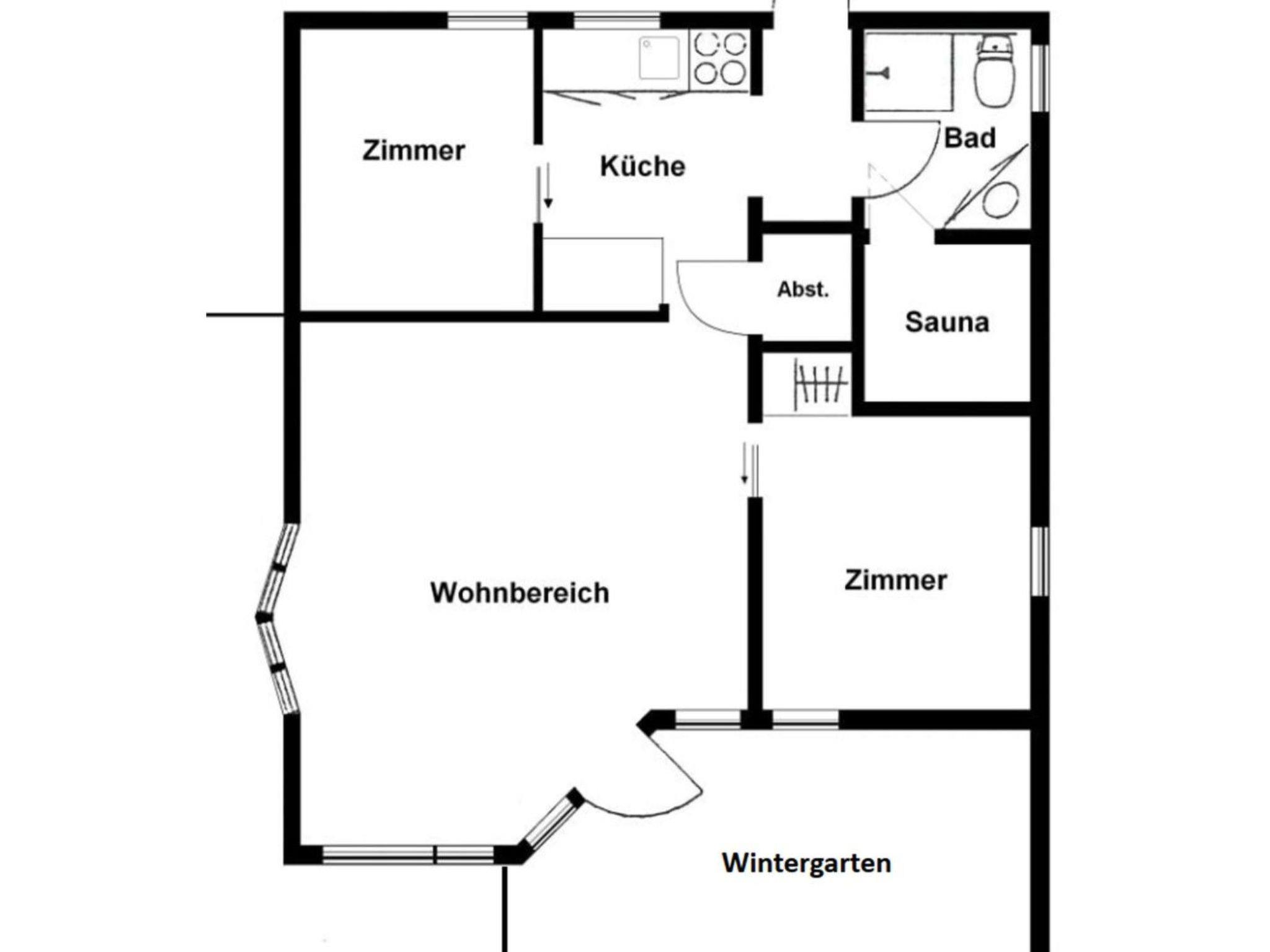 From the entrance with cloakroom, you enter through the open-plan kitchen into the living room with floor-to-ceiling windows and wood-burning stove. You can relax wonderfully in your own sauna. Two bedrooms and a bathroom with walk-in shower complete the space on offer.