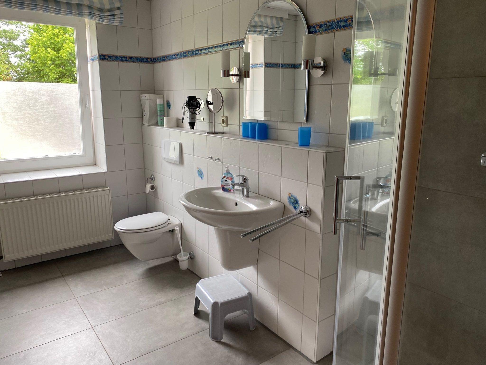 Das große und moderne Badezimmer mit WC ist mit einer geräumigen Duschkabine ausgestattet.