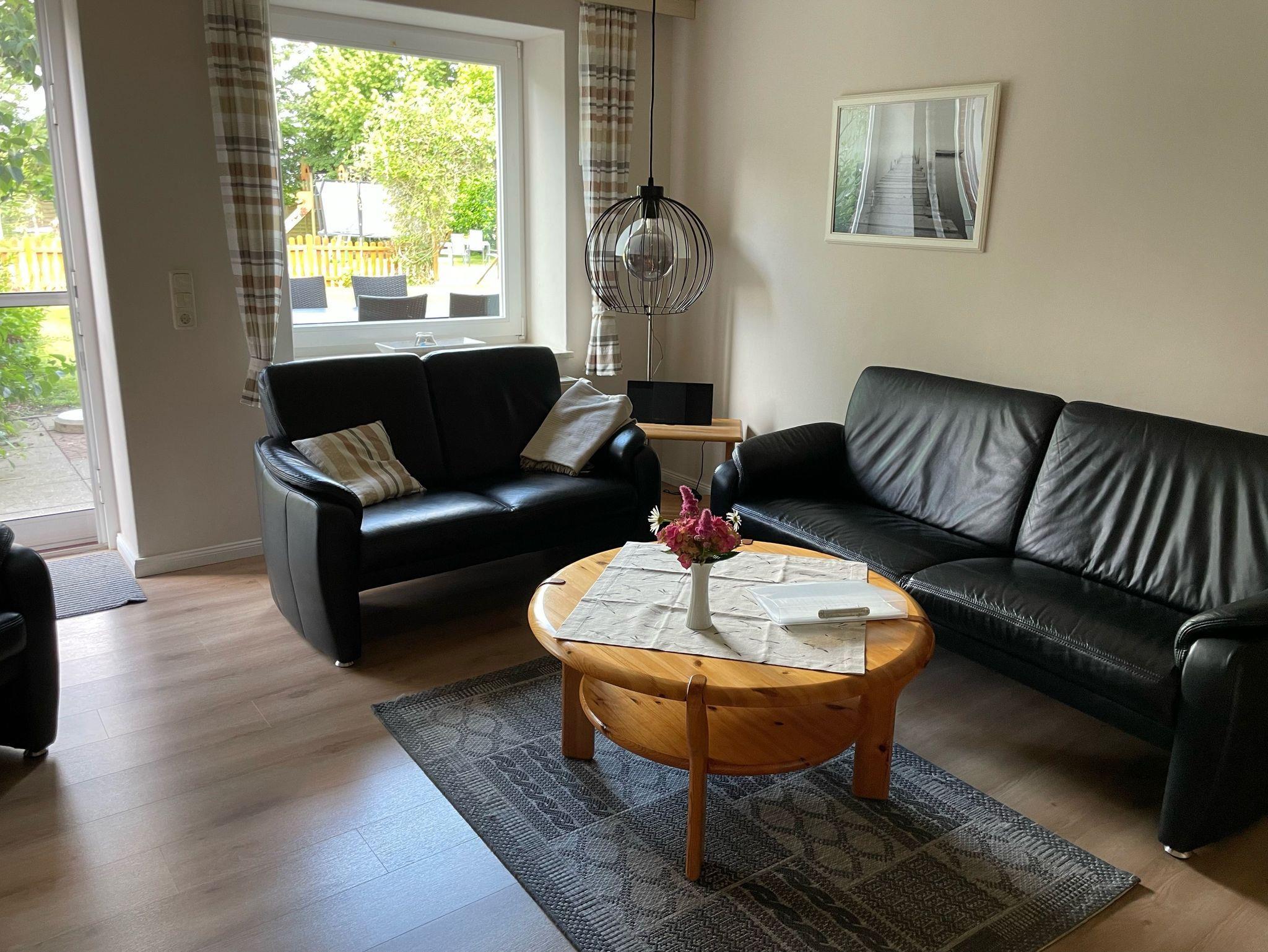 Im gemütlichen Wohnzimmer steht die für fünf Personen nutzbare Sitzgruppe. Fernseher, DVD-Player und Stereo-Anlage gehören zur Ausstattung.