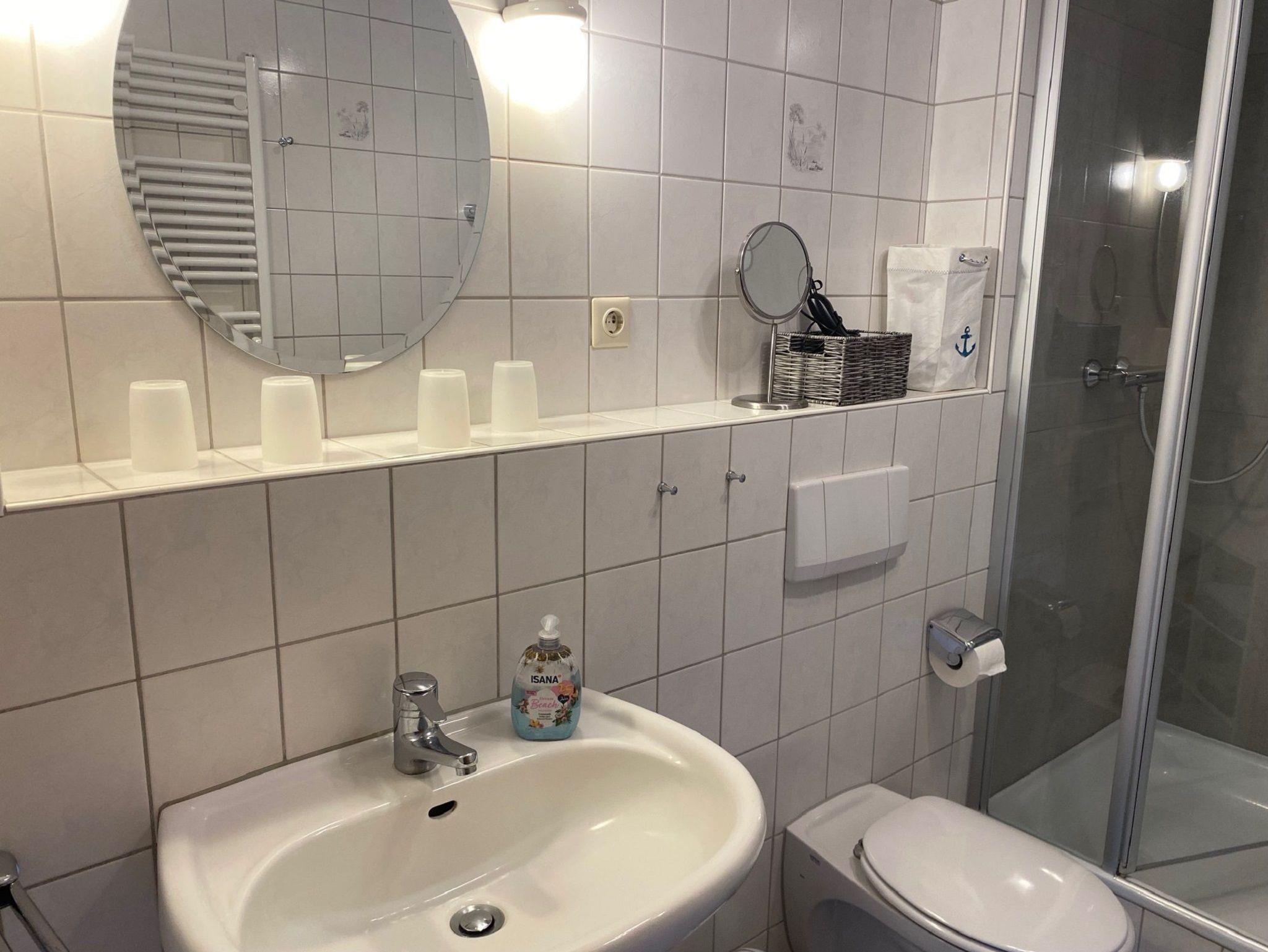 Das moderne Badezimmer mit WC ist mit einer geräumigen Duschkabine ausgestattet.