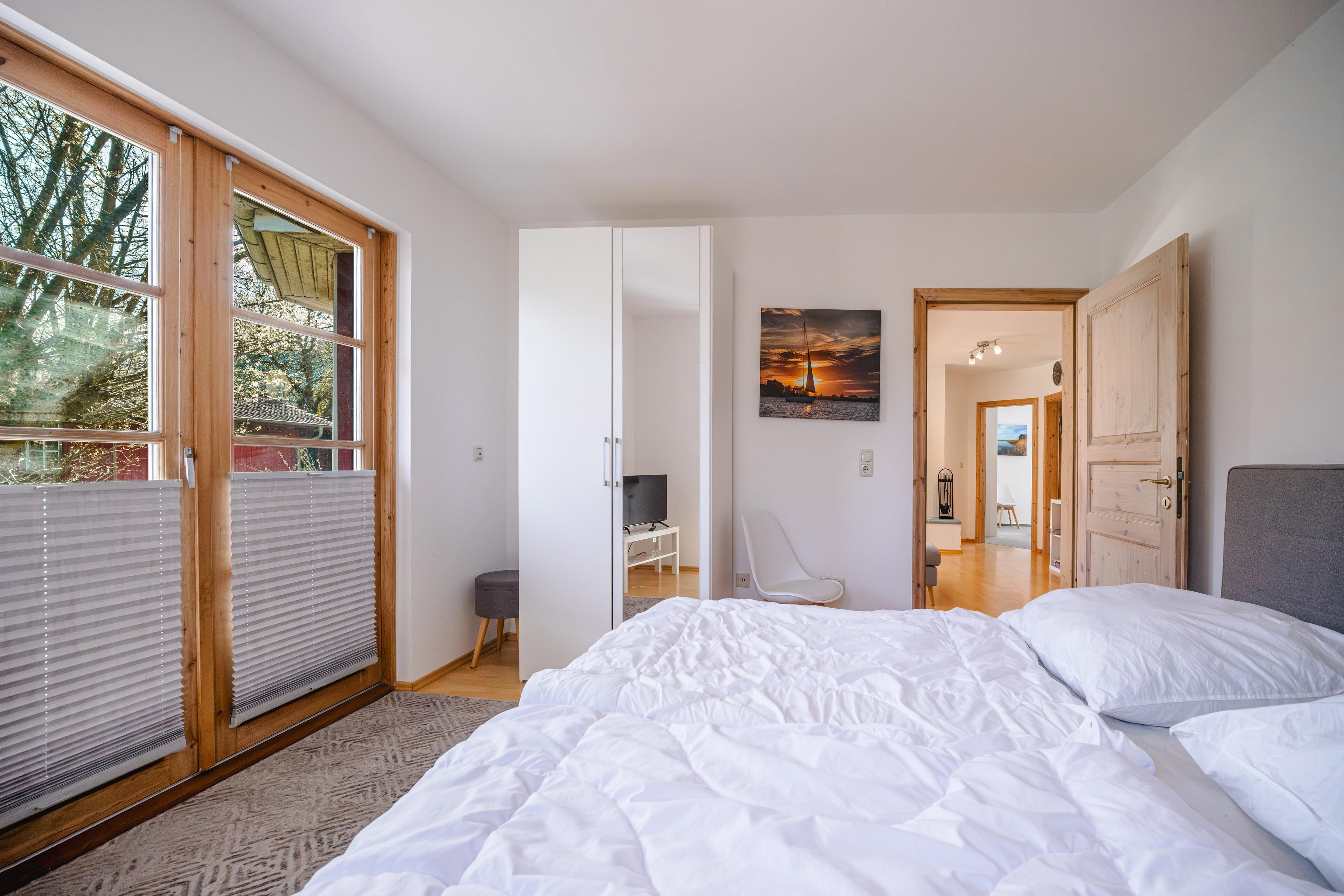 Die Wohnung wurde im Jahr 2020 neu gestaltet und im nordischen Stil eingerichtet. Die drei Schlafzimmer grenzen an den zentralen Wohnraum. Zwei Schlafzimmer sind mit jeweils einem Doppelbett, Kleiderschrank und modernen Fernsehgeräten ausgestattet, das dritte Schlafzimmer ist mit zwei Einzelbetten ausgestattet. Durch den schnellen Glasfaser-, Anschluss haben Sie die Möglichkeit, eigene Streamingdienste, wie z.B. Netflix, zu nutzen. Im Wohnzimer befindet sich ein Biofire Ofen, der an kälteren Tagen wohlige Wärme verbreitet. Der Essbereich mit einem großen, ausziehbaren Esstisch befindet sich in einem kleinen Wintergarten. Von hier hat man einen tollen Blick in den großzügigen Garten. Auf der angrenzenden Terrasse finden Sie neben gemütlichen Gartenmöbeln auch einen Holzkohlegrill. Der große Garten lädt zum Entspannen oder Toben ein, er ist teilweise eingezäunt.