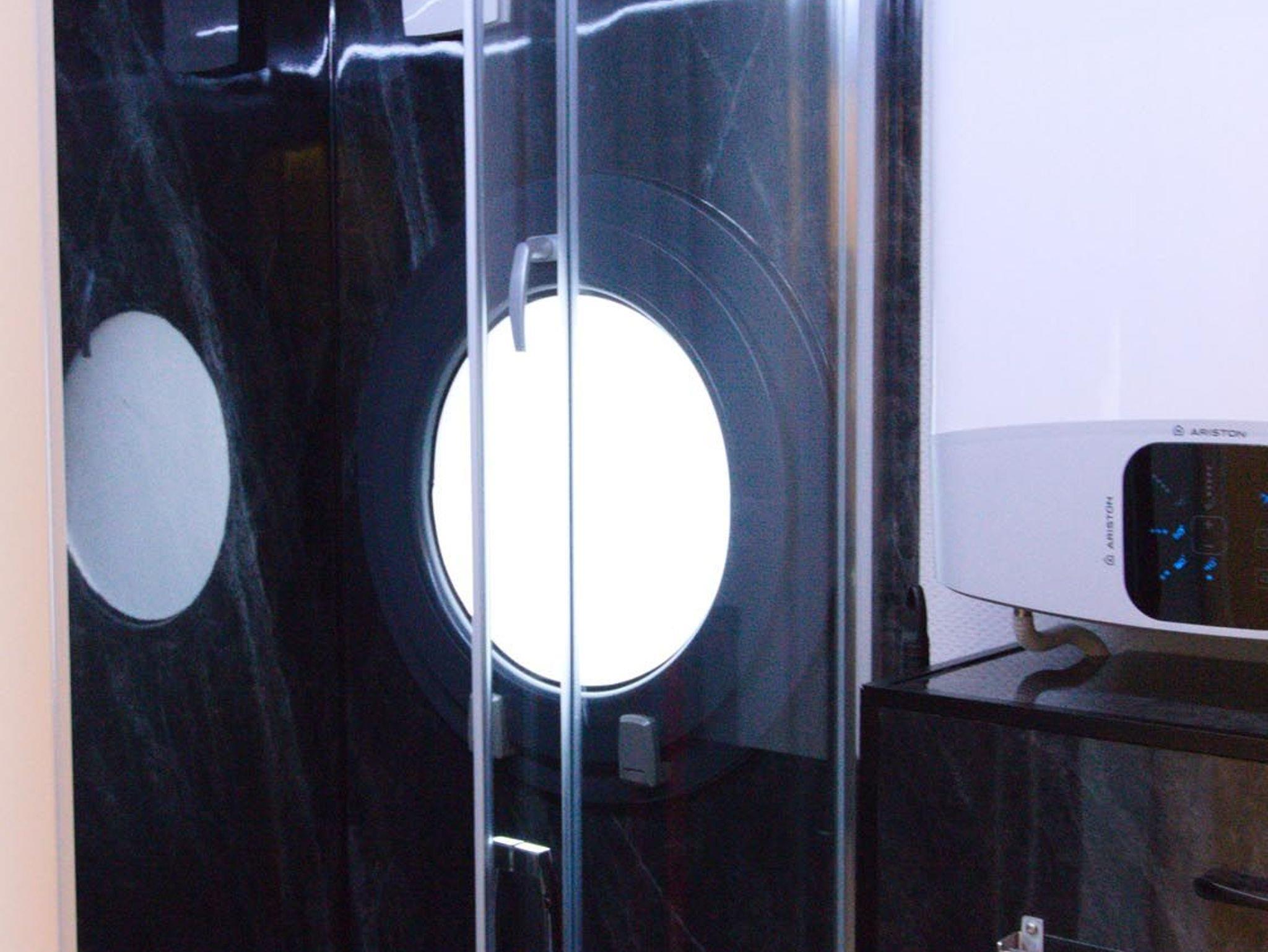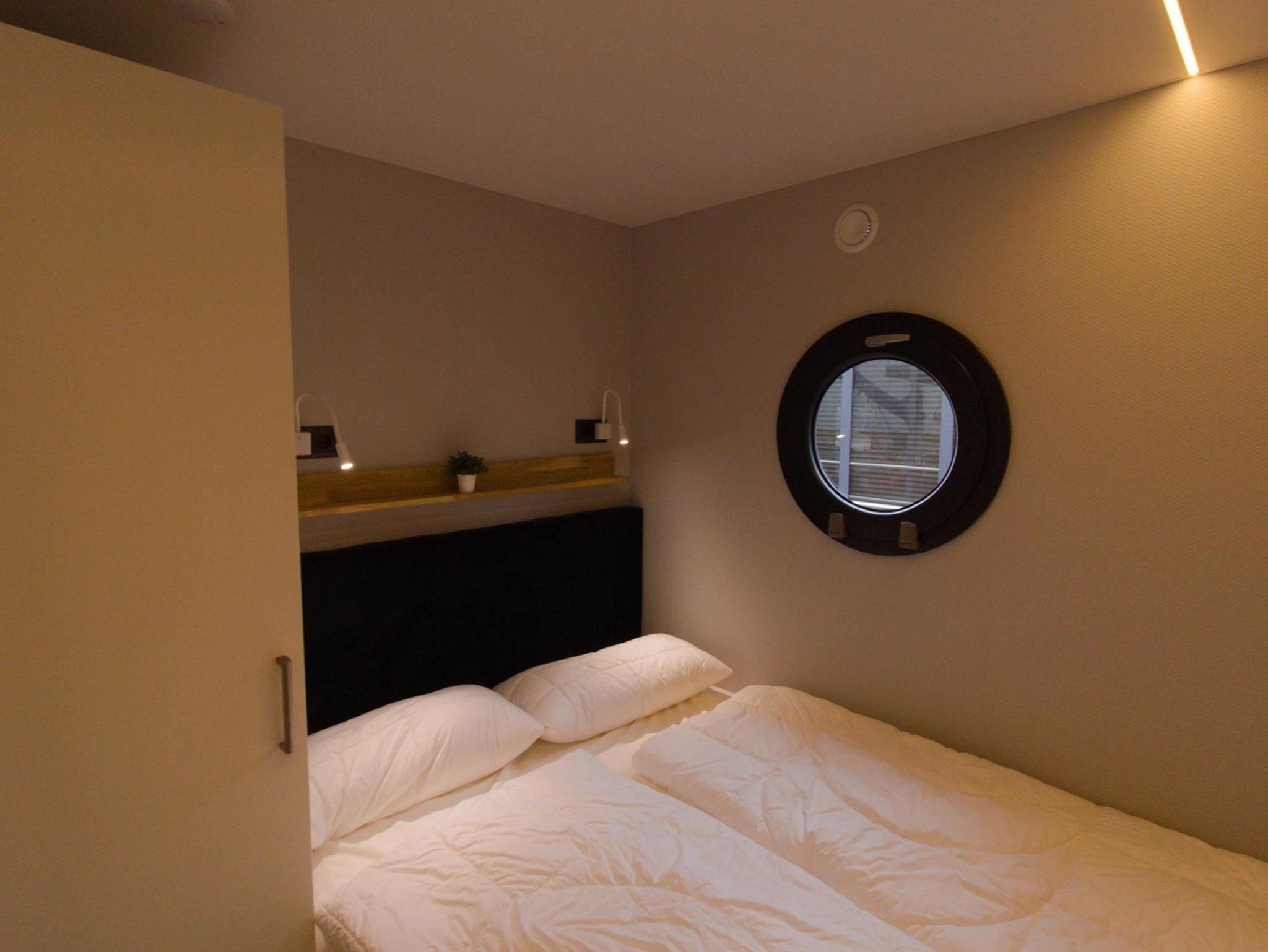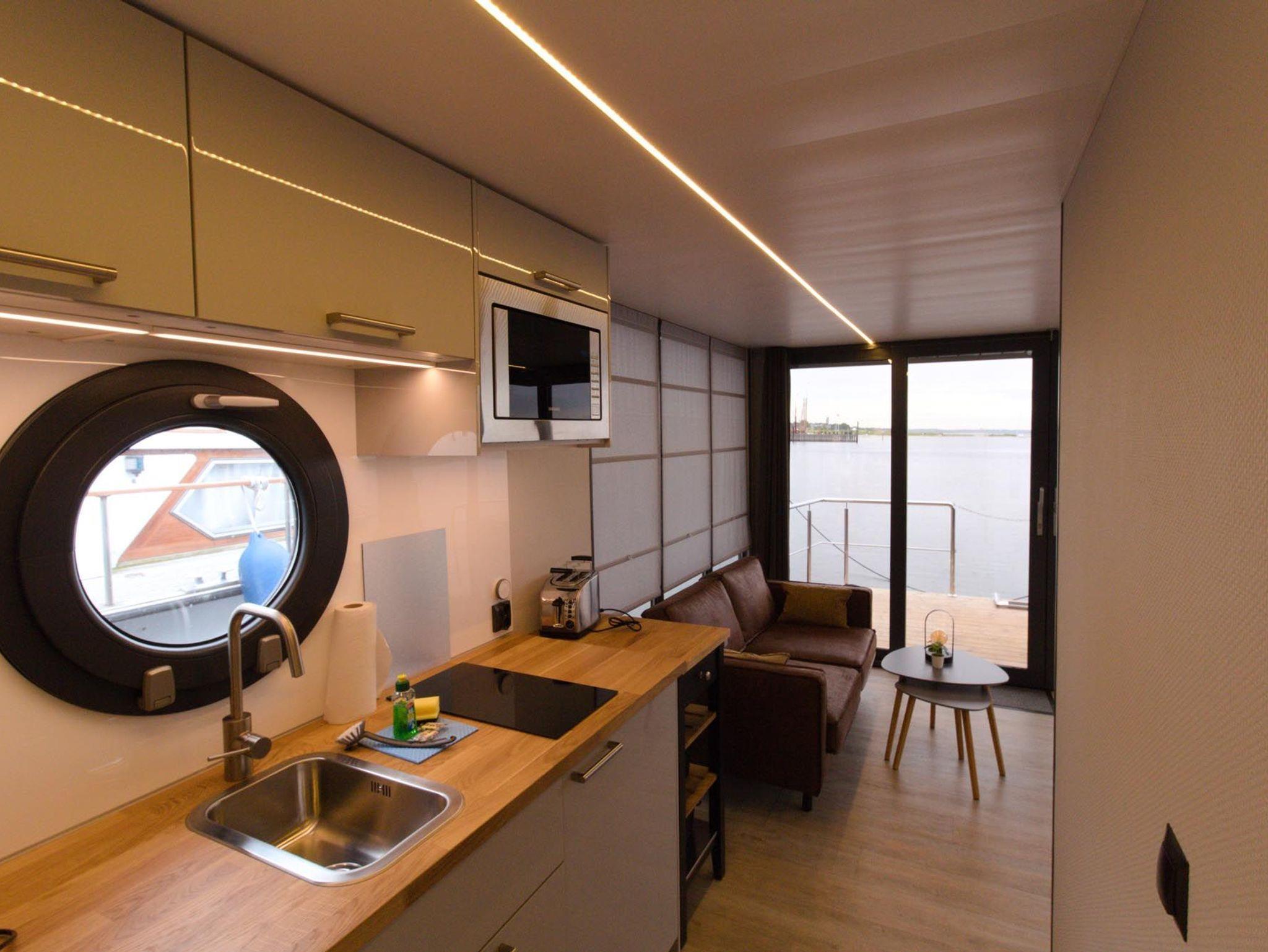 Im Inneren des Hausbootes finden Sie neben dem Wohnraum mit Fußbodenheizung für kalte Tage zwei Schlafräume mit je einem Doppelbett sowie ein modernes Duschbad. Genügend Stauraum finden Sie in den Schränken sowie in den Schubladen unter den Betten.