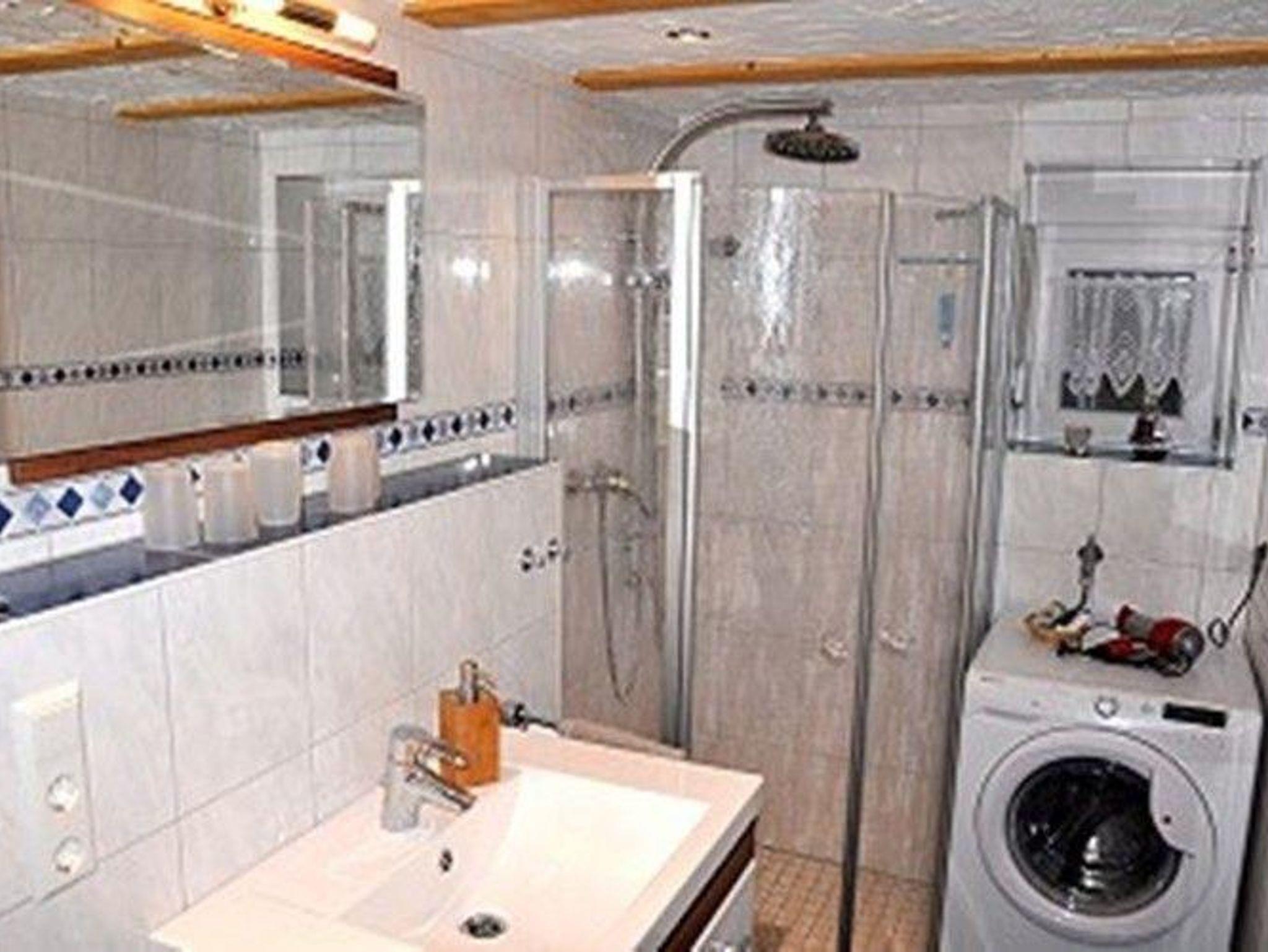 Abstellraum mit Bodenfliesen: Sitzgelegenheit mit Tisch, Wäscheständer, Elektrogrill, Bügelbrett. Sie können Ihre Sportgeräte dort abstellen.
