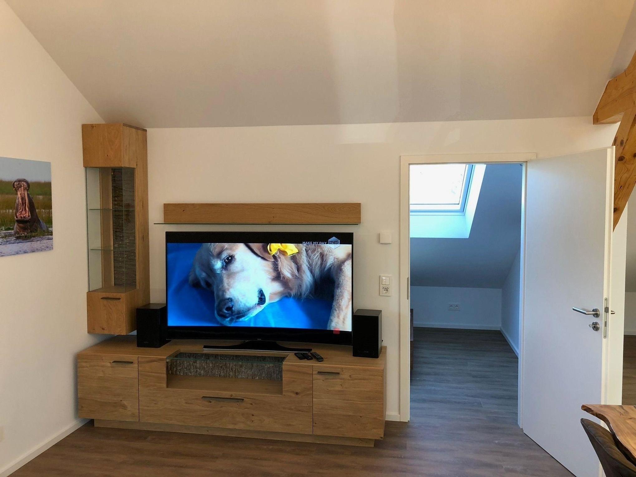 Im Schlafzimmer erwartet Sie ein gemütliches Doppelbett und ein kleiner Fernseher, der für entspannte Stunden sorgt. Der offene Wohn-/Ess-/Kochbereich ist der gesellige Mittelpunkt – die bequeme Couch wandelt sich mühelos in eine Schlafcouch für zwei zusätzliche Gäste. Der Esstisch lädt zum gemeinsamen Genießen von Mahlzeiten, Spielen oder Planen ein. Die voll ausgestattete Küche mit Backofen, Induktionsherd und Mikrowelle lässt keine Wünsche offen, während der Kaffeevollautomat für perfekten Kaffeegenuss sorgt. Die Klangkulisse wird durch Nubert Boxen an den großen Fernseher abgerundet.