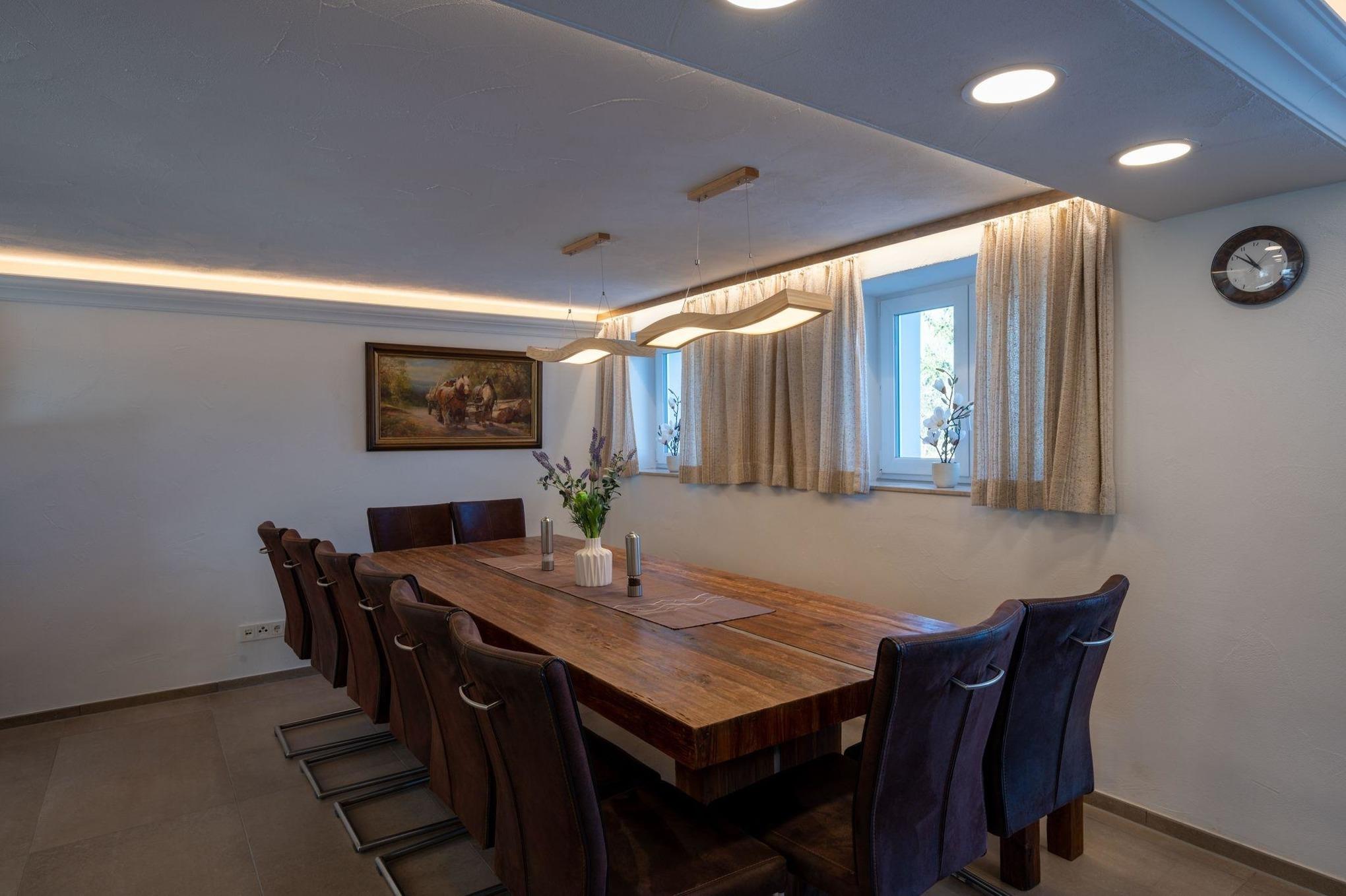 Das Herzstück der Residenz Zugspitzblick ist der beeindruckende Aufenthaltsraum, der mit einer Fläche von ca. 98m2 jeden Besucher in seinen Bann zieht. Der Raum besticht nicht nur durch seine Größe, sondern auch durch eine durchdachte Ausstattung. Eine gemütliche Couchecke mit Tisch lädt zum Verweilen ein, während die offene Küche mit Theke und ein großer Esstisch für bis zu 15 Personen perfekte Voraussetzungen für gemeinsame Mahlzeiten und gesellige Stunden bietet.