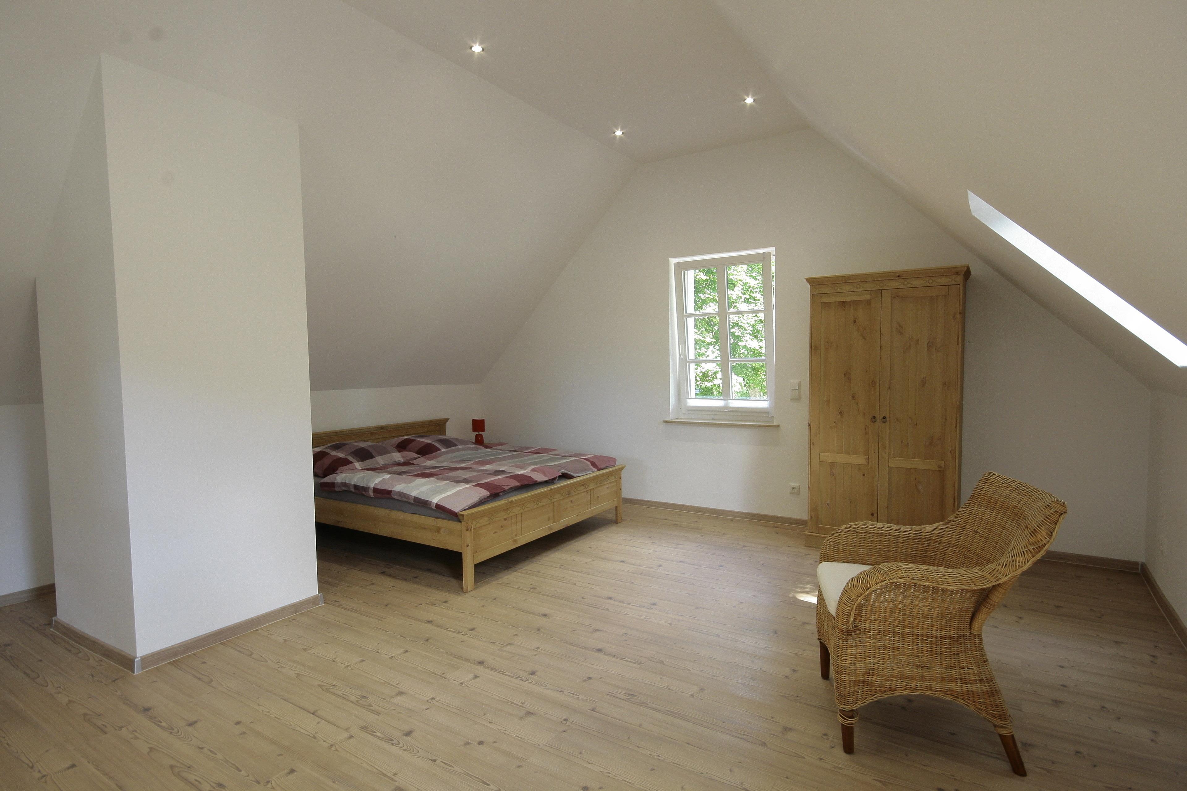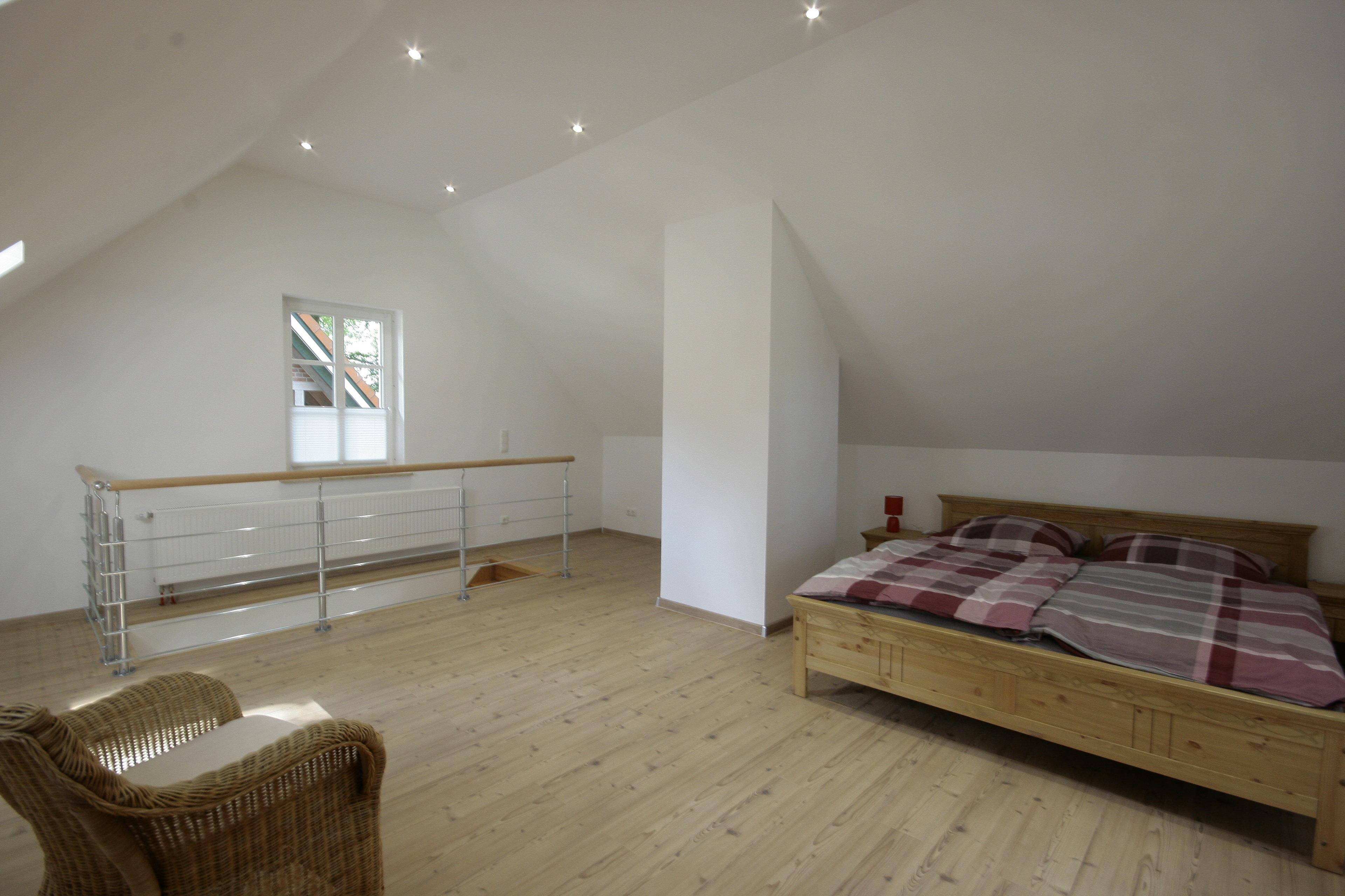 In dem Dachgeschoss befindet sich ein großes Schlafzimmer mit einem Doppelbett, einer Schlafcouch (1,38 m x 1,90 m), einem Kleiderschrank, eine Kommode und einem Sessel. Der schöne Raum ist lichterfüllt und bietet Platz für ein Kinderreisebettchen.