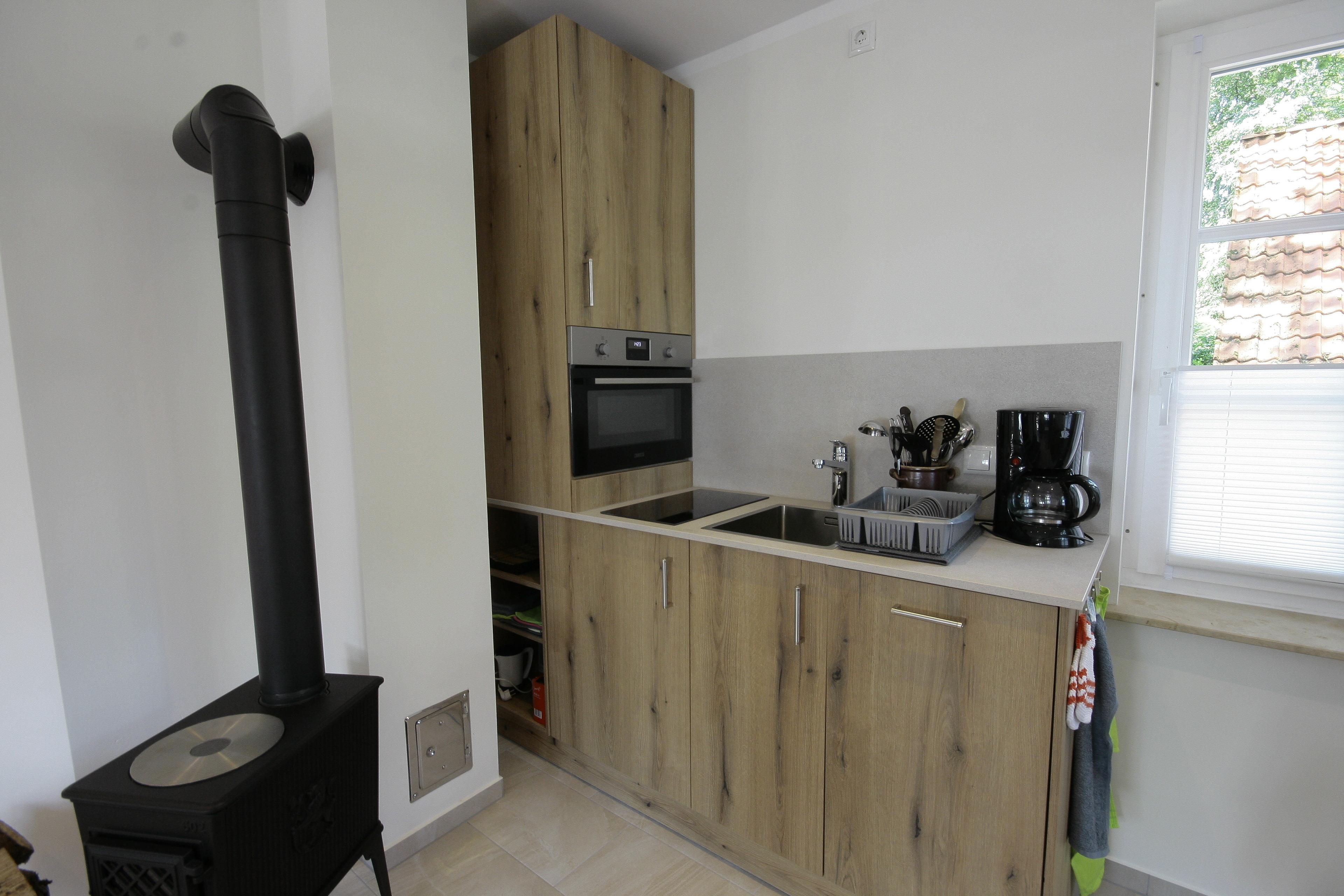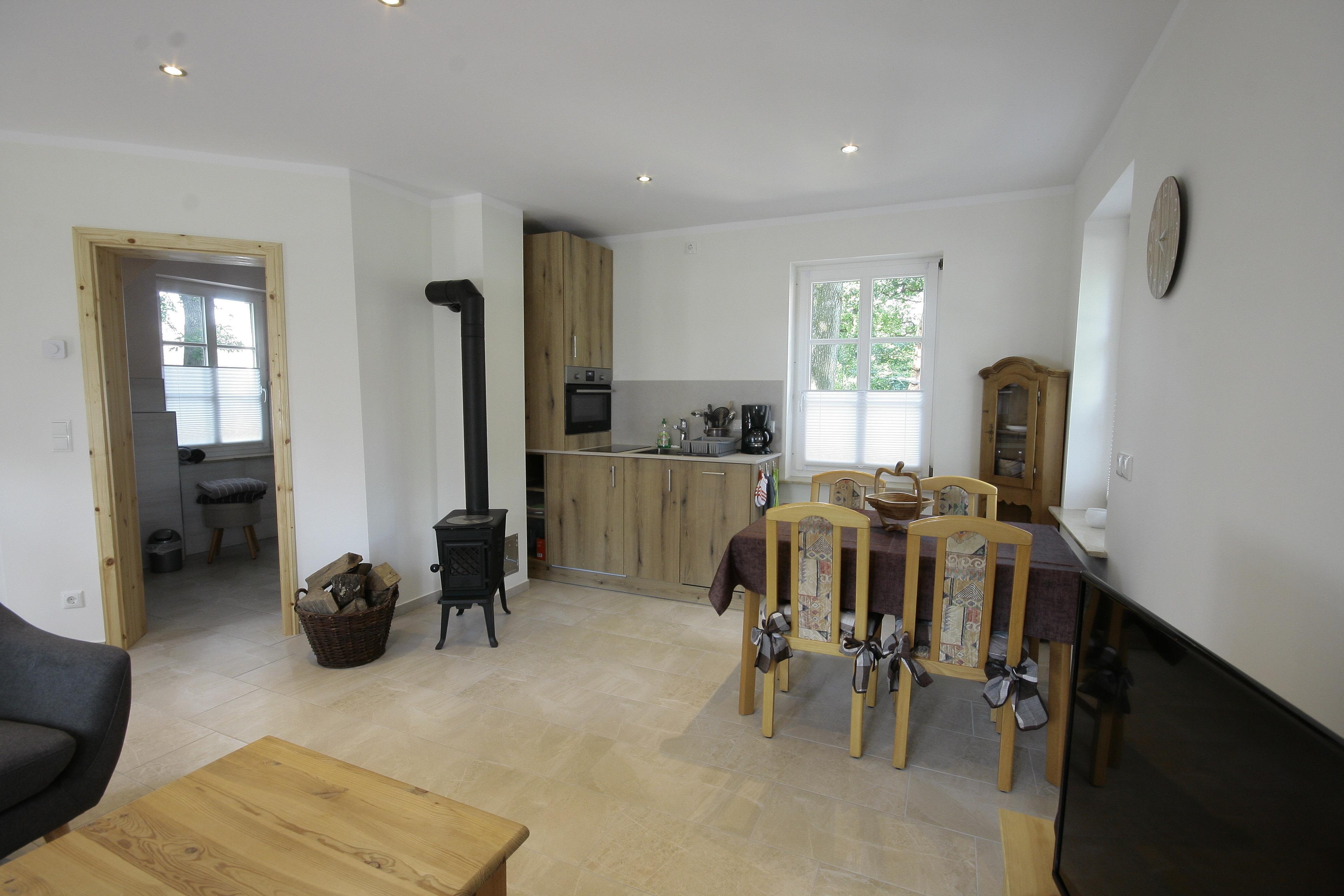Das Erdgeschoss bietet einen hellen, offenen Wohnbereich und ein Badezimmer mit cremefarbene Fliesen und Fußbodenheizung auf der gesamten Ebene. Eine integrierte Pantryküche im Esszimmerbereich verfügt über eine Heißluftfritteuse mit zwei Kammern, einen Backofen, eine Mikrowelle, einen Kühlschrank, ein kleines Kochfeld, eine Geschirrspülmaschine und ein Spülbecken. Zur Ausstattung im Erdgeschoss gehören eine Esstischgruppe für 4 Personen und eine bequeme Sofagruppe, sowie ein Fernseher. An kühlen Tagen sorgt ein Kaminofen für ein behagliches Ambiente und angenehme Wärme.