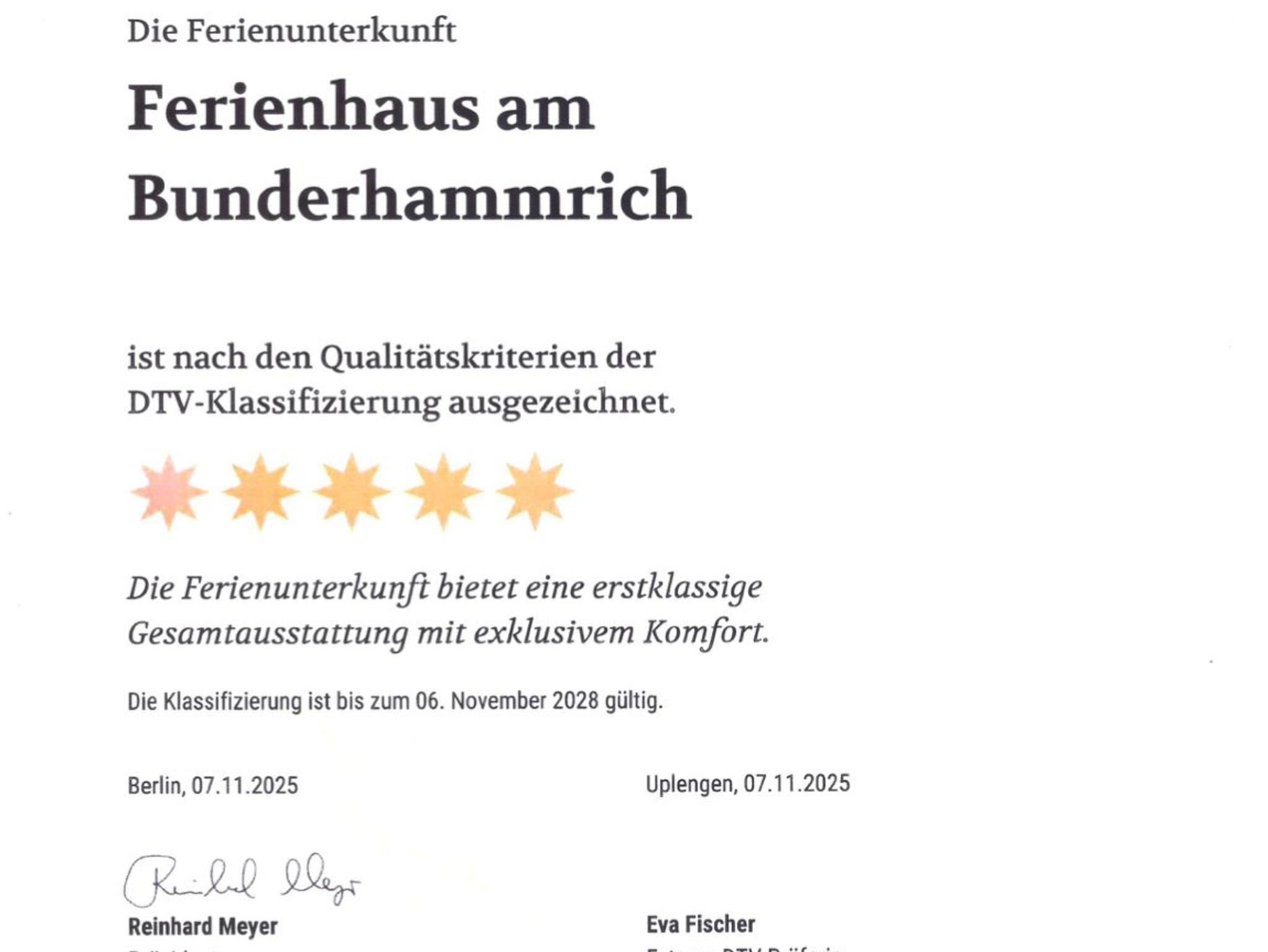 Herzlich Willkommen im Ferienhaus Am Bunderhammrich, mit einer eigenen Ladestation für E-Autos. Unser Ferienhaus wurde in 2025 vom Deutschen Tourismusverband DTV mit 5 Sternen (für max. 6 Personen) ausgezeichnet. In der Kategorie Urlaub mit Hund, wurden wir mit 5 von 5 Pfoten in der Pfoten-Klassifizierung ausgezeichnet. Letzte Renovierung in 2025.