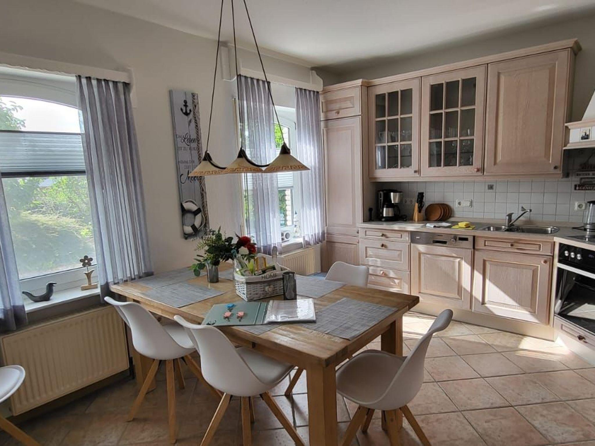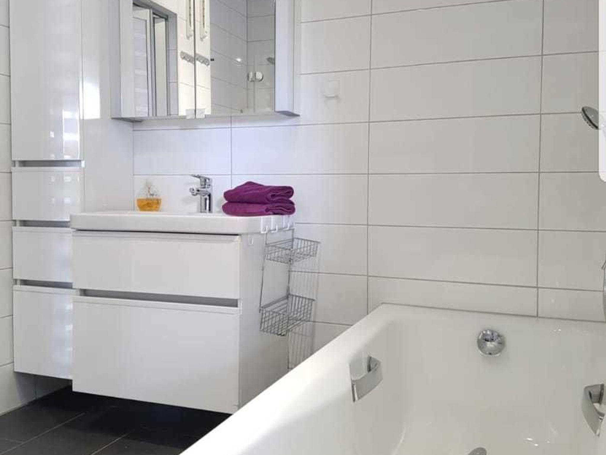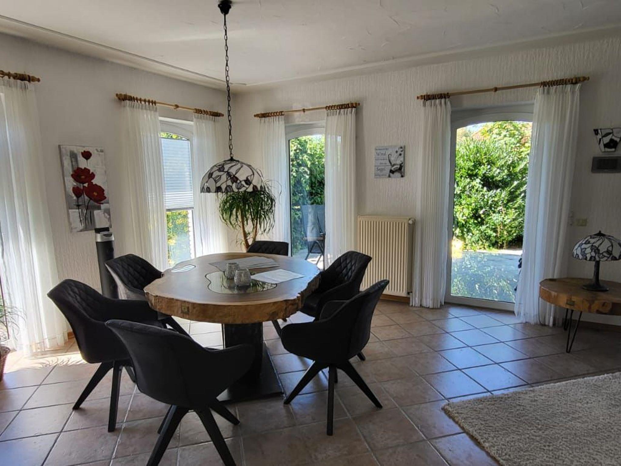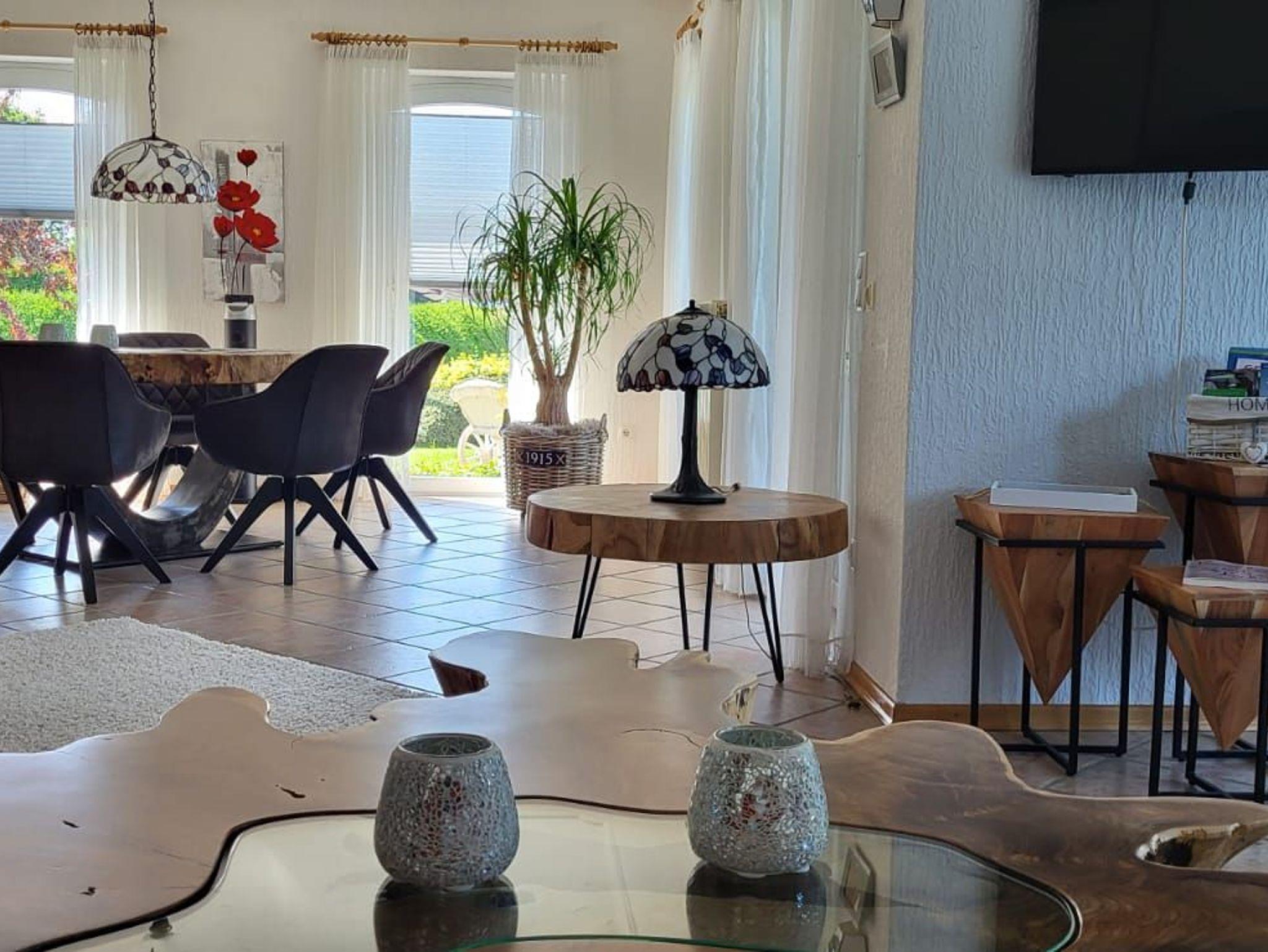 Großzügiger Wohnraum, großes Bad mit Badewanne und ebenerdiger Dusche, ein separates Gäste-WC, ein Schlafzimmer (mit Doppelboxspringbett) und große Küche im Erdgeschoss.