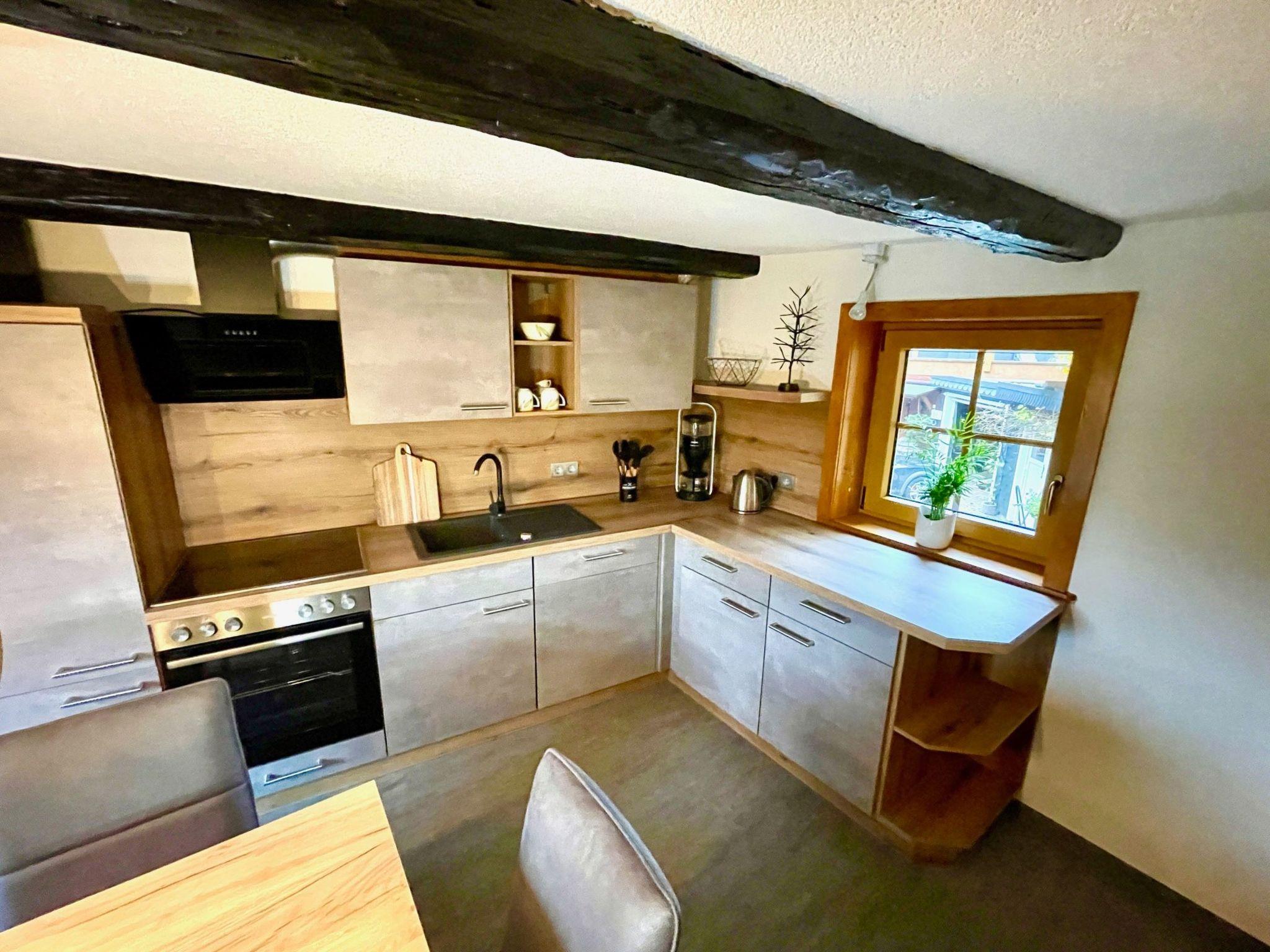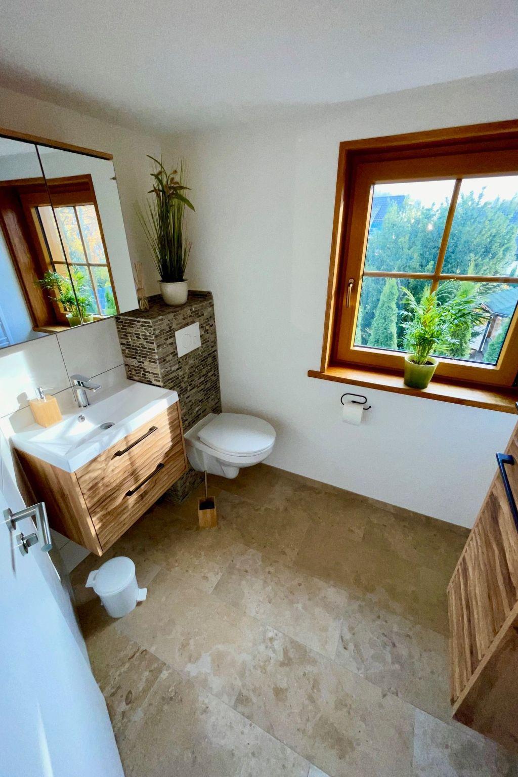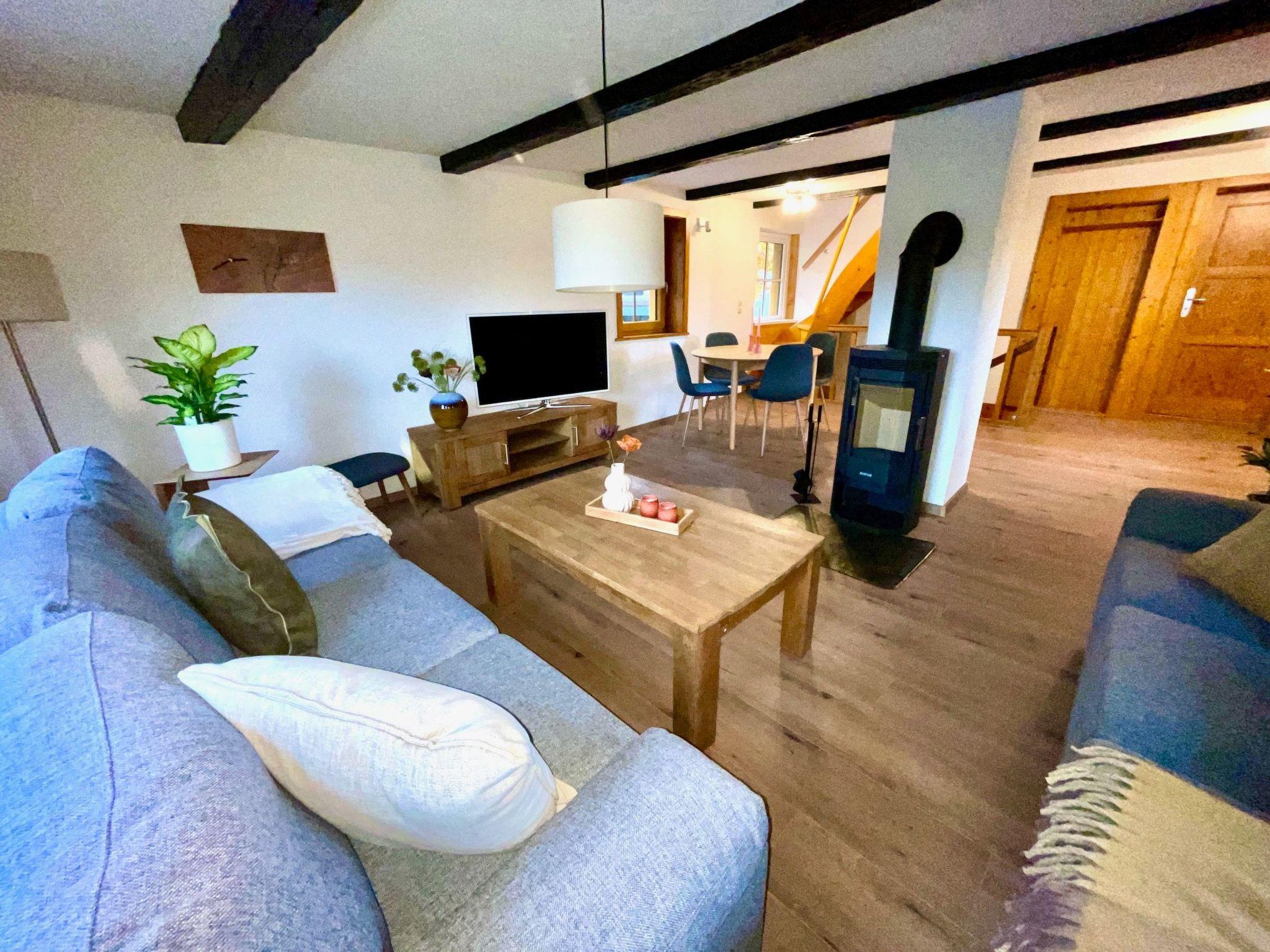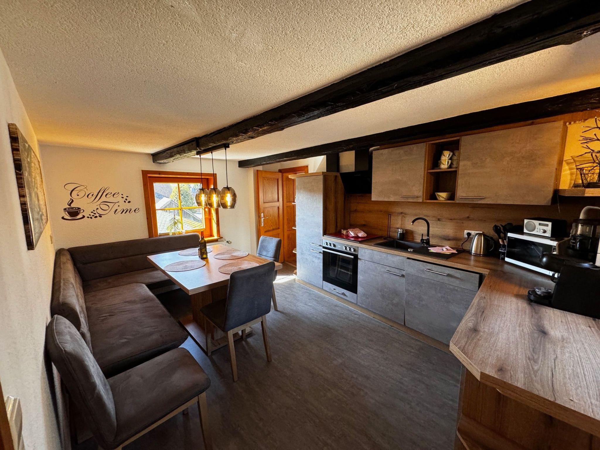 The interior of the Hexenhäuschen is a perfect blend of modernity and cosiness. Equipped with free WiFi, the spacious living/dining area with its 46-inch TV and cosy wood-burning stove makes for unforgettable moments of well-being. The fully equipped kitchen invites you to cook together, while the bathroom with its rain shower promises pure relaxation. A further WC with washing facilities on the top floor provides additional comfort.