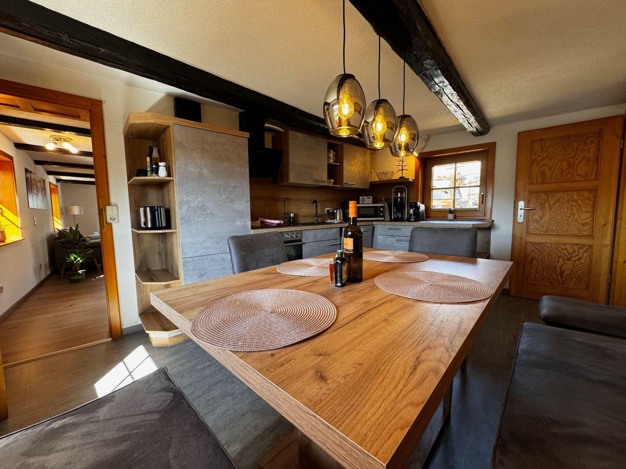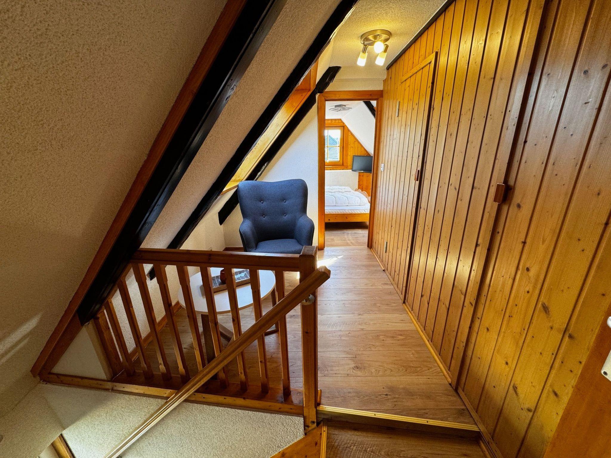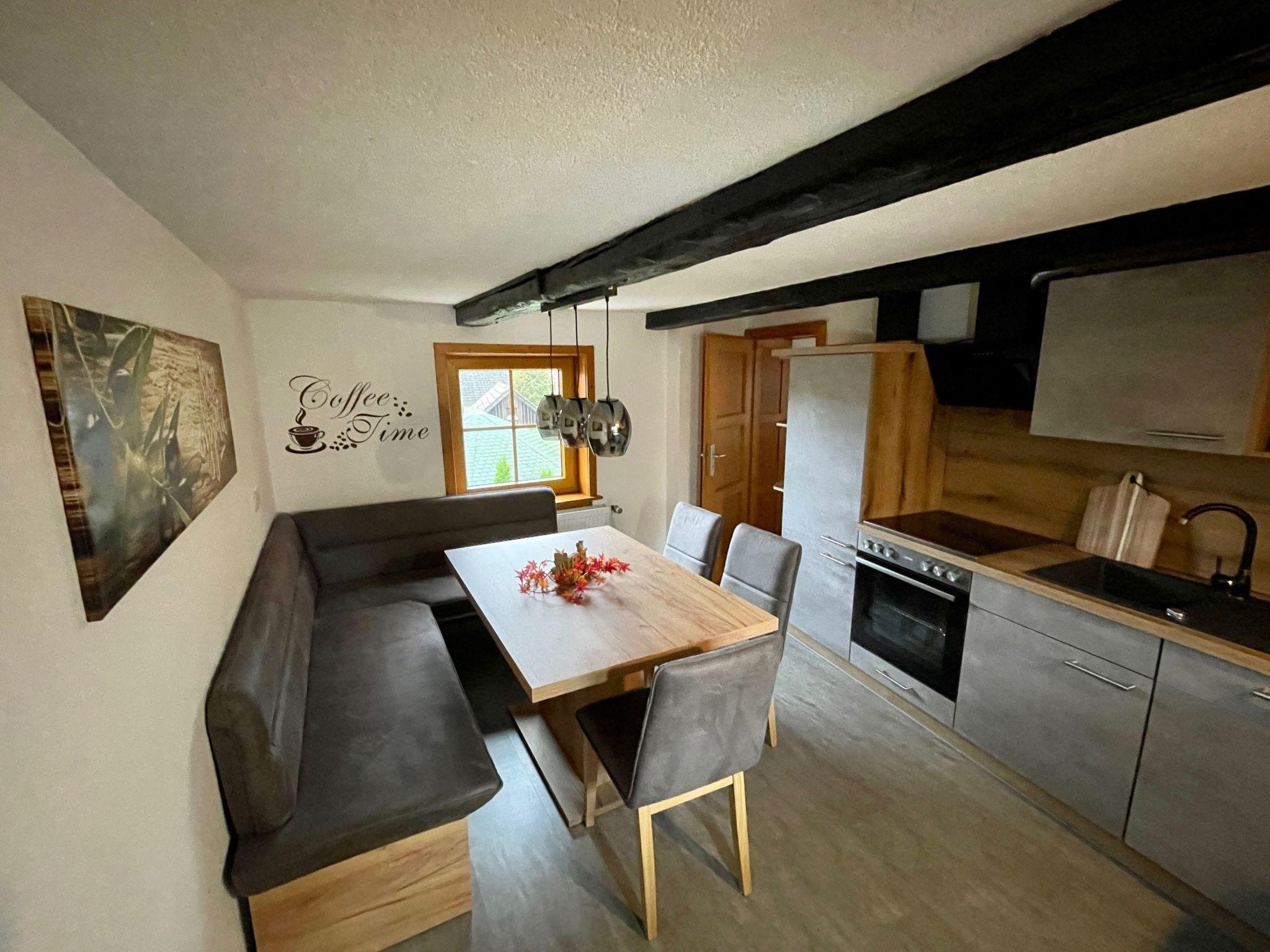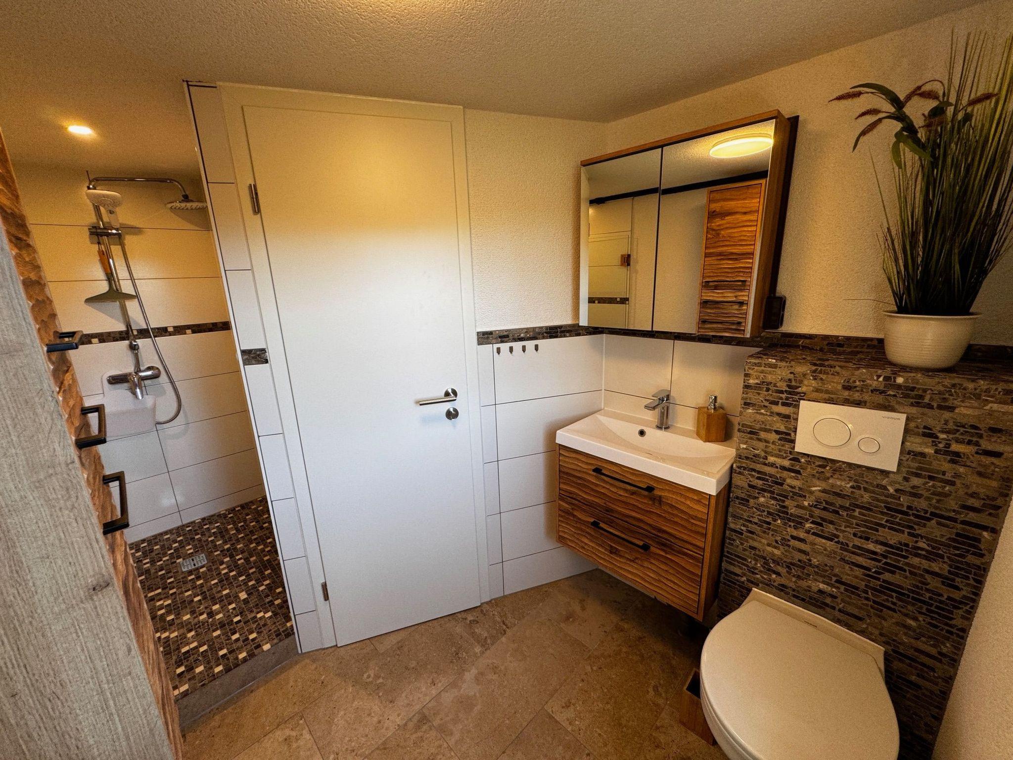 The interior of the Hexenhäuschen is a perfect blend of modernity and cosiness. Equipped with free WiFi, the spacious living/dining area with its 46-inch TV and cosy wood-burning stove makes for unforgettable moments of well-being. The fully equipped kitchen invites you to cook together, while the bathroom with its rain shower promises pure relaxation. A further WC with washing facilities on the top floor provides additional comfort.