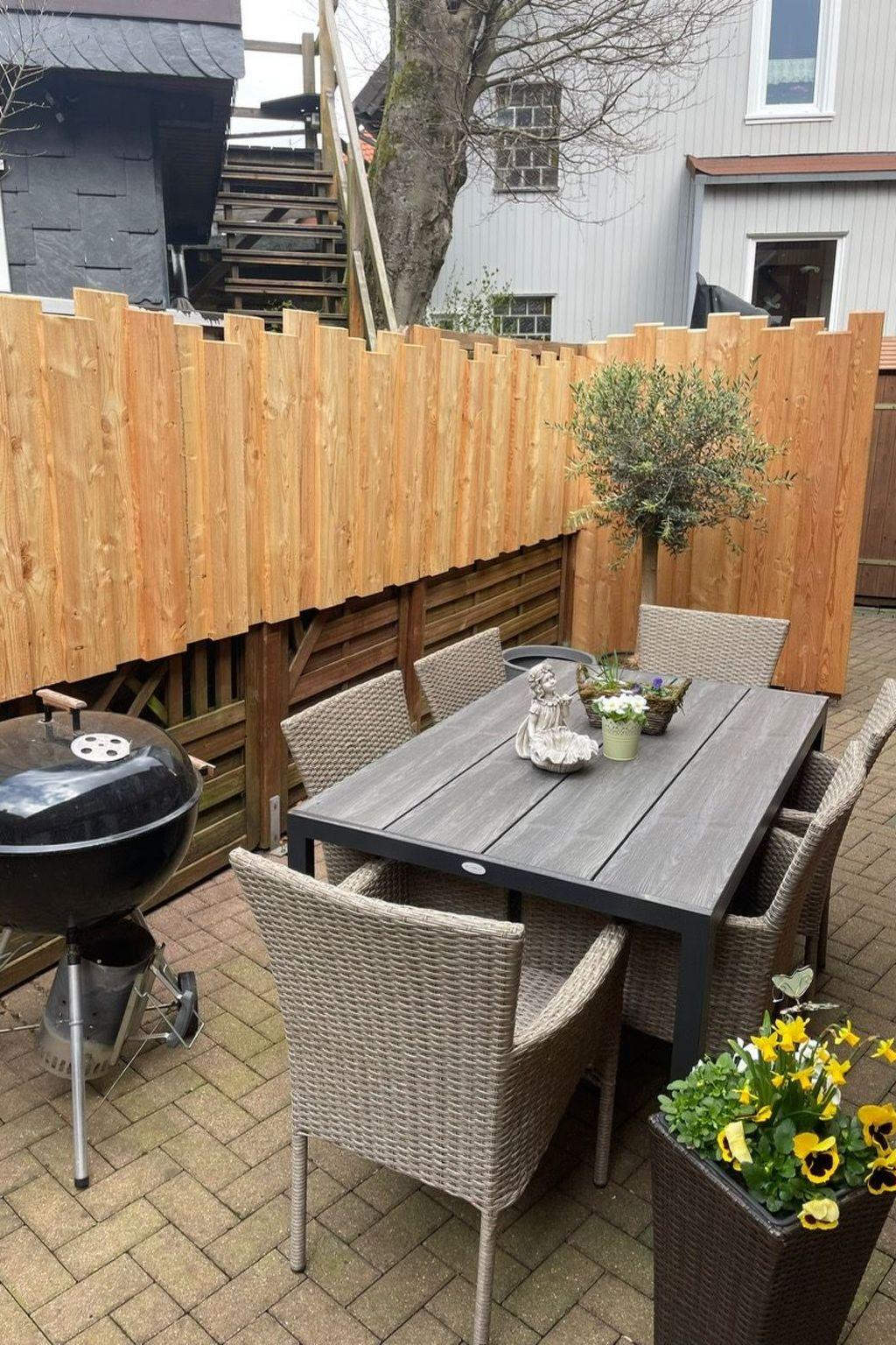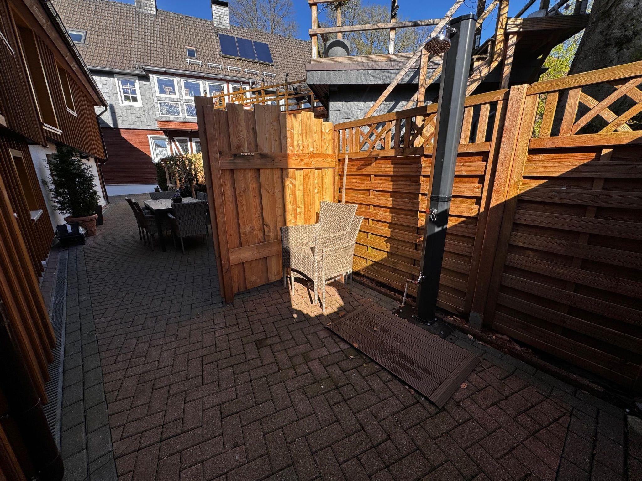 The outdoor area of the Hexenhaus is a true oasis of relaxation. After a sauna session, the outdoor shower (in operation except in sub-zero temperatures) invites you to freshen up, while the adjoining courtyard with its covered, cosy barbecue area invites you to linger. A small balcony with seating also provides the perfect backdrop for relaxing on warm days.