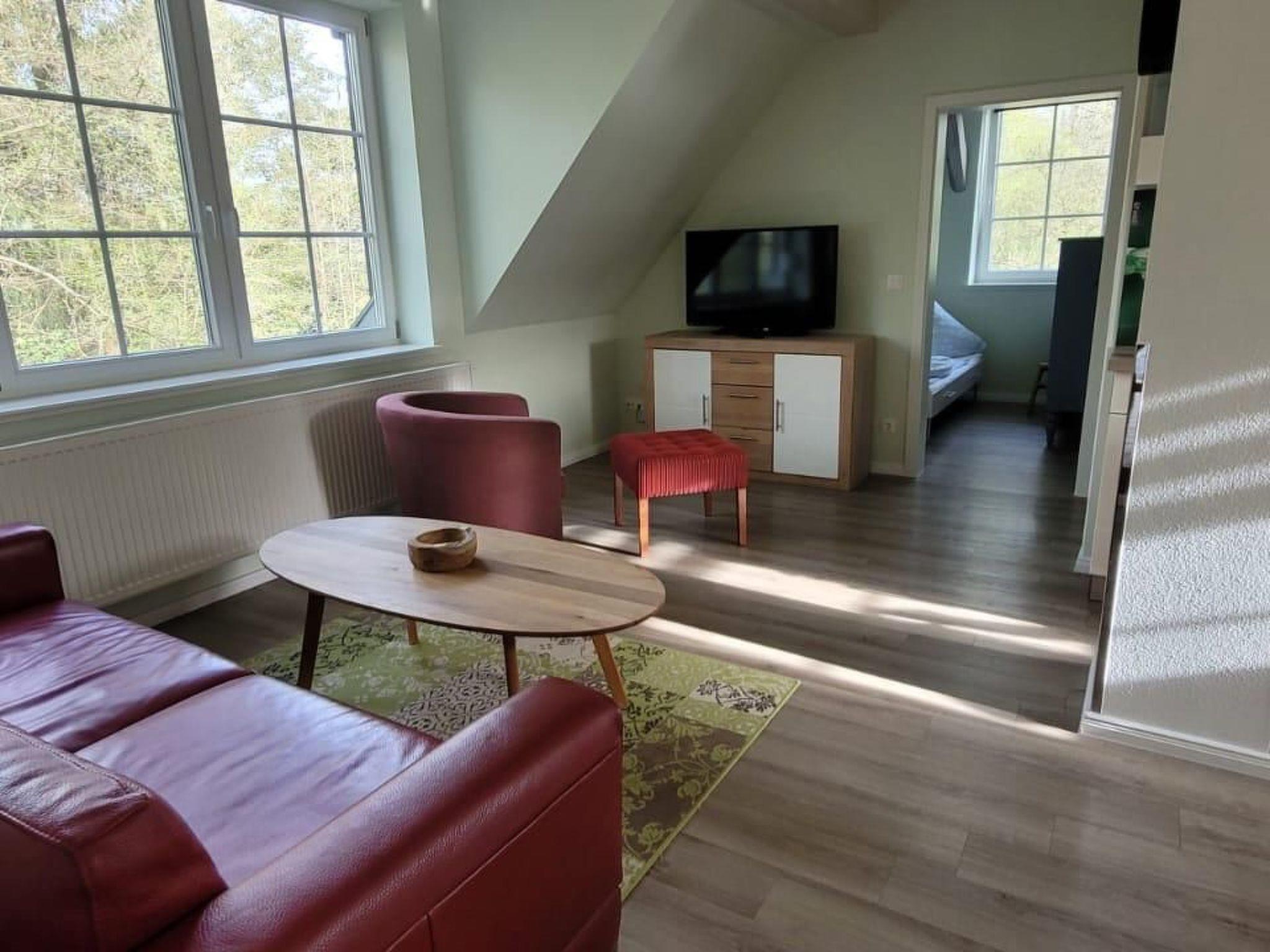 Each holiday flat can accommodate up to 4 people with a spacious living room, bathroom with shower, 1 large bedroom, a smaller bedroom and a fully equipped kitchen. The flats are located on the first floor in a converted log cabin on a private property.