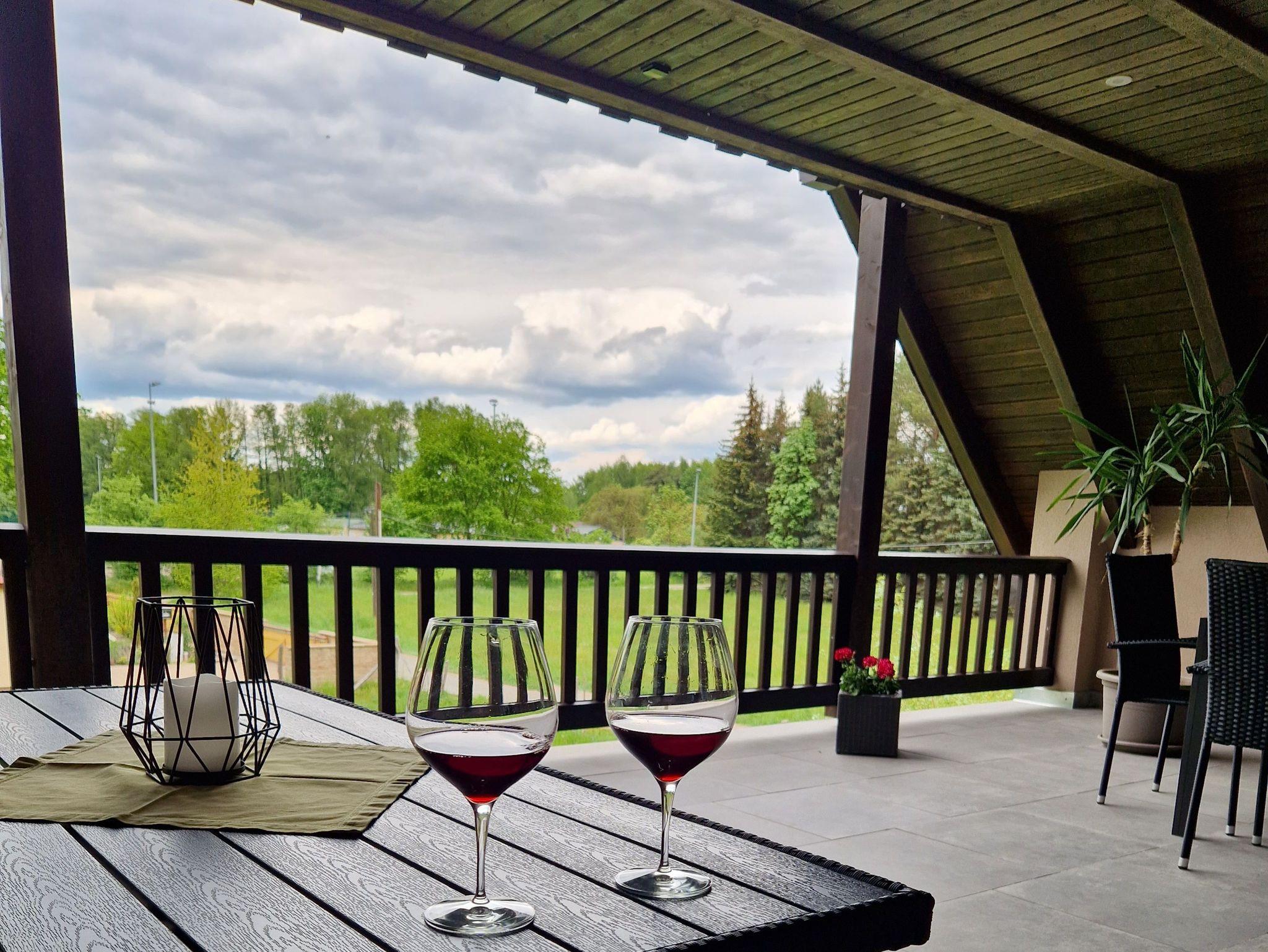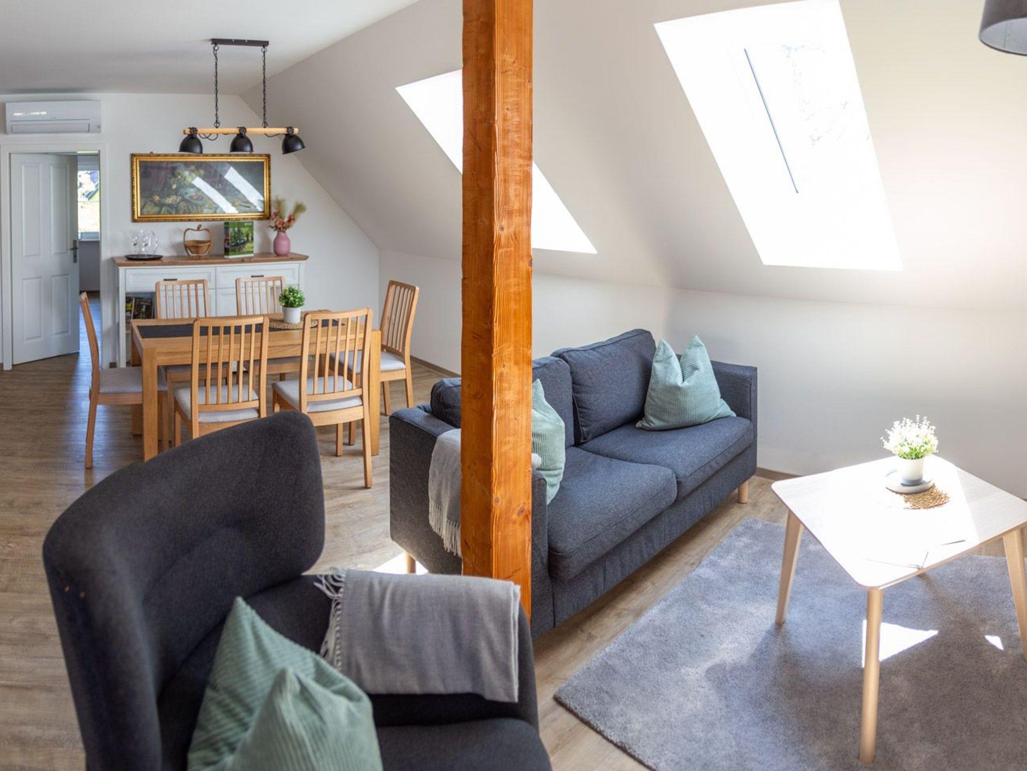 Die geschmackvoll und gemütliche eingerichtete 75 m² große Ferienwohnung befindet sich im 1. Obergeschoß. Sie ist mit allem ausgestattet, was Sie für eine schöne Ferienzeit benötigen. Die Wohnung besteht aus 2 getrennte Schlafzimmer, der helle Wohnraum ist großzügig und offen geschnitten sowie einer komplett ausgestatteten Küche mit Esstisch und Bad mit Dusche. Die Fenster sind mit Fliegenrollos ausgestattet. Für kühle Tage sorgt eine Fußbodenheizung für behagliche Wärme und für heiße Sommertage ist eine Klimaanlage vorhanden. Lassen Sie den Urlaubstag bei einem Glas Wein auf der 32 m² großen Loggia ausklingen und genießen Sie an Sommerabenden das Konzert der Nachtigallen.