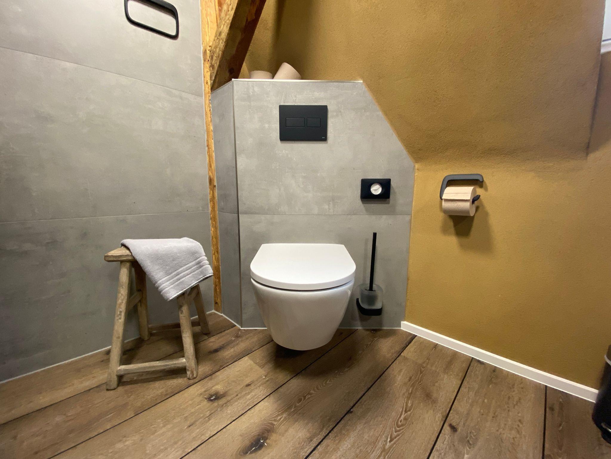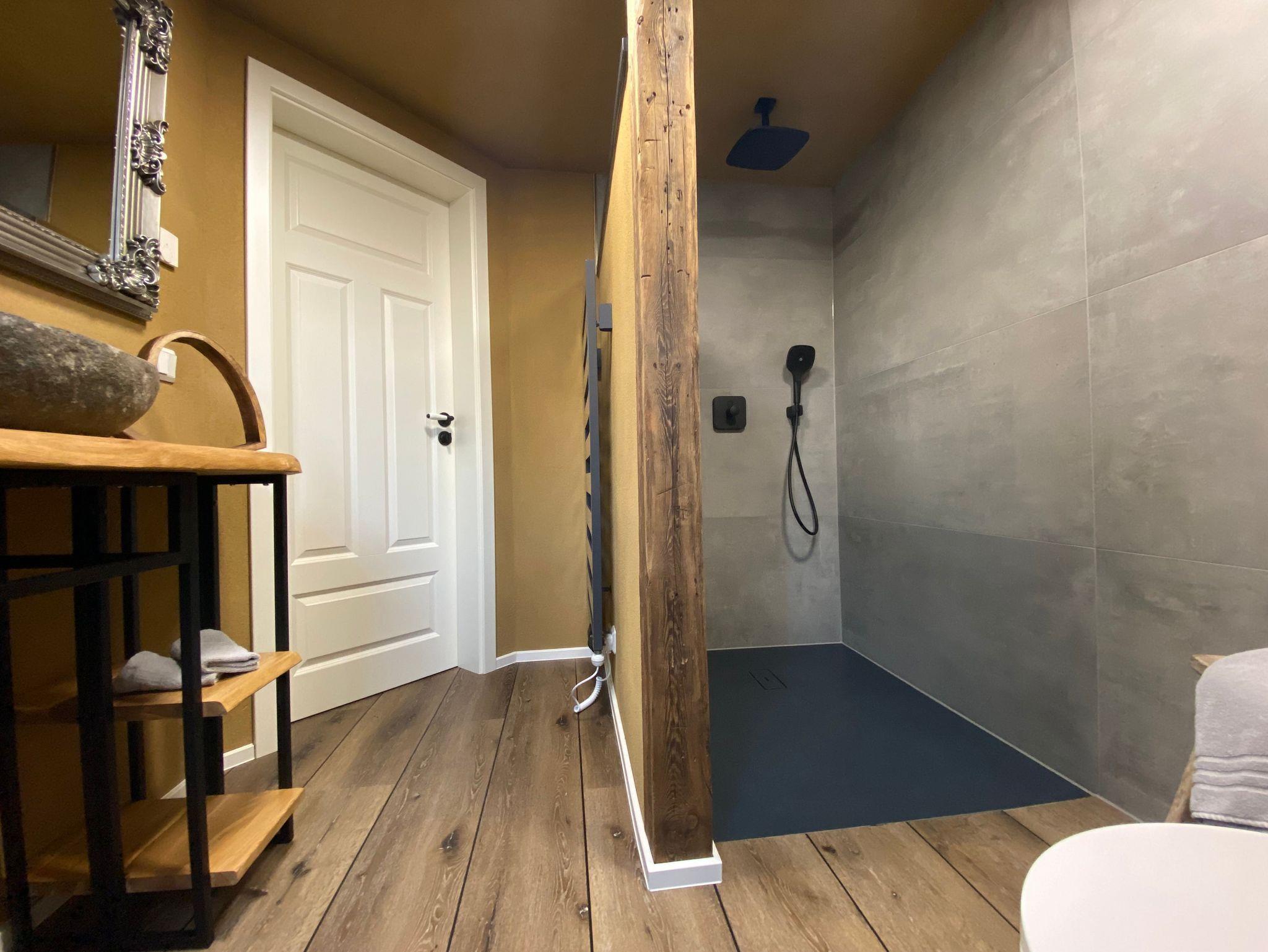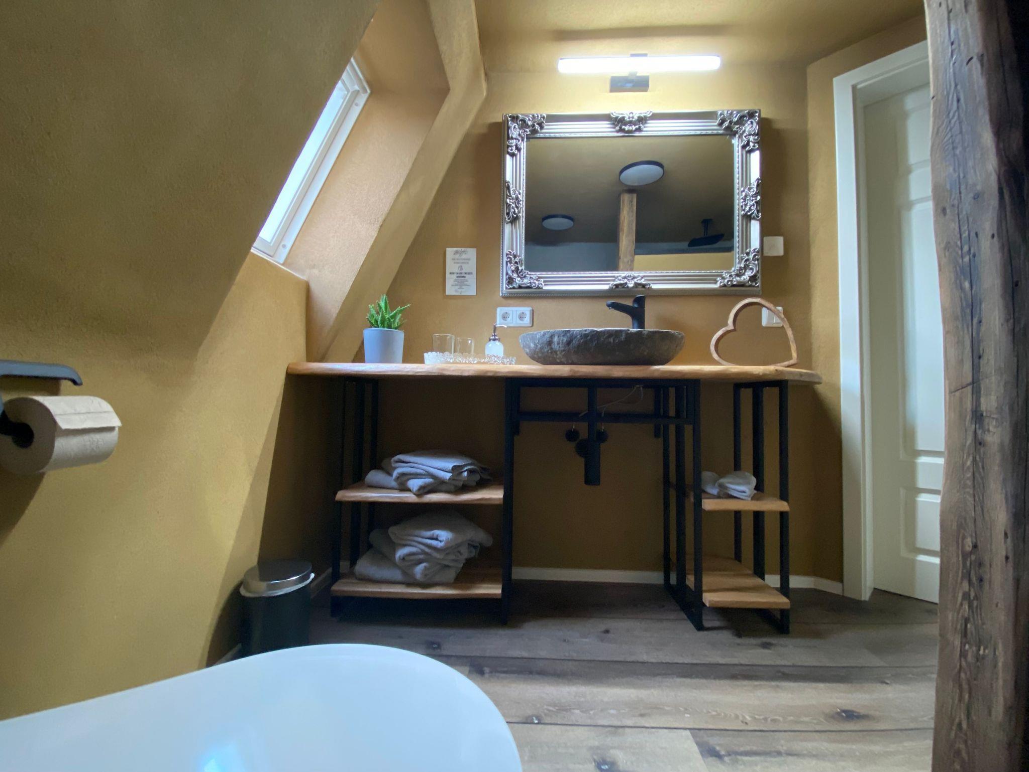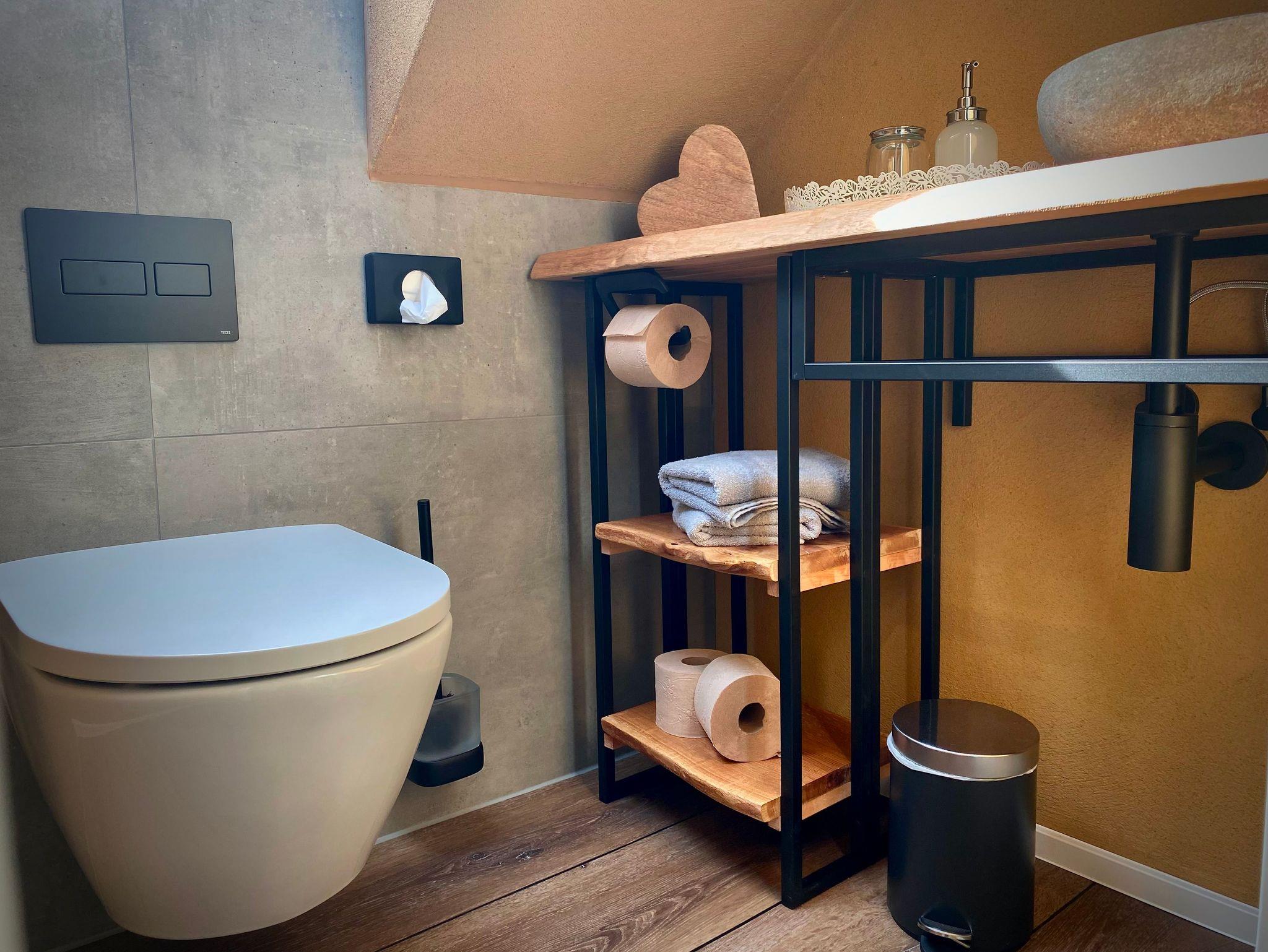 Ein einzigartiges Badezimmer unter der Dachschräge; mit Fenster, bequemer Dusche, WC und einem rustikalen Waschtisch; sorgt für den entspannten Start in den Tag und einen gemütlichen Auftakt in den Abend..