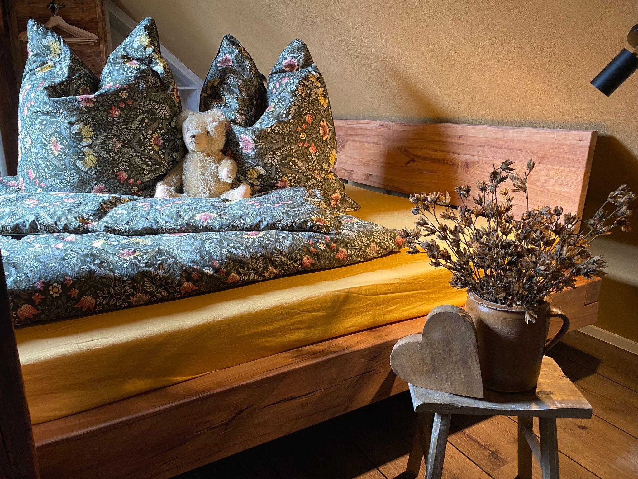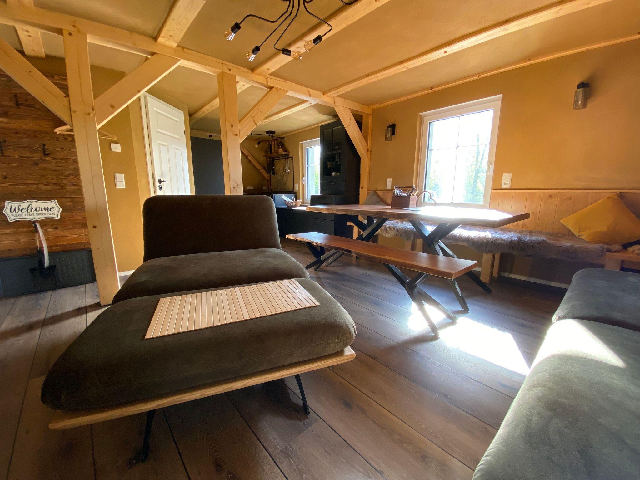 Der urige Wohnraum hält hier eine Couch mit Schlaffunktion ( 130 cm x 200 cm) bereit, auf der, auf Extrawunsch und gegen Aufpreis, zwei zusätzliche Gäste übernachten können.