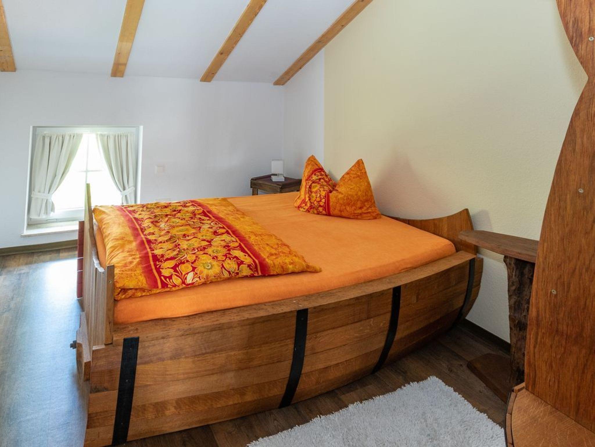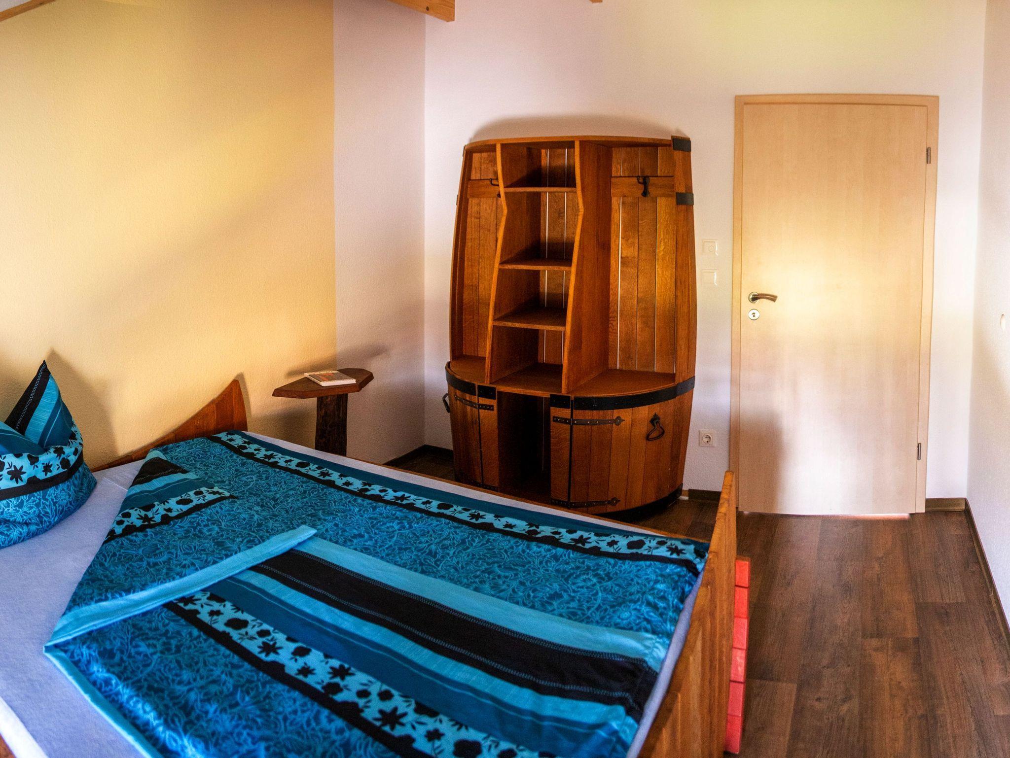 Schlafzimmer mit „Schlafen mal anders ? im Weinfass“, in allen Betten sind hochwertige Matrazen und die Doppel-Betten sind 2,00 m lang und 1,80 m breit; Kleiderschrank