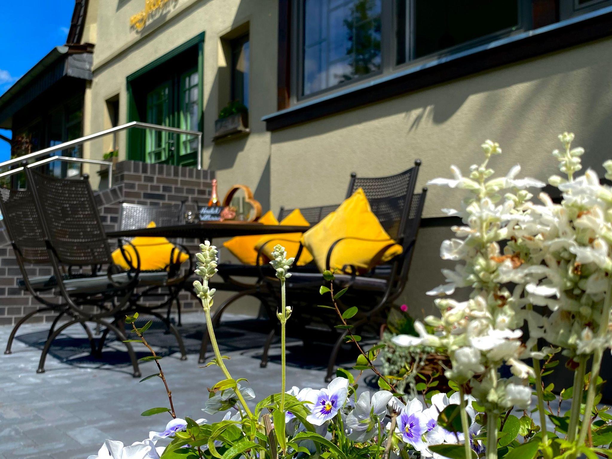Am Fuße der Außentreppe befindet sich die Terrasse dieser Wohnung, mit Sitzmöglichkeiten und nettem Ausblick ein schönes Plätzchen für erholsame Stunden.