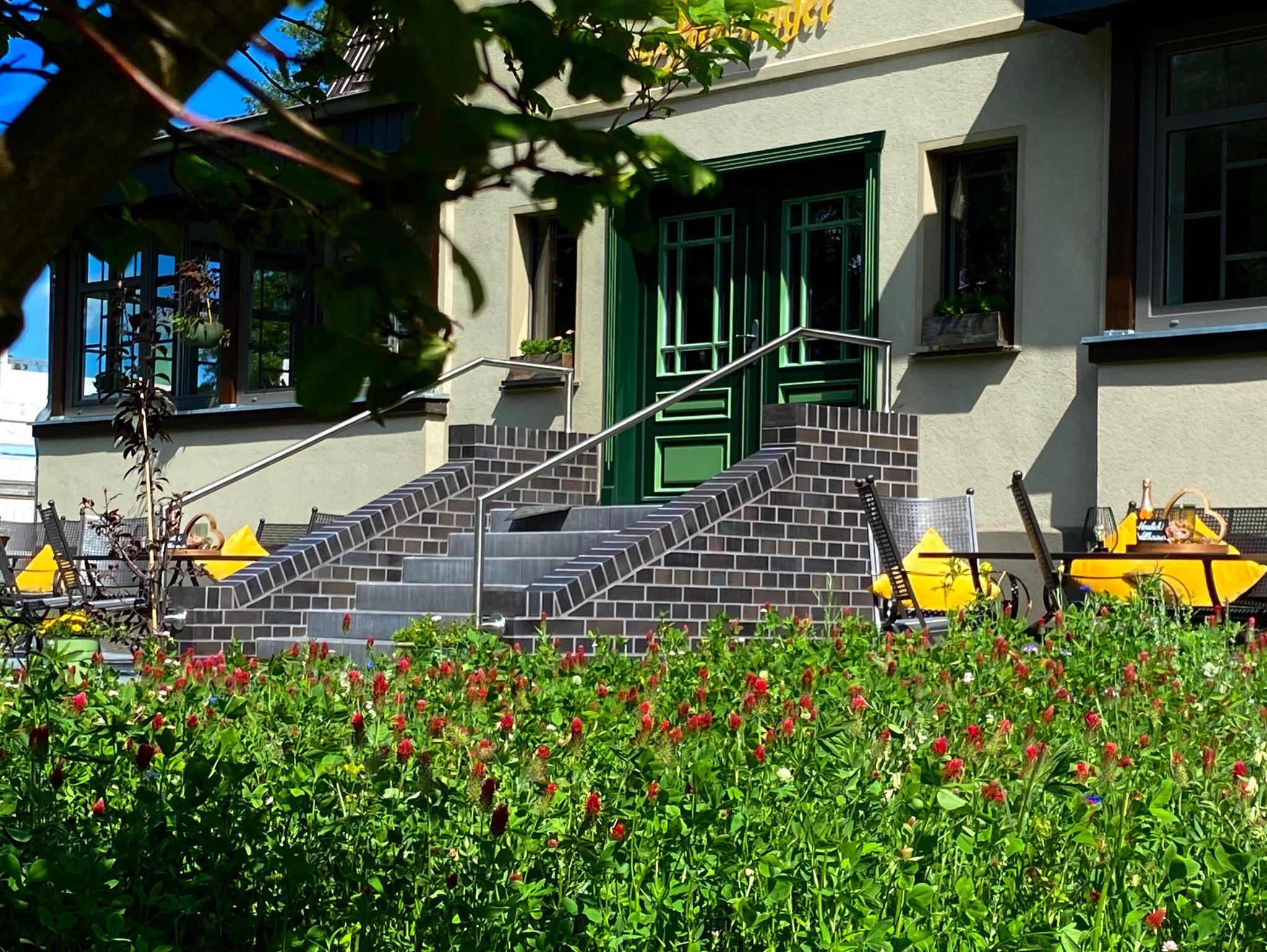 Auf der überdachten Außenreppe mit gemütlicher Sitzecke am oberen Ende ist der separate, großflächig verglaste Eingang zu erreichen, der somit von innen einen herrlichen Ausblick auf die angrenzende Wiese garantiert.