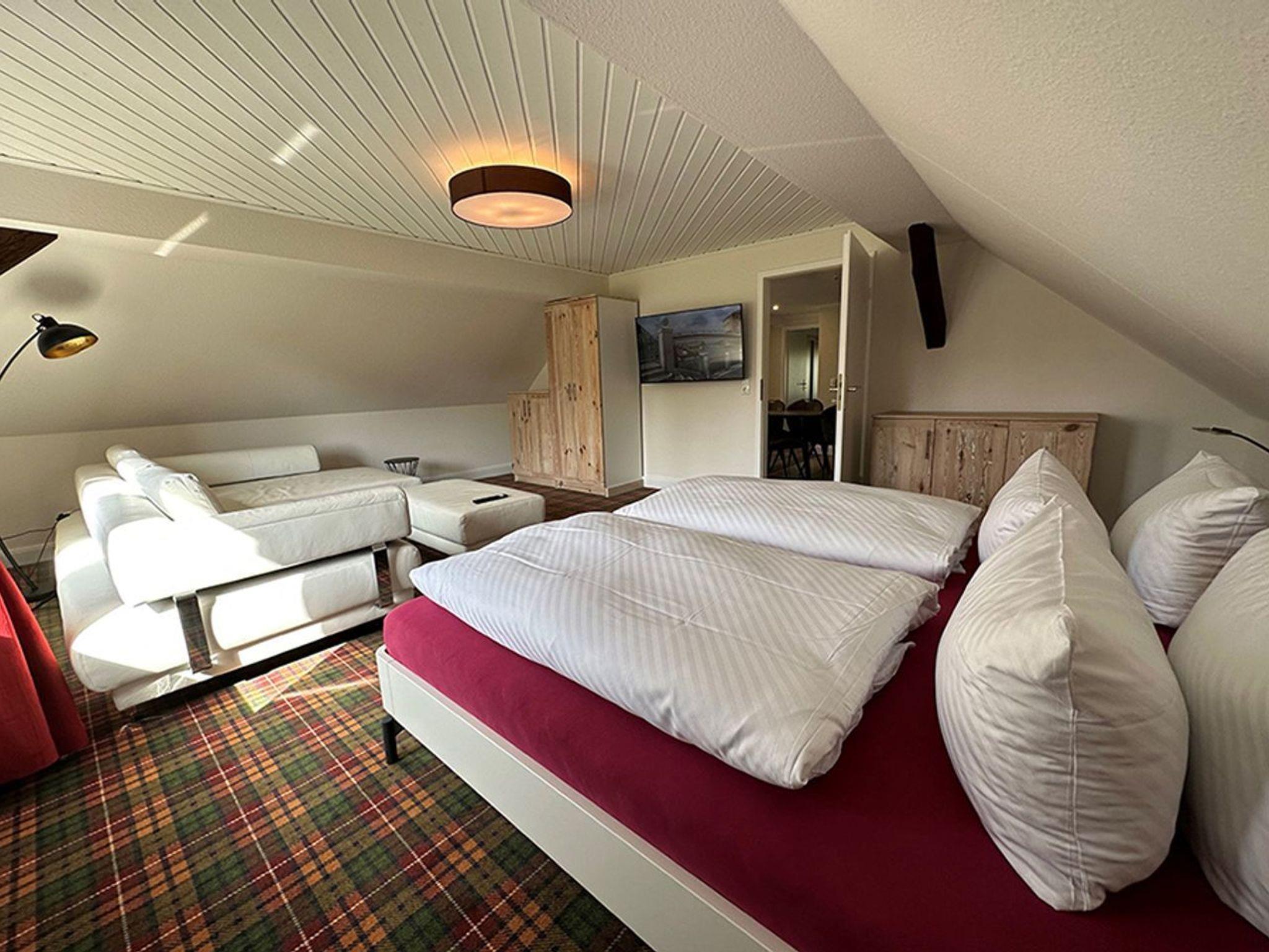 Die Ferienwohnung Gerd befindet sich im Dachgeschoß. Sie verfügt über zwei Schlafzimmer mit je einem Doppelbett und einer offenen Wohnküche mit Kamin, Bad mit Dusche/WC.