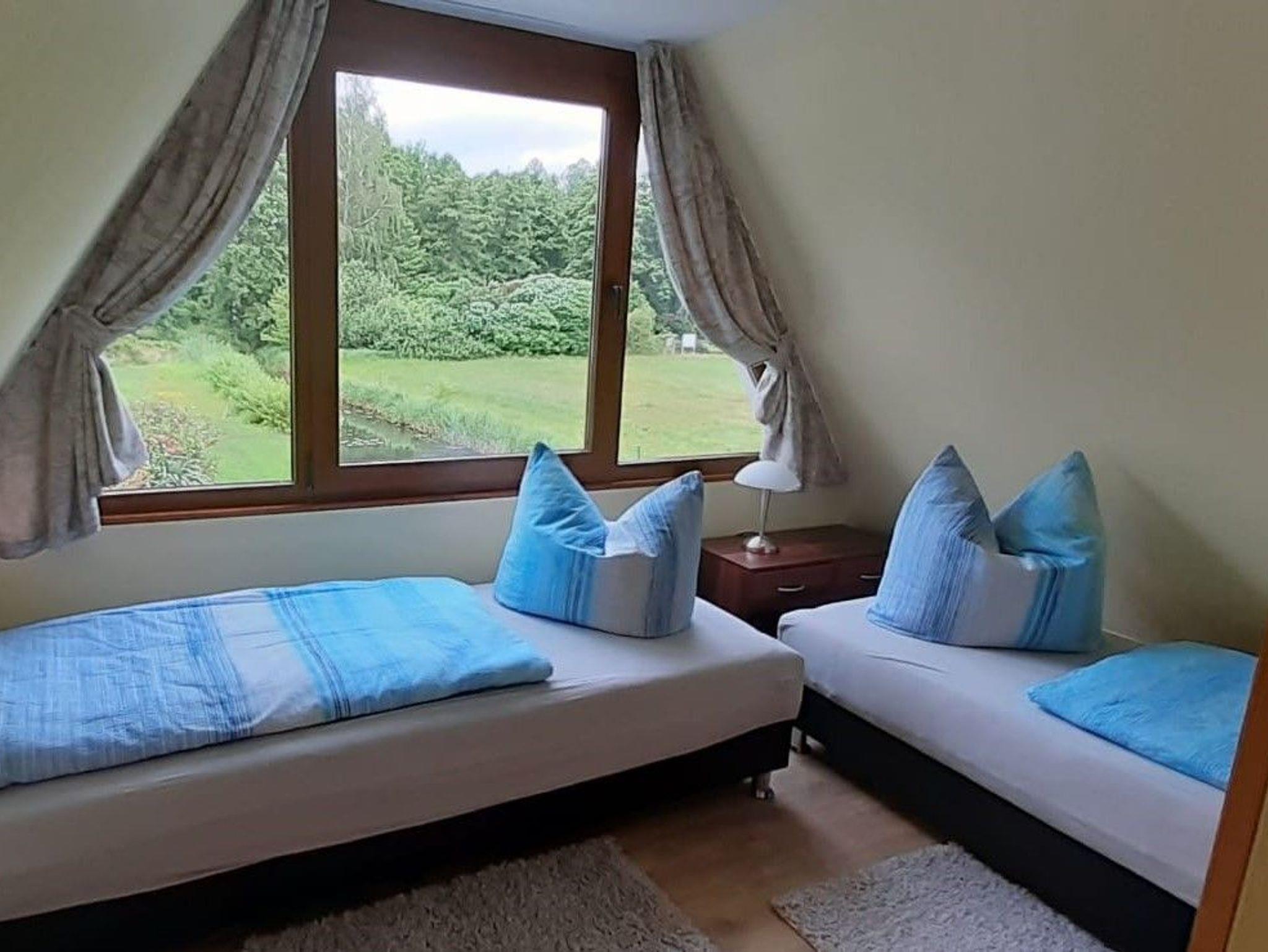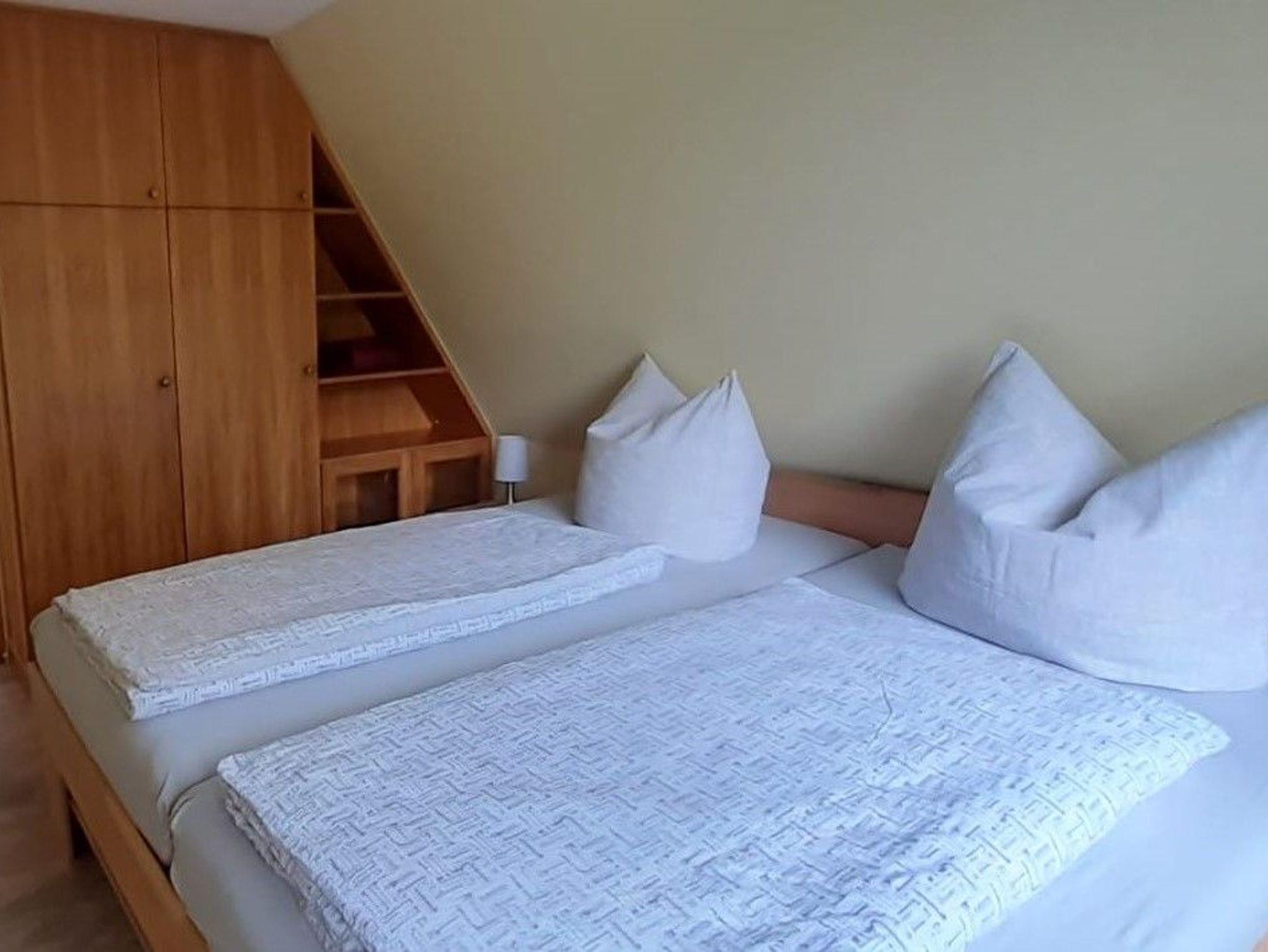 Im Obergeschoss befinden sich die Schlafzimmer. Ein Raum ist mit einem Doppelbett, der zweite mit zwei Einzelbetten eingerichtet. Die Einzelbetten können leicht zu einem Doppelbett zusammengestellt werden.
