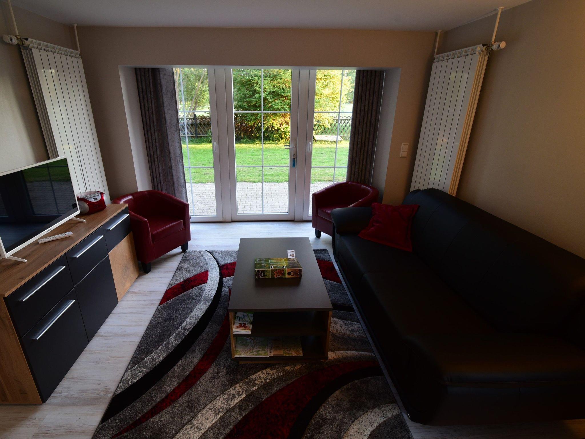 Der Wohnbereich ist mit einer Couch und zwei Sesseln sowie einer Fernsehecke und einem Radio ausgerüstet.