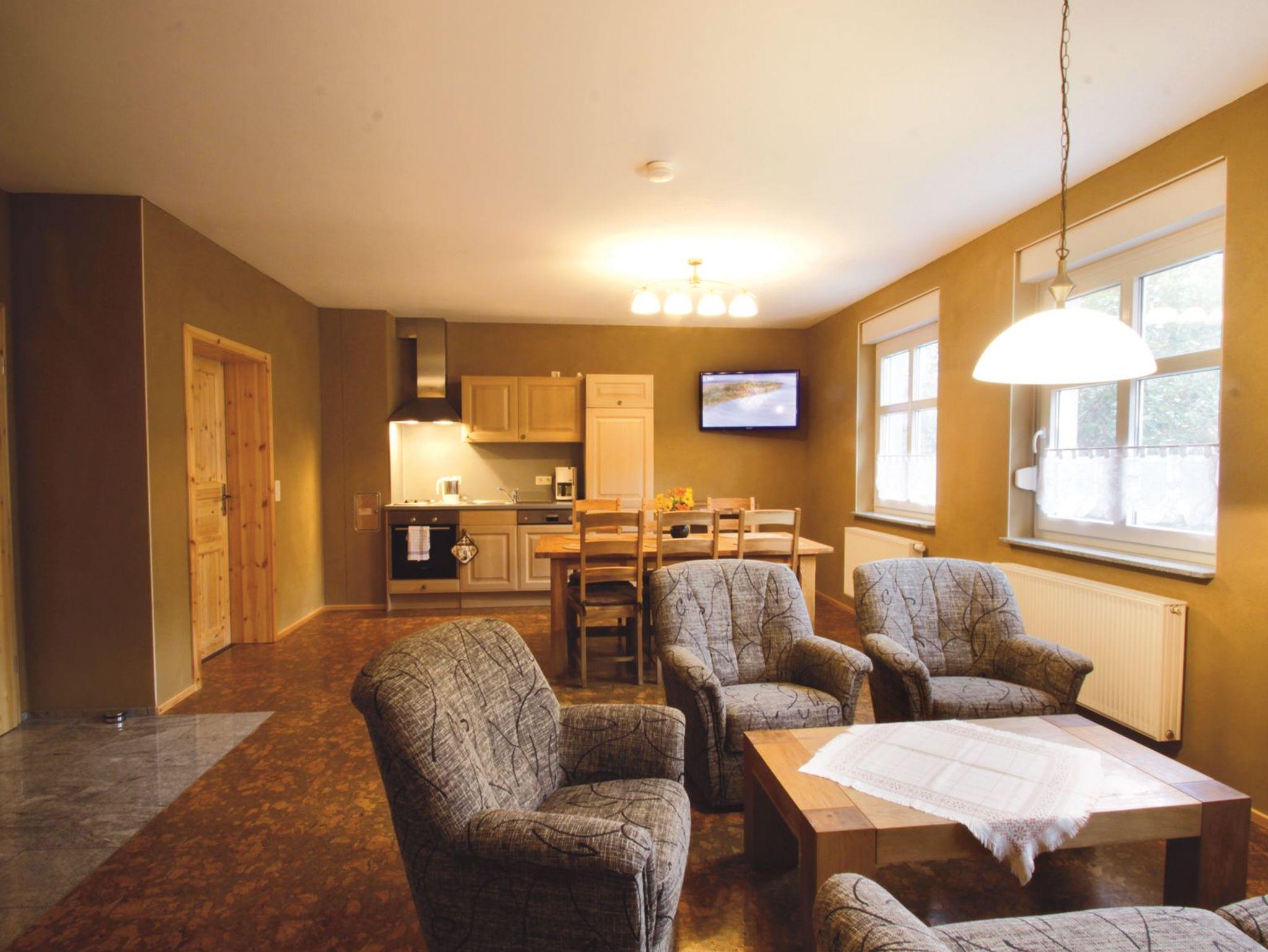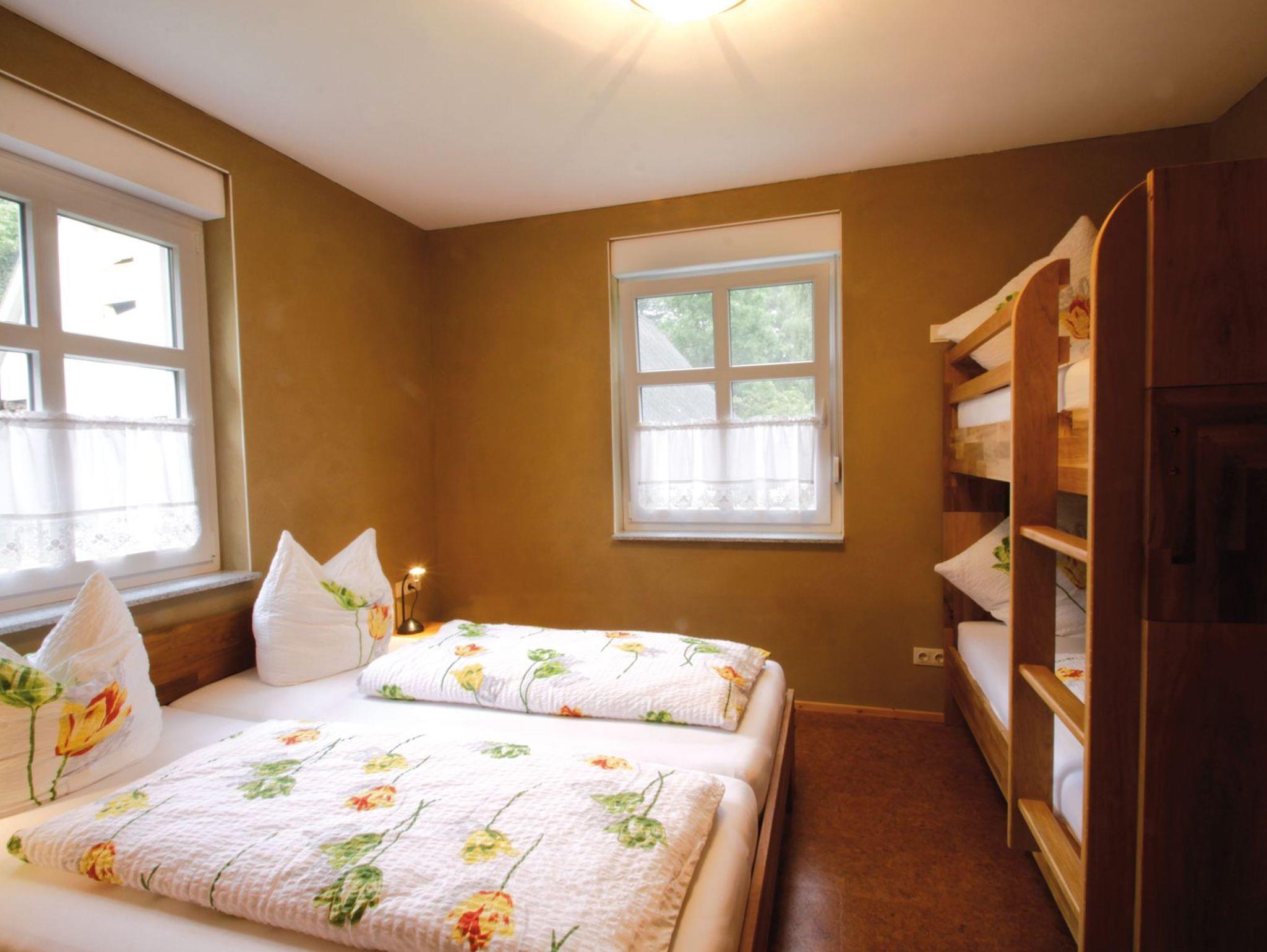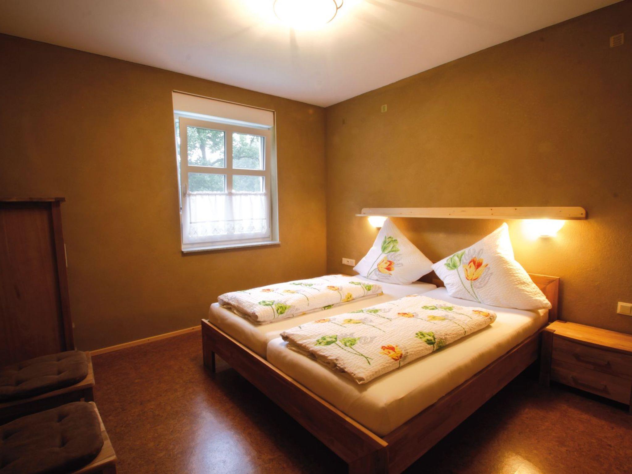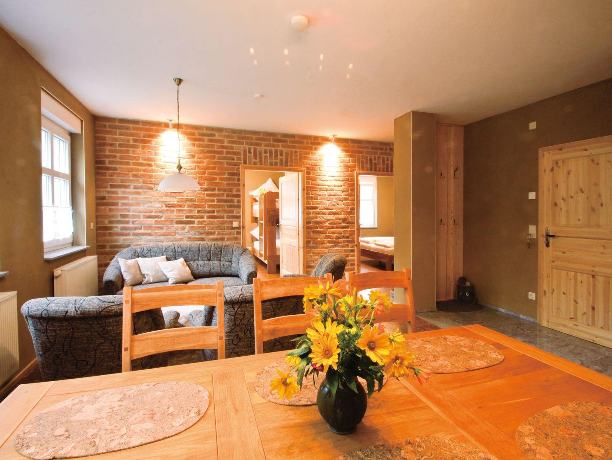 Große Ferienwohnung im EG im Ferienhaus Backhaus. Die Ferienwohnung verfügt über einen großen Wohnraum mit Küchenzeile, zwei Schlafräumen (eins mit Doppelbett, eins mit Doppelbett und Etagenbett) und einem Bad mit DU/WC. Die Ferienwohnung ist mit Lehmputz und Korkfußböden gut für Allergiker geeignet.
