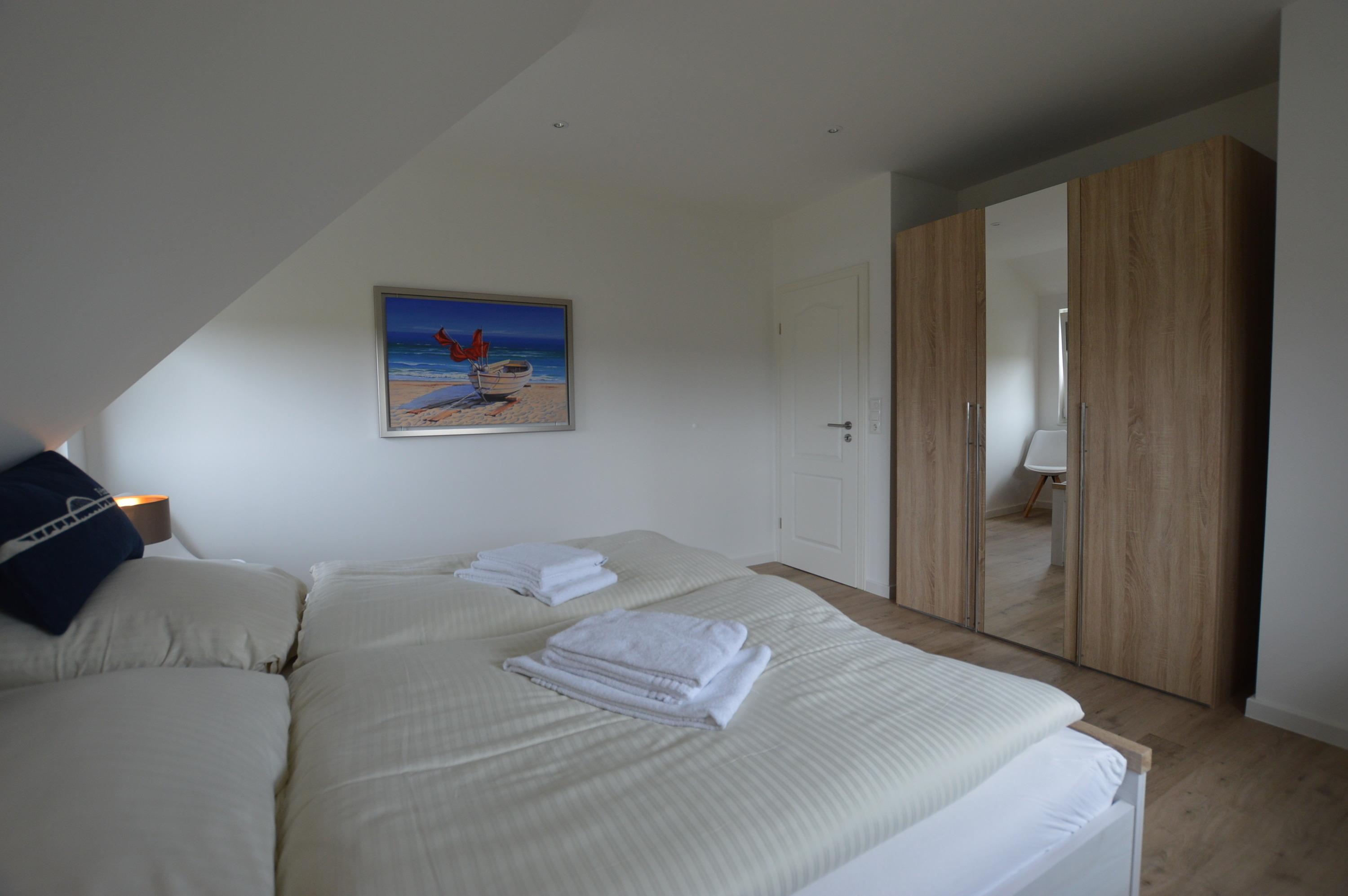 Im Obergeschoss befinden sich die zwei Schlafzimmer mit Doppelbetten, sowie ein kleines Zimmer für ein Gitterbett.