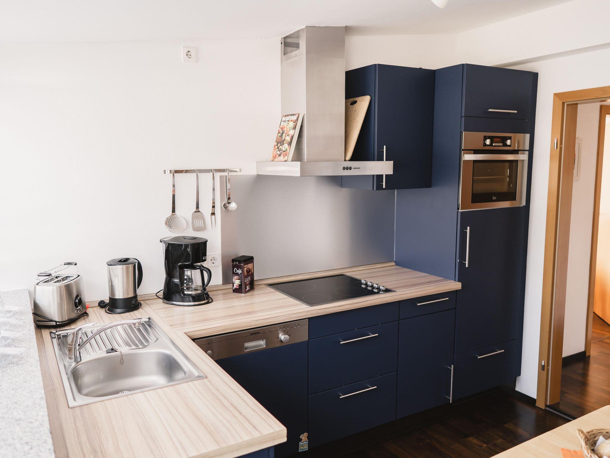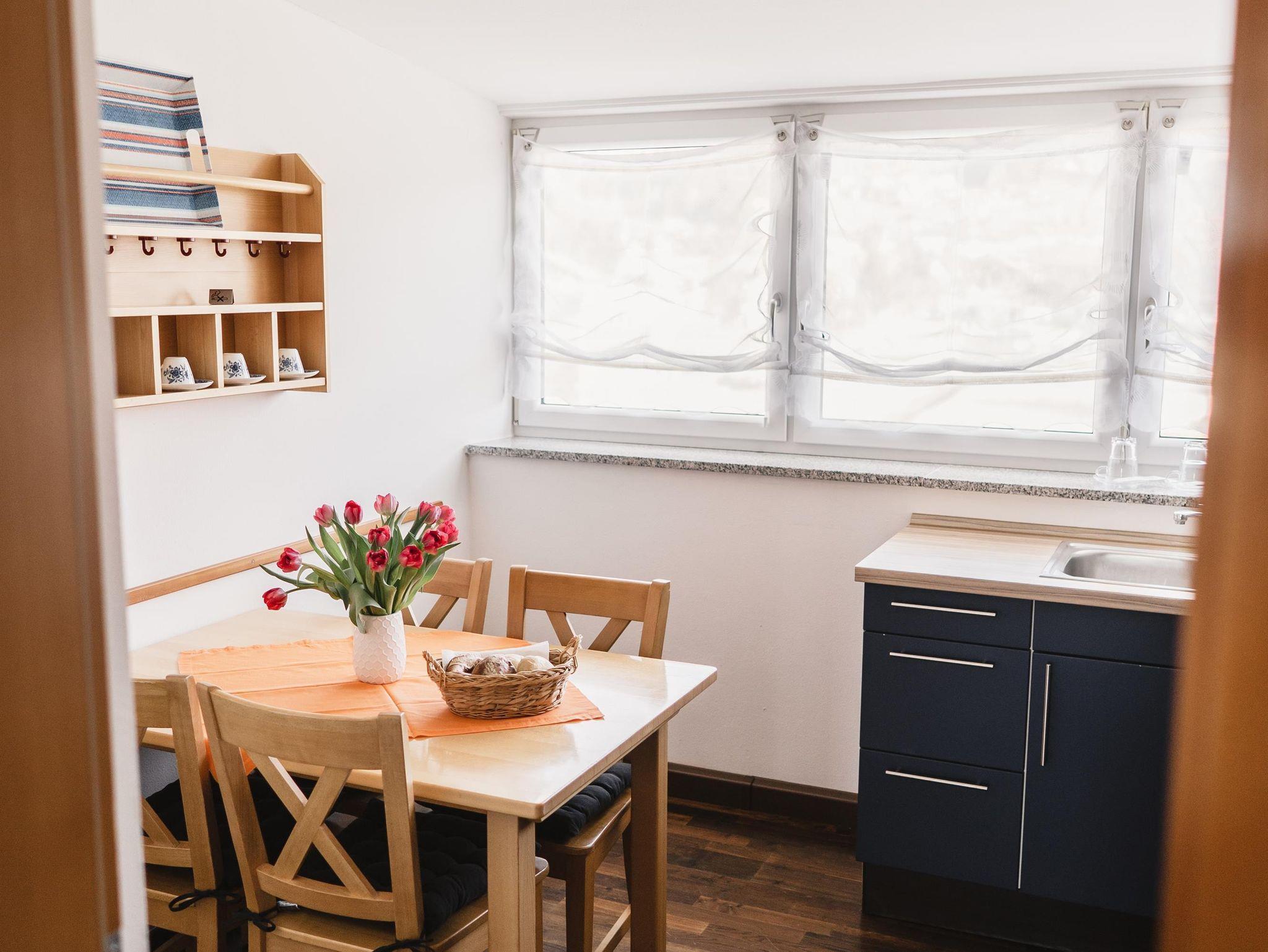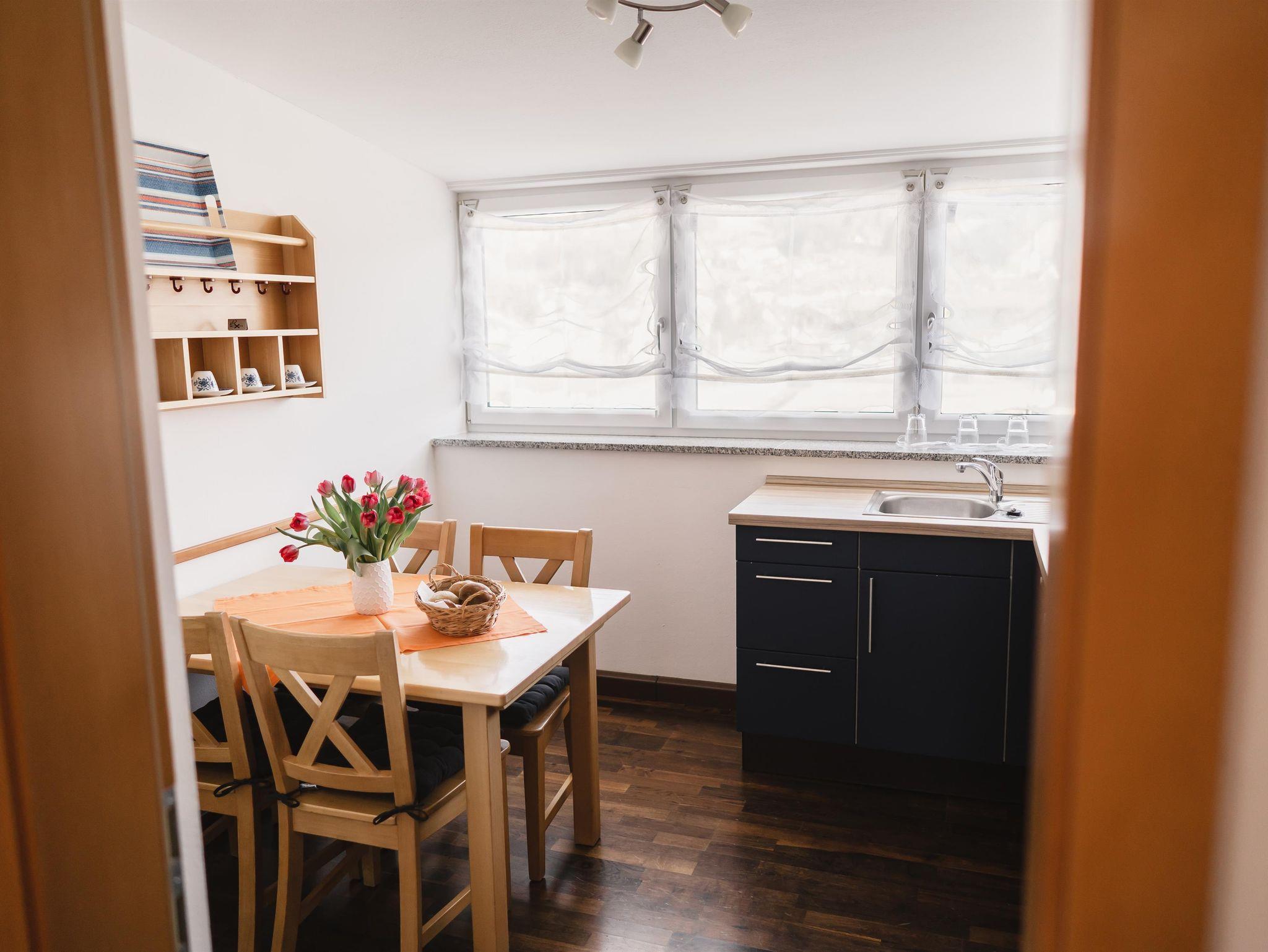 Die große Wohnküche mit Esstisch ist mit allem ausgestattet was man braucht: u.a. Cerankochfeld, Kühlschrank, Backofen, Spülmaschine, Wasserkocher, Kaffeemaschine, Geschirr und Reinigungszubehör.