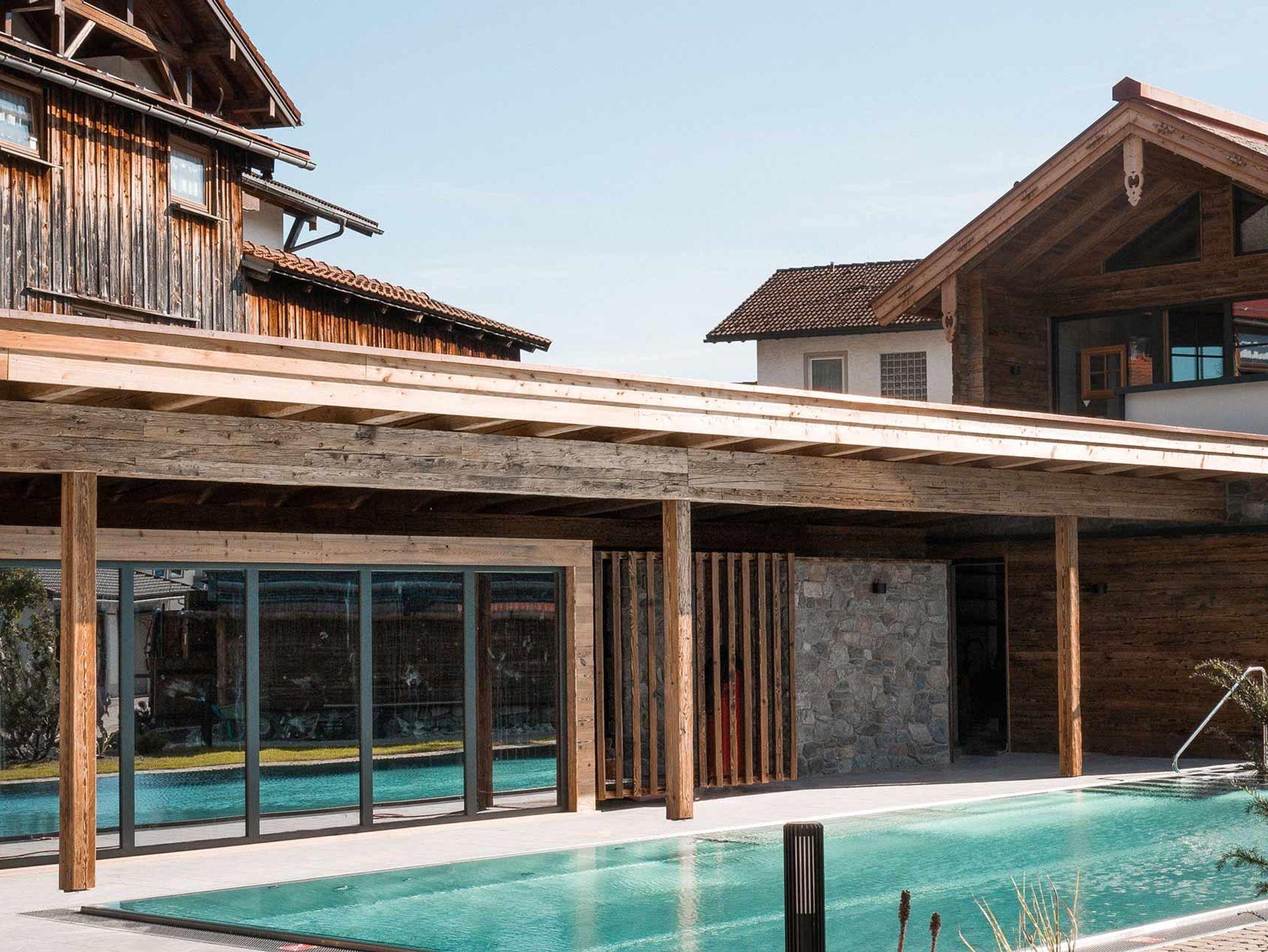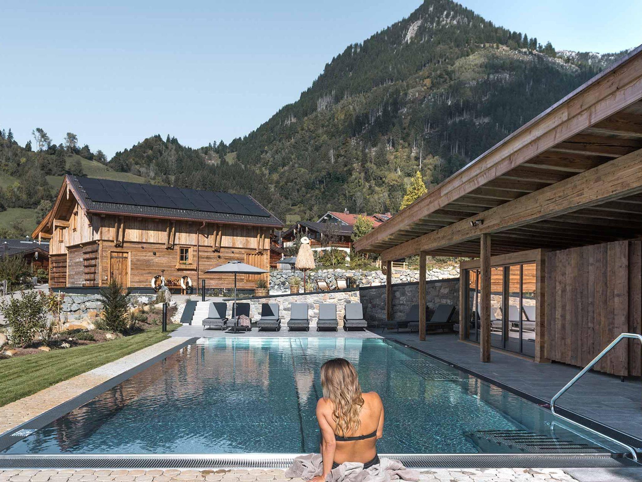 Alle neuen Chalets mit Alpzitt-Besonderheiten und eigenem Whirlpool auf der Terrasse – plus Pool, Naturbadesee & neues Spa-Gebäude.