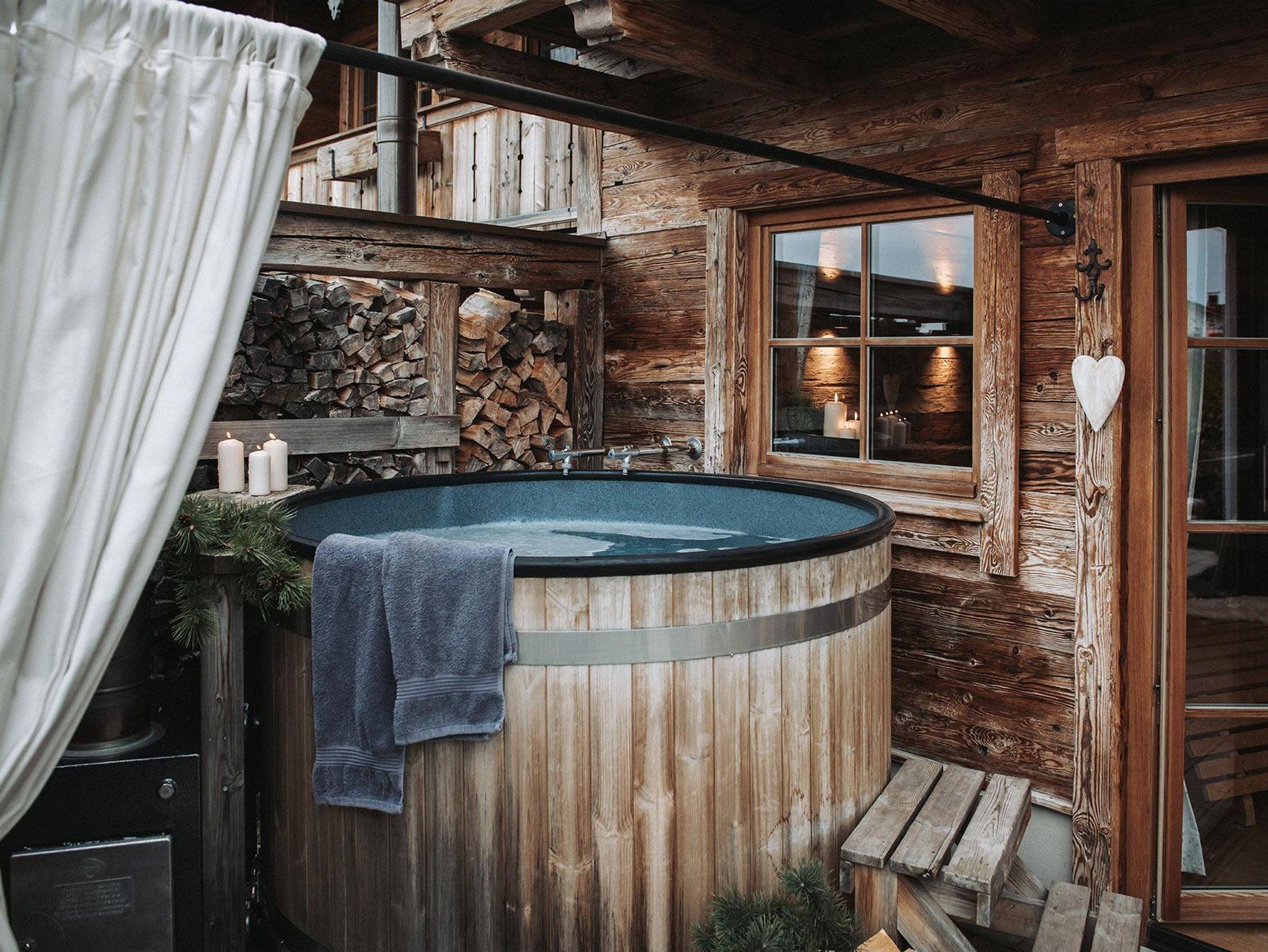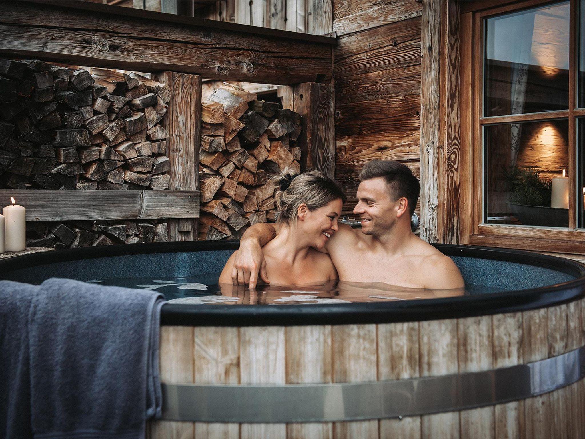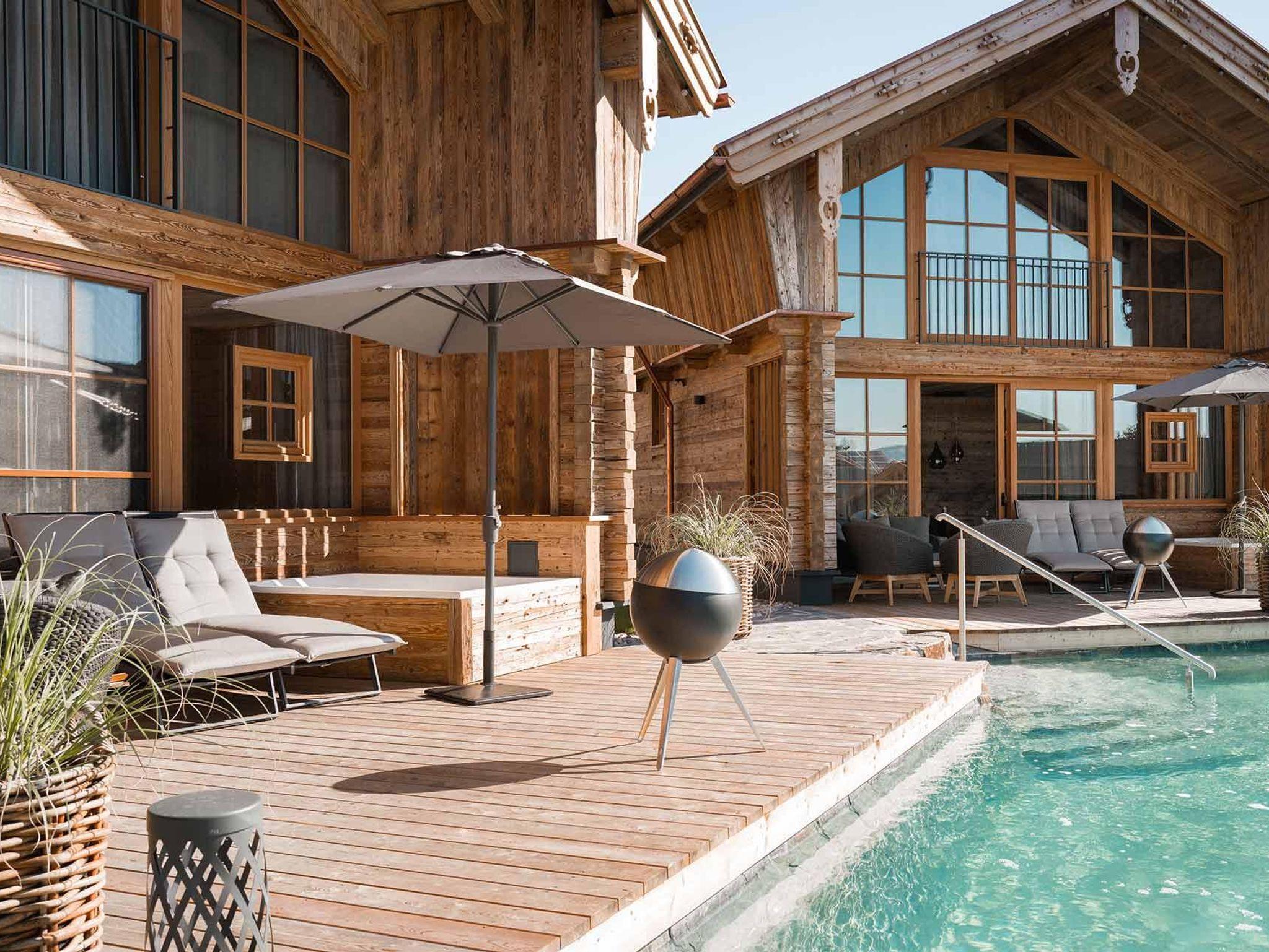Alle neuen Chalets mit Alpzitt-Besonderheiten und eigenem Whirlpool auf der Terrasse – plus Pool, Naturbadesee & neues Spa-Gebäude.