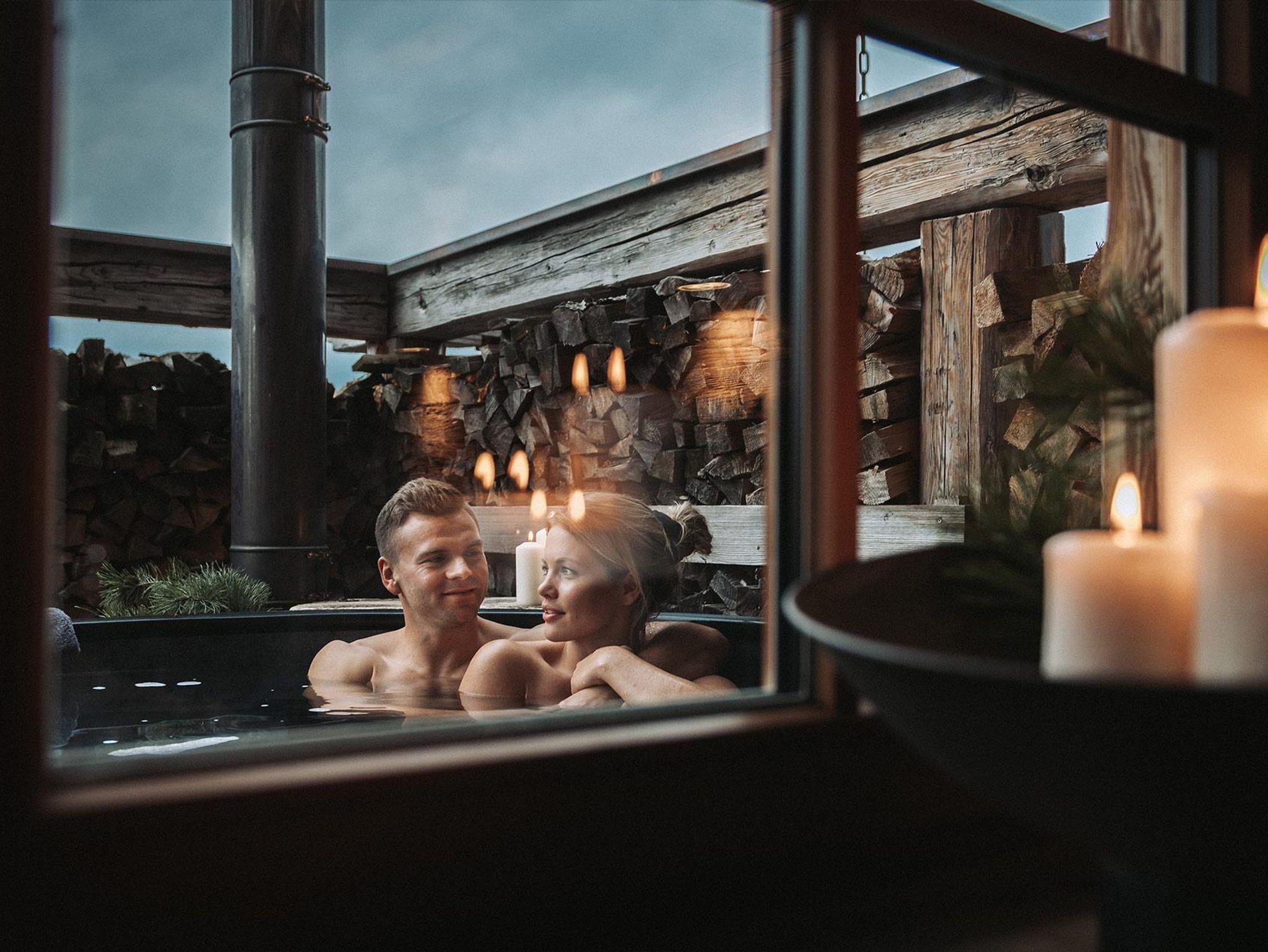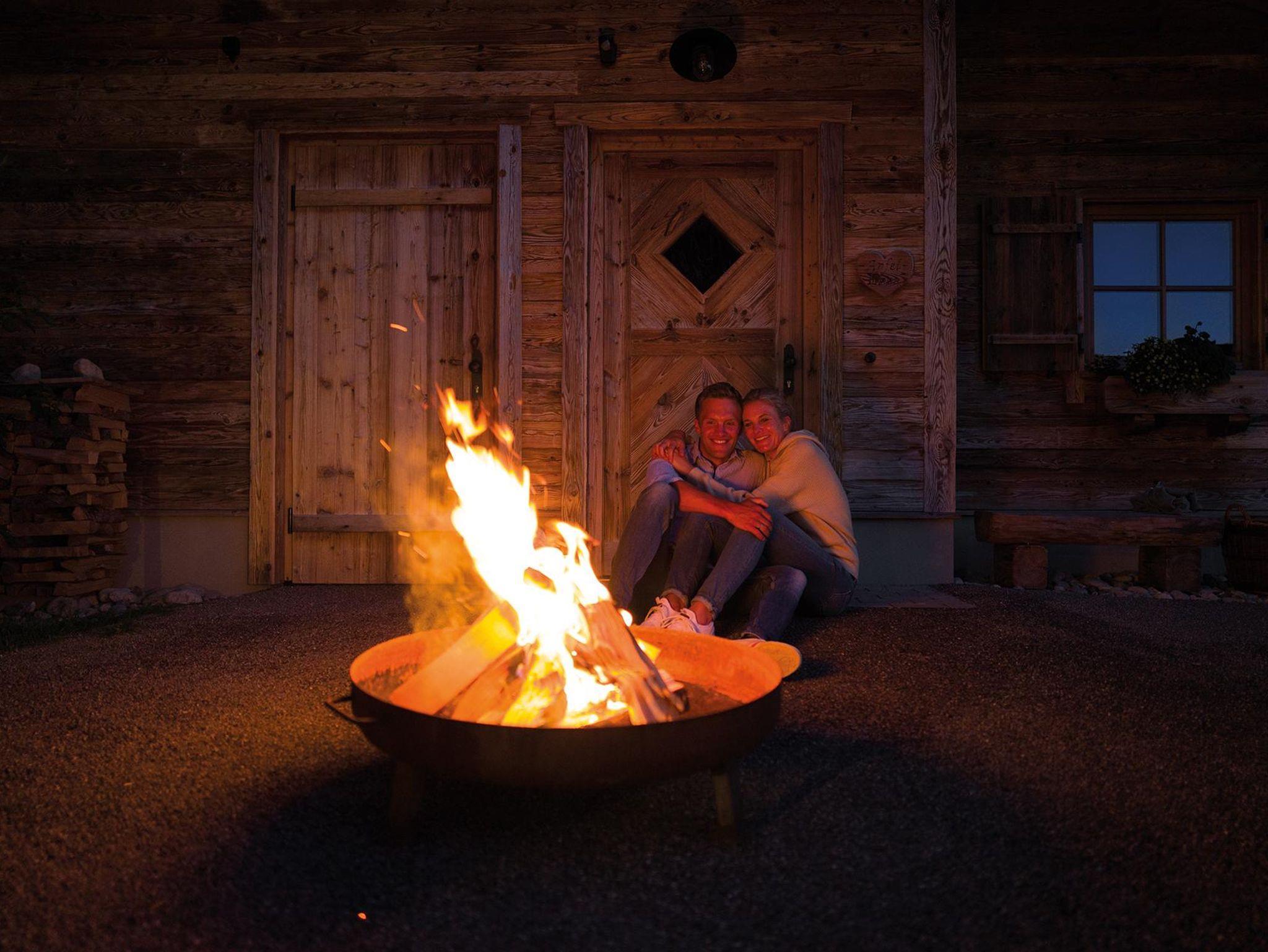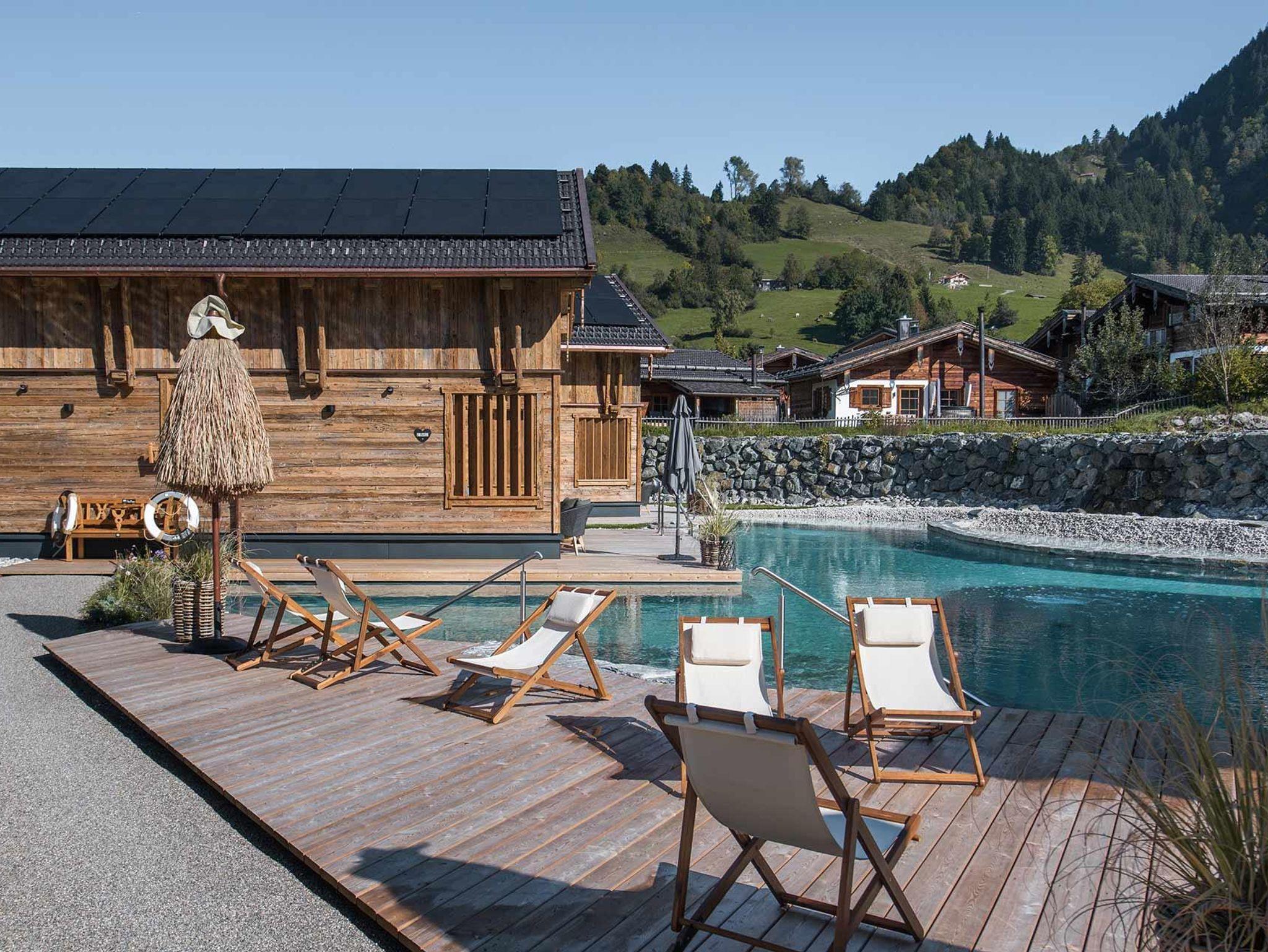 Alle neuen Chalets mit Alpzitt-Besonderheiten und eigenem Whirlpool auf der Terrasse – plus Pool, Naturbadesee & neues Spa-Gebäude.