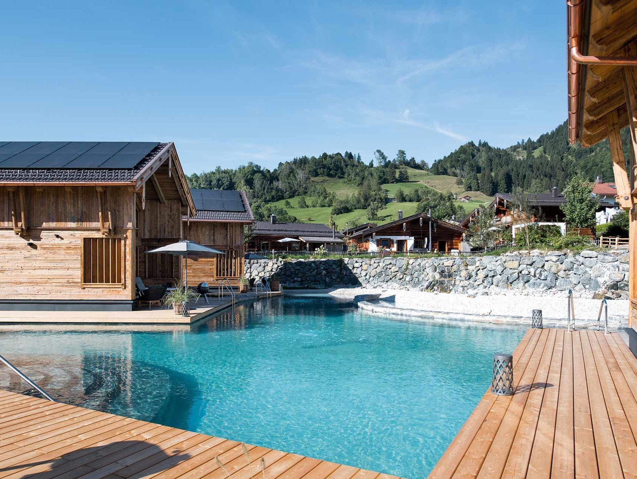 Alle neuen Chalets mit Alpzitt-Besonderheiten und eigenem Whirlpool auf der Terrasse – plus Pool, Naturbadesee & neues Spa-Gebäude.