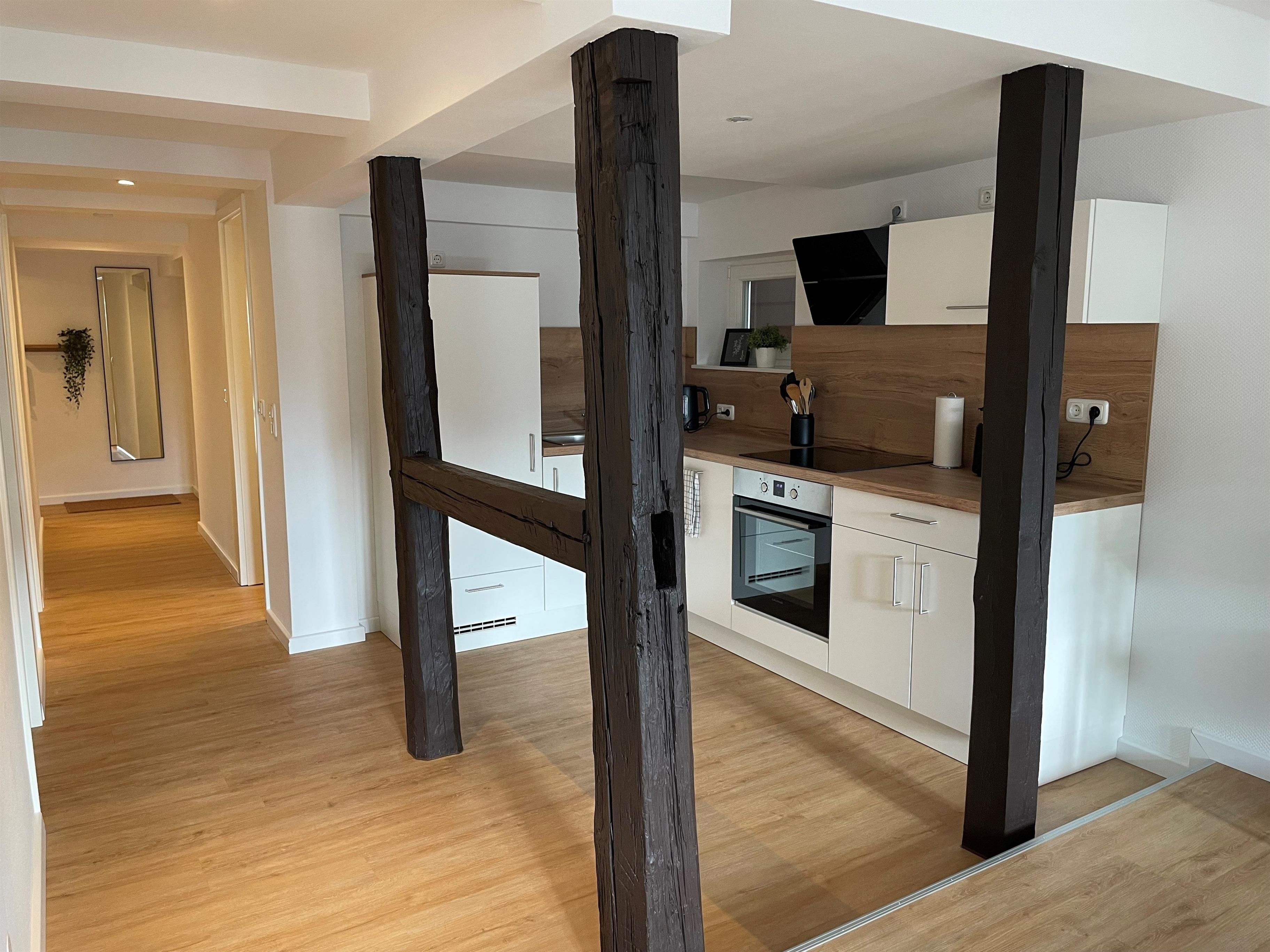 Das Herzstück der Wohnung bildet der großzügige Wohn- und Essbereich mit seinem freistehenden Fachwerk und dem Blick auf die Altstadt. Dieser einladende Raum lädt zum Entspannen und Wohlfühlen ein. Im Wohnbereich steht ein Smart-TV zur Verfügung, und das WLAN kann im gesamten Apartment kostenfrei genutzt werden.