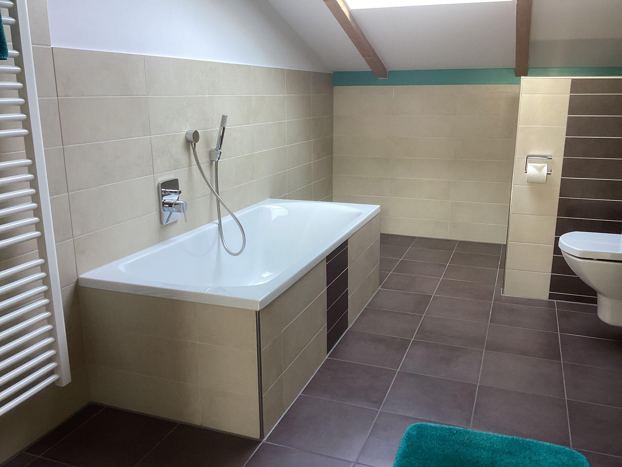 Im großzügigen Bad befindet sich eine Dusche (90/90 cm), eine Badewanne, WC und ein großer Waschtisch für Ihre Pflegeartikel. Ein Handtuchtrockner, ein Kosmetikspiegel und ein Fön gehören selbstverständlich zur Grundausstattung.