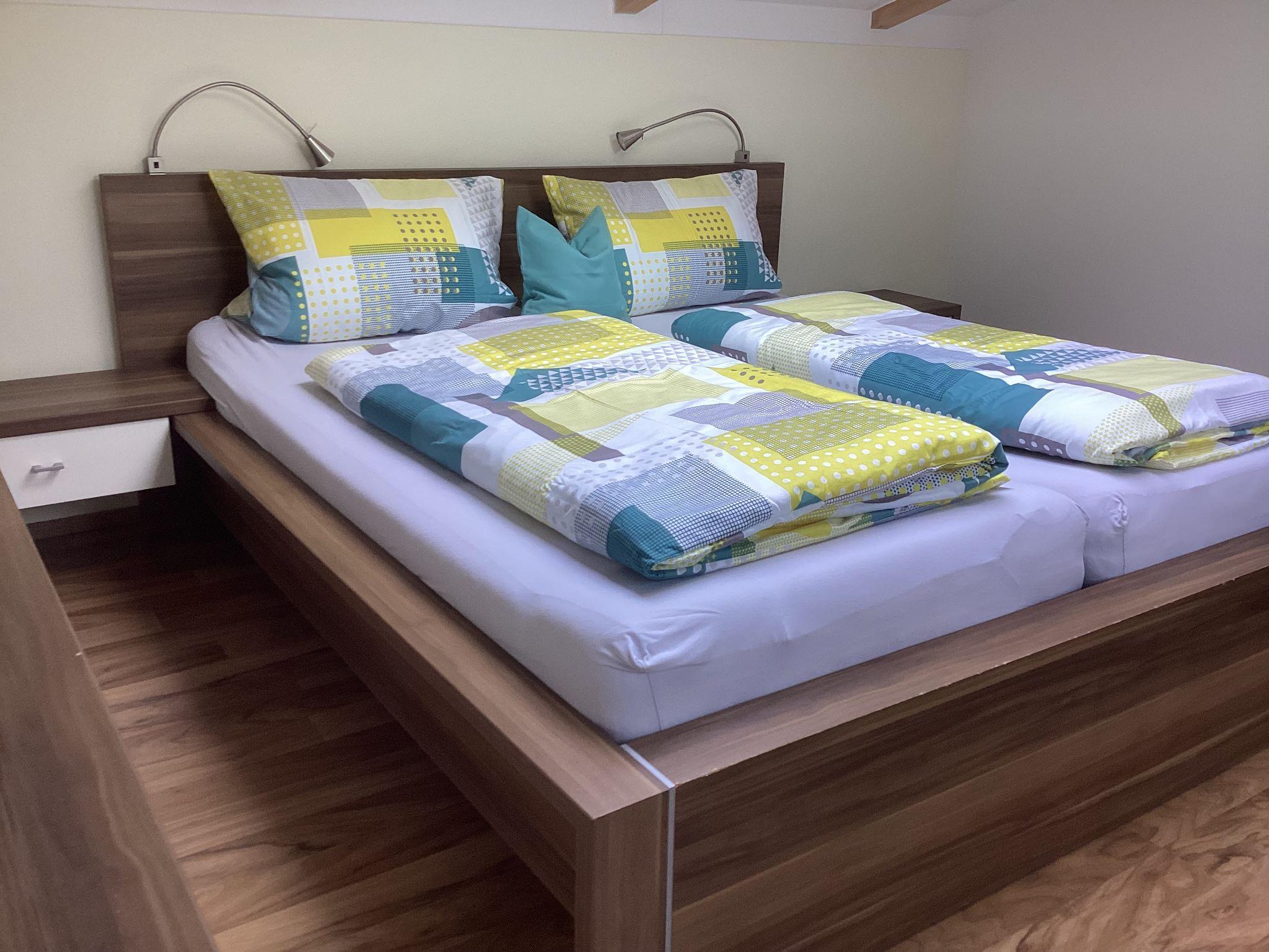 Das abgeschlossene Schlafzimmer verfügt über ein Doppelbett (190/190 cm) mit offenen Fußende sowei beidseitig angebrachte Leselampen über den Bett. Der Schrank bietet ausreichend Stauraum für Ihre Garderobe.
