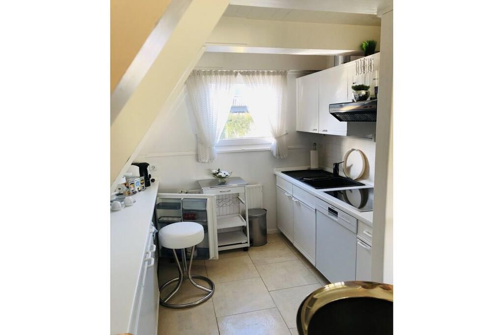 Ground floor: (hallway(Mirror, Wardrobe Coatrack), Kitchen(Spices, Kitchenette, hob, electric kettle, toaster, coffee machine, dishwasher, fridge), Living/diningroom(Armchair, Sofa, TV, dining table, DVD player, radio), bedroom(Sofa, double bed, insect screens), bathroom(Make Up Mirror, Mirror, toilet, shower, washbasin, hairdryer)) On the 1st floor: (bedroom(Armchair, Wardrobe, double bed, radio, insect screens)) Hot Water, Internet Access DSL, Vacuum Cleaner, Internet access, heating, terrace(Lawn, grill, garden furniture, awning), garden(Lawn)