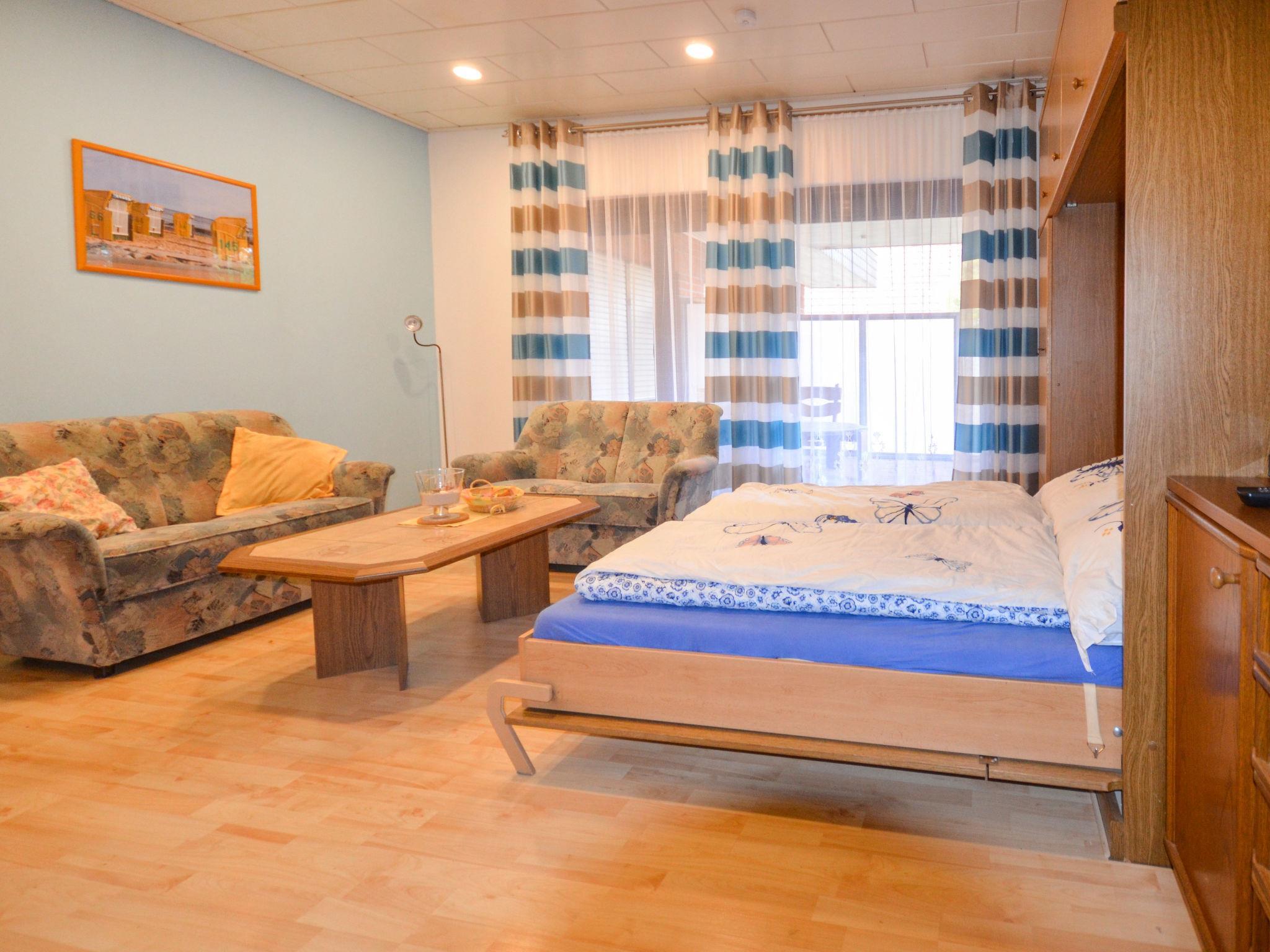 1-room apartment 30 m2, on the ground floor. Simple and practical furnishings: living/sleeping room with 1 double wall-trunk bed, satellite TV, radio and CD-player. Kitchenette (oven, microwave, electric coffee machine). Shower/WC. Small terrace. Please note: non-smokers only. Smoke alarm. Pets allowed on request (20€/stay).