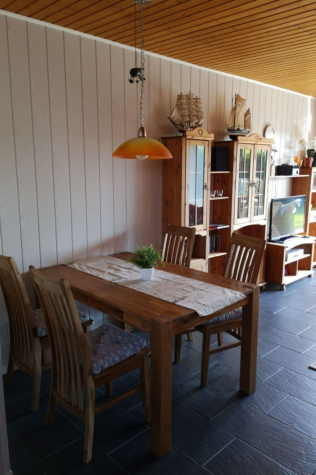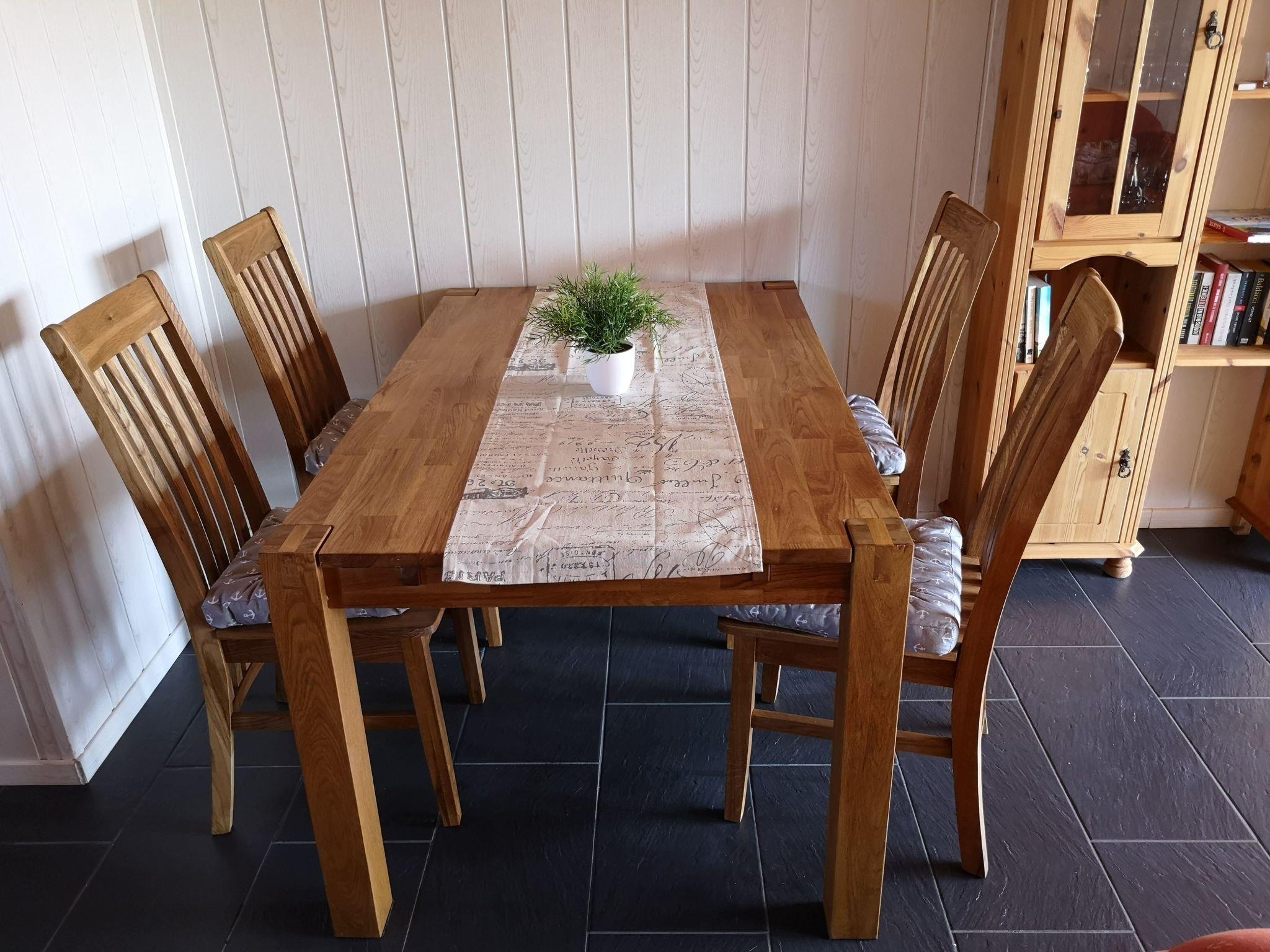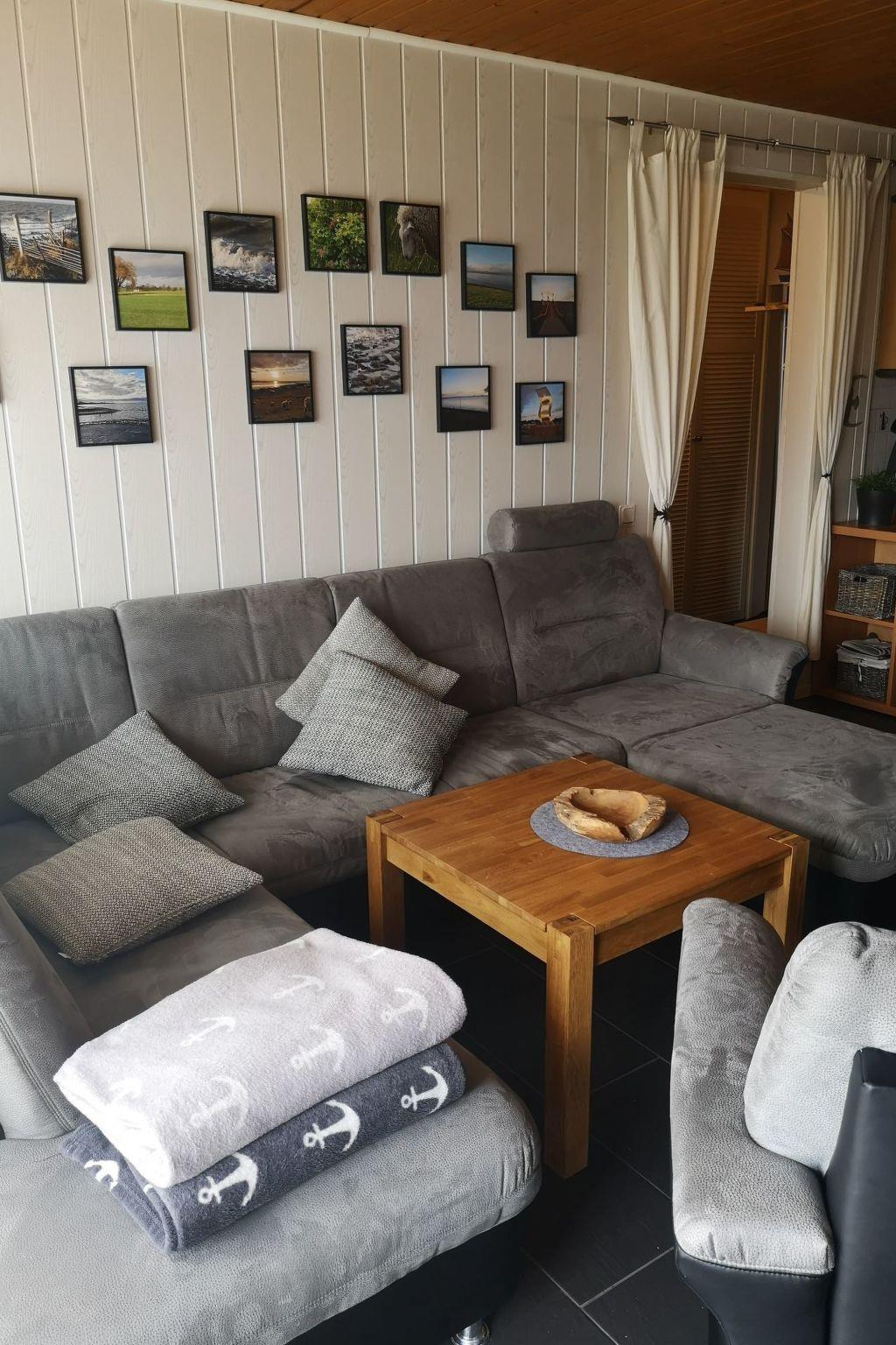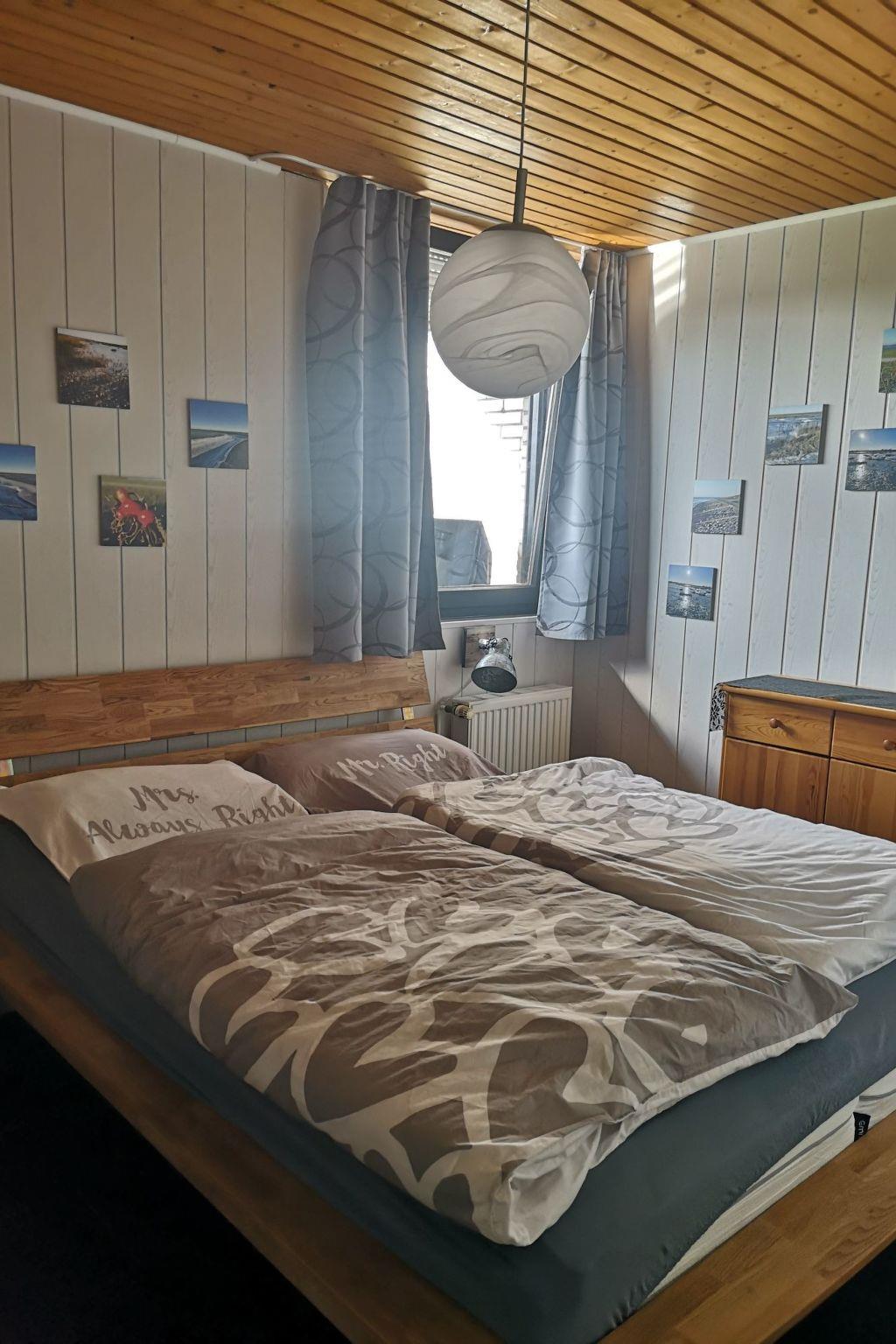 It is a well-equipped holiday bungalow that offers 4 people a cosy North Sea stay. It has a living/dining area with fitted kitchen, a bedroom with double bed (1.60 x 2m with continuous topper), a bedroom with 2 single beds one behind the other (0.80m x 1.80m), a bathroom with shower and WC and a small storage room. There is 1 satellite TV (living room), hi-fi system with CD, Bluetooth and USB, washing machine, tumble dryer, microwave, oven, ceramic hob, dishwasher, fridge with freezer compartment, coffee machines (Senseo, filter machine), kettle and egg boiler, blender, hairdryer, toaster, ironing board, iron, charcoal grill, board games and books. The house has modern gas heating and is rented out all year round. We also offer our guests free W-LAN.