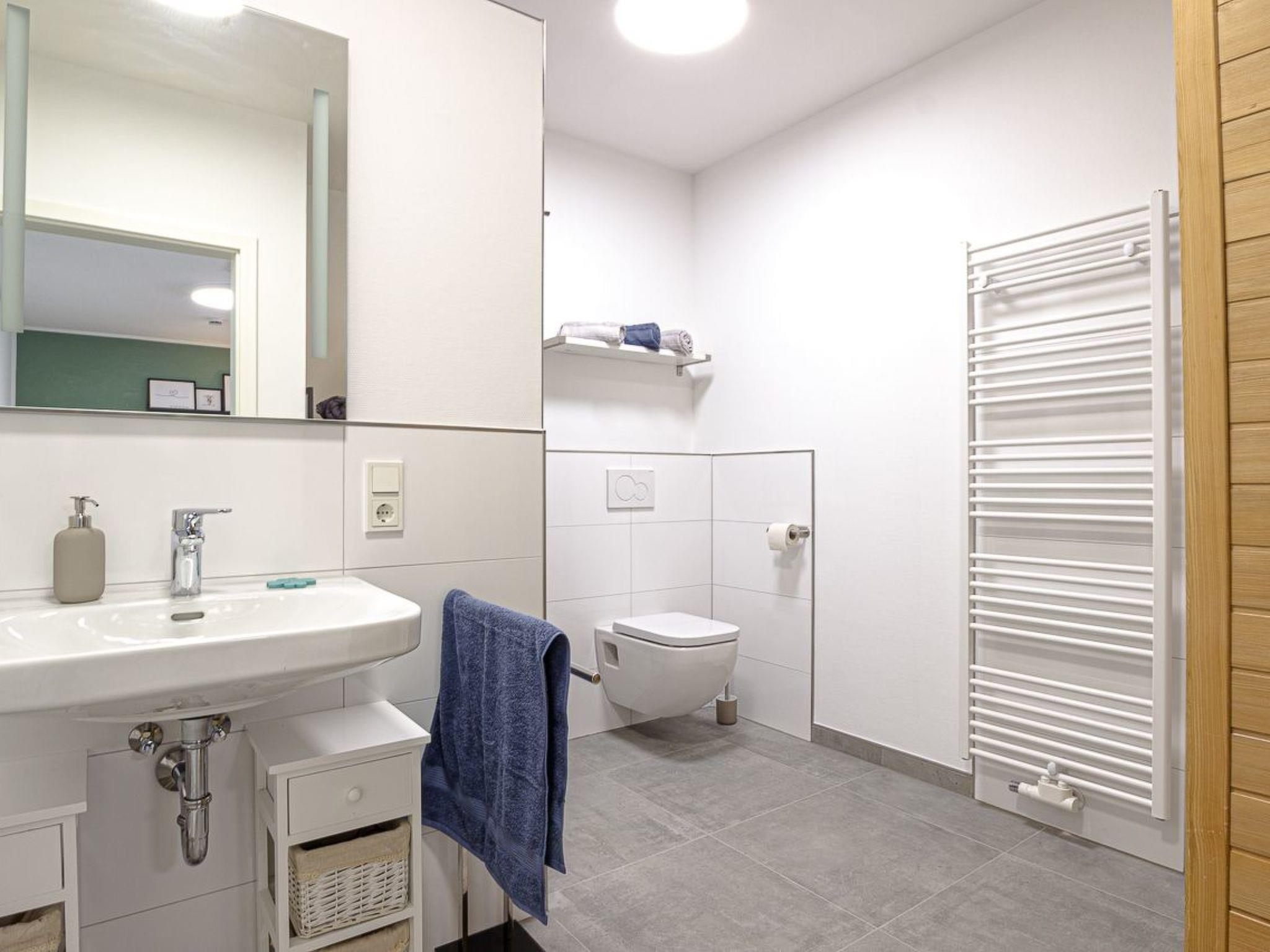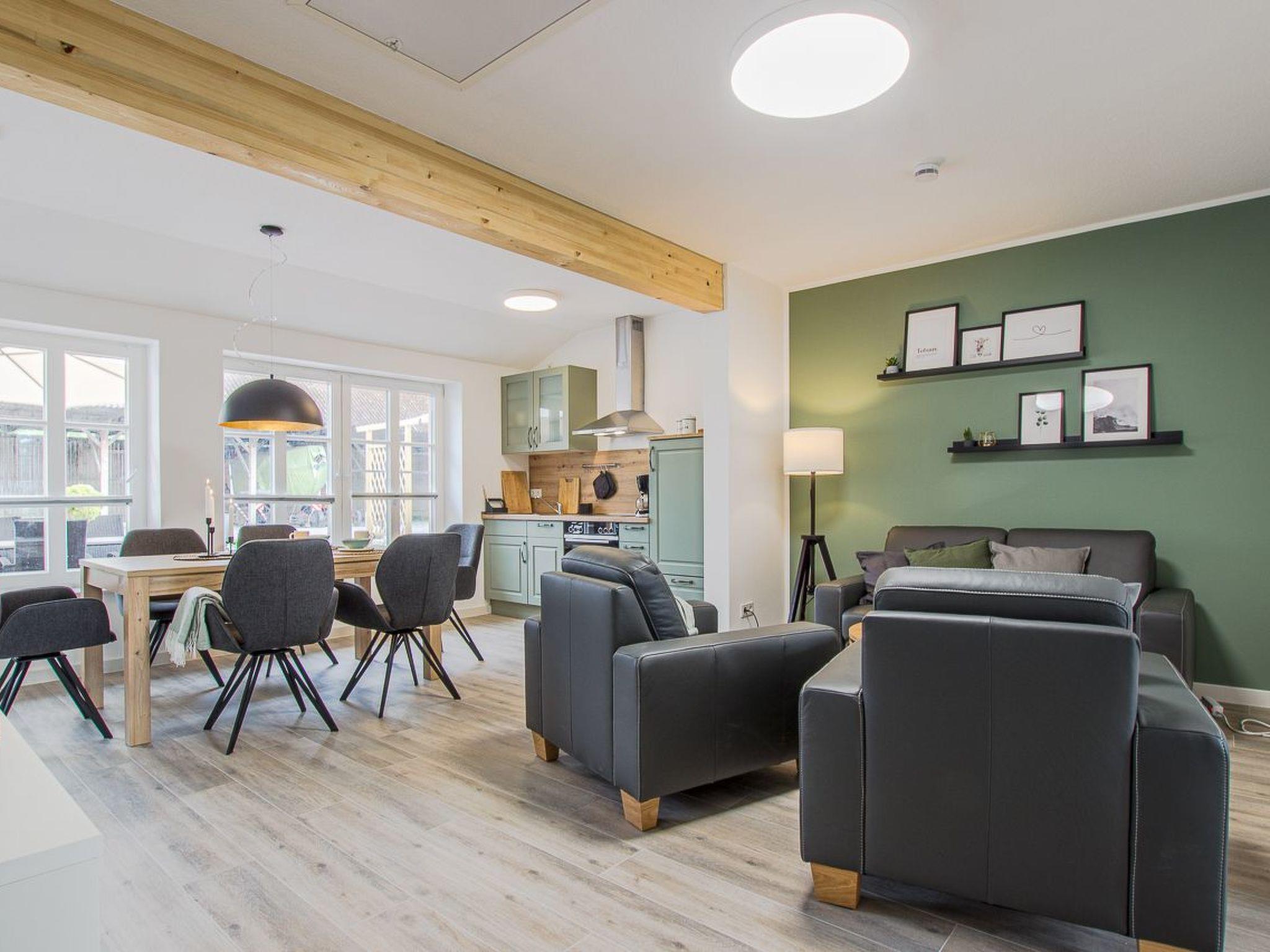 The ground floor, about 70 m² in size, consists of the following rooms: Living room area with a cosy sofa set and flatscreen TV/SAT TV; a bedroom next to it with double bed/box spring bed (1.80 m); a bedroom with 2 single beds - the beds are equipped with high-quality mattresses; a fully equipped kitchen with cooker, oven, dishwasher, microwave on request, toaster, kettle, coffee machine and dining area with 6 chairs, as well as an adjoining bathroom with barrier-free shower and infrared sauna, hairdryer. Bed linen, towels, tea towel, washing-up set are included in the price.
